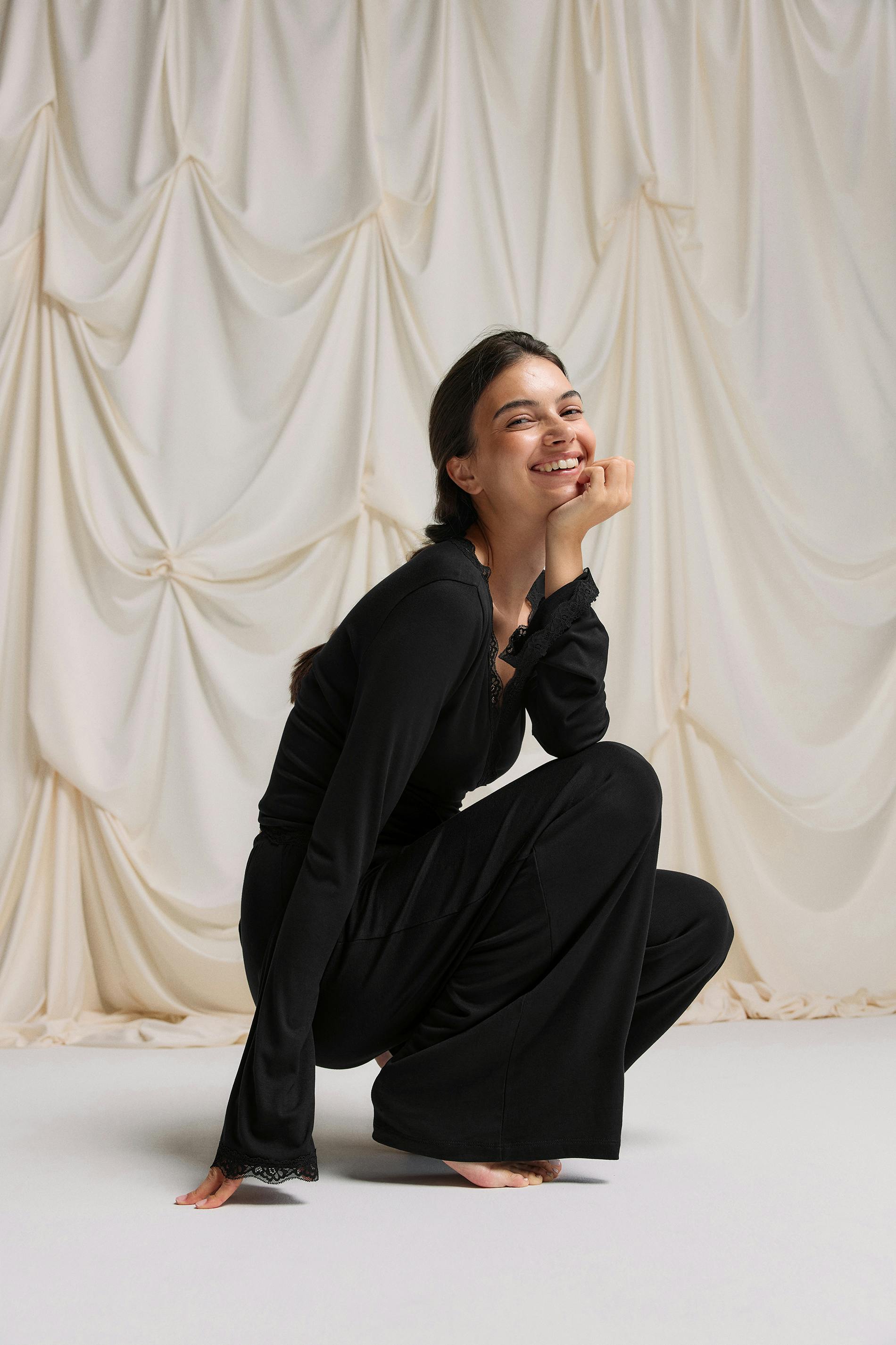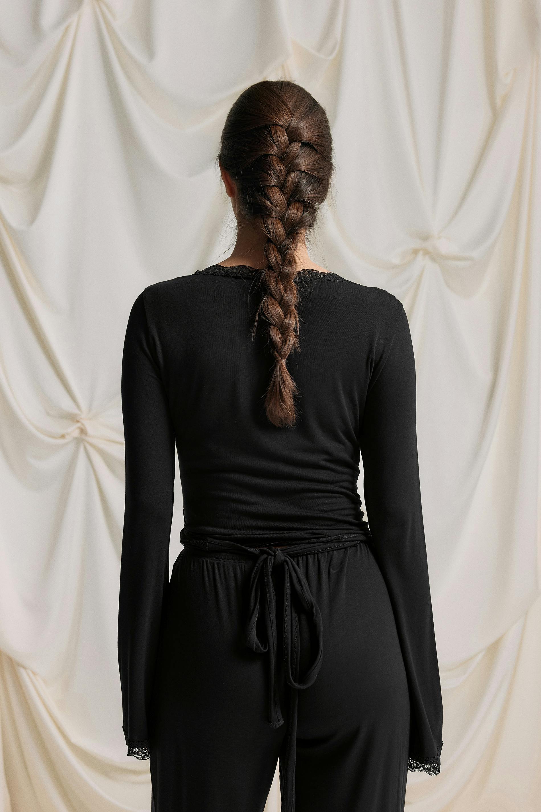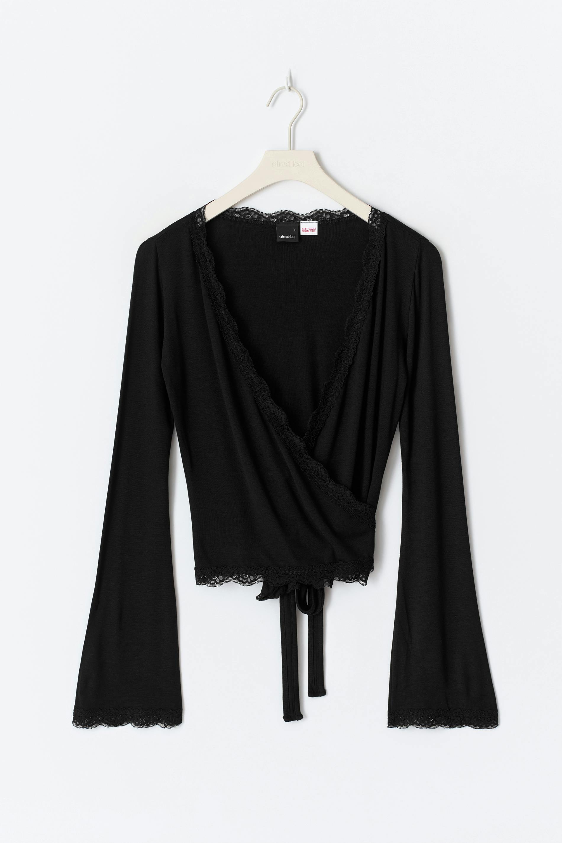 Omlottopp med knytning i midjan. Toppen är svart och har en v-ringning. Den har spetsdetaljer, en lång ärm och en normal passform.