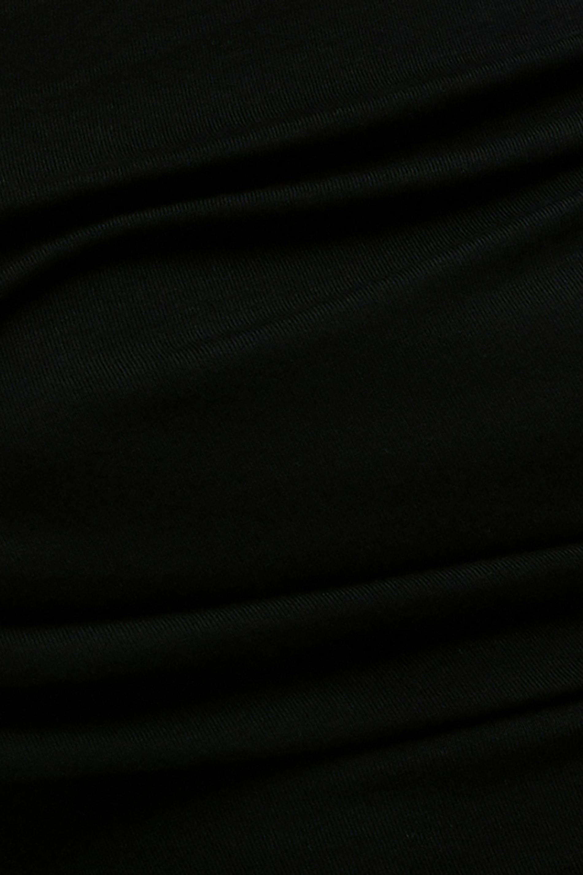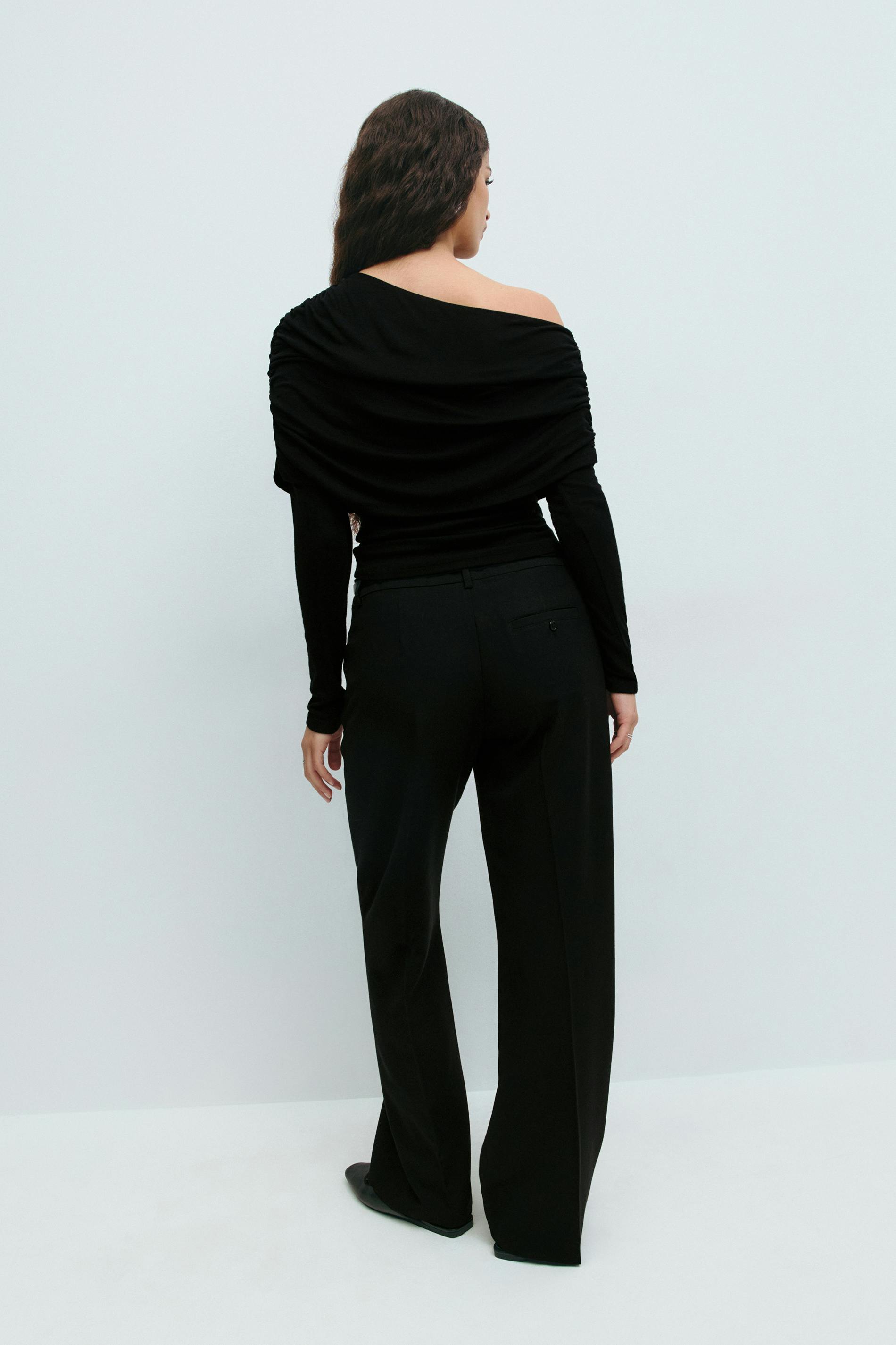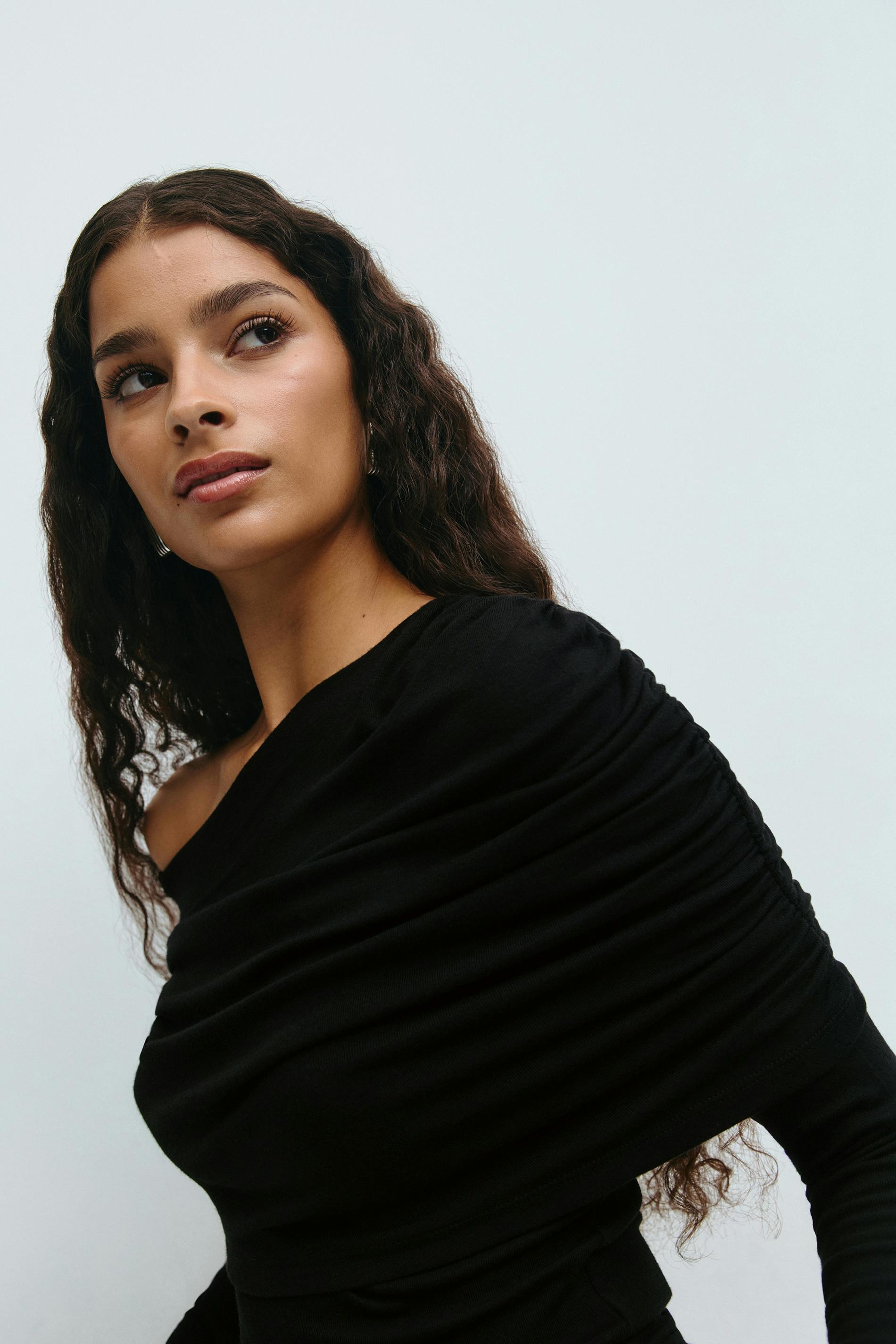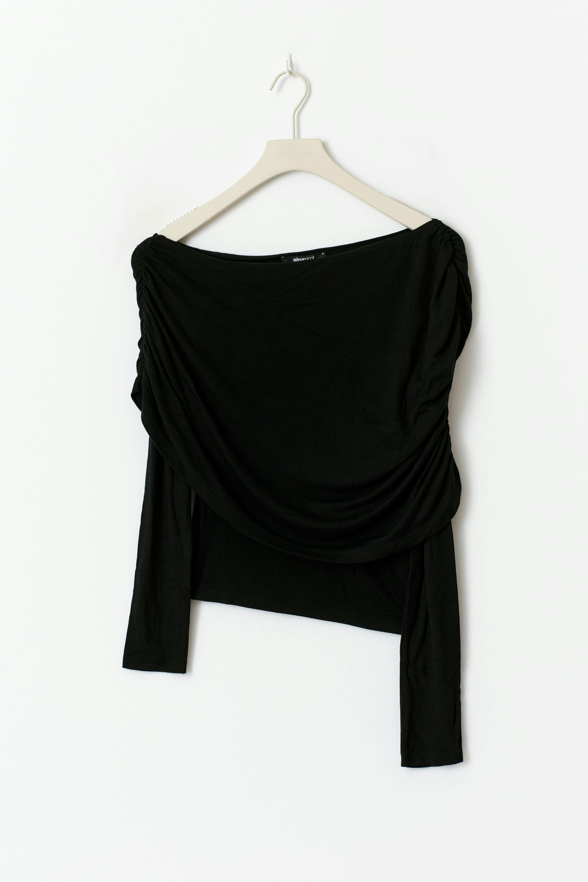 Draped off shoulder top with ruching in the sides. The top is black and has long sleeves. It has draped top part and regular fit.
