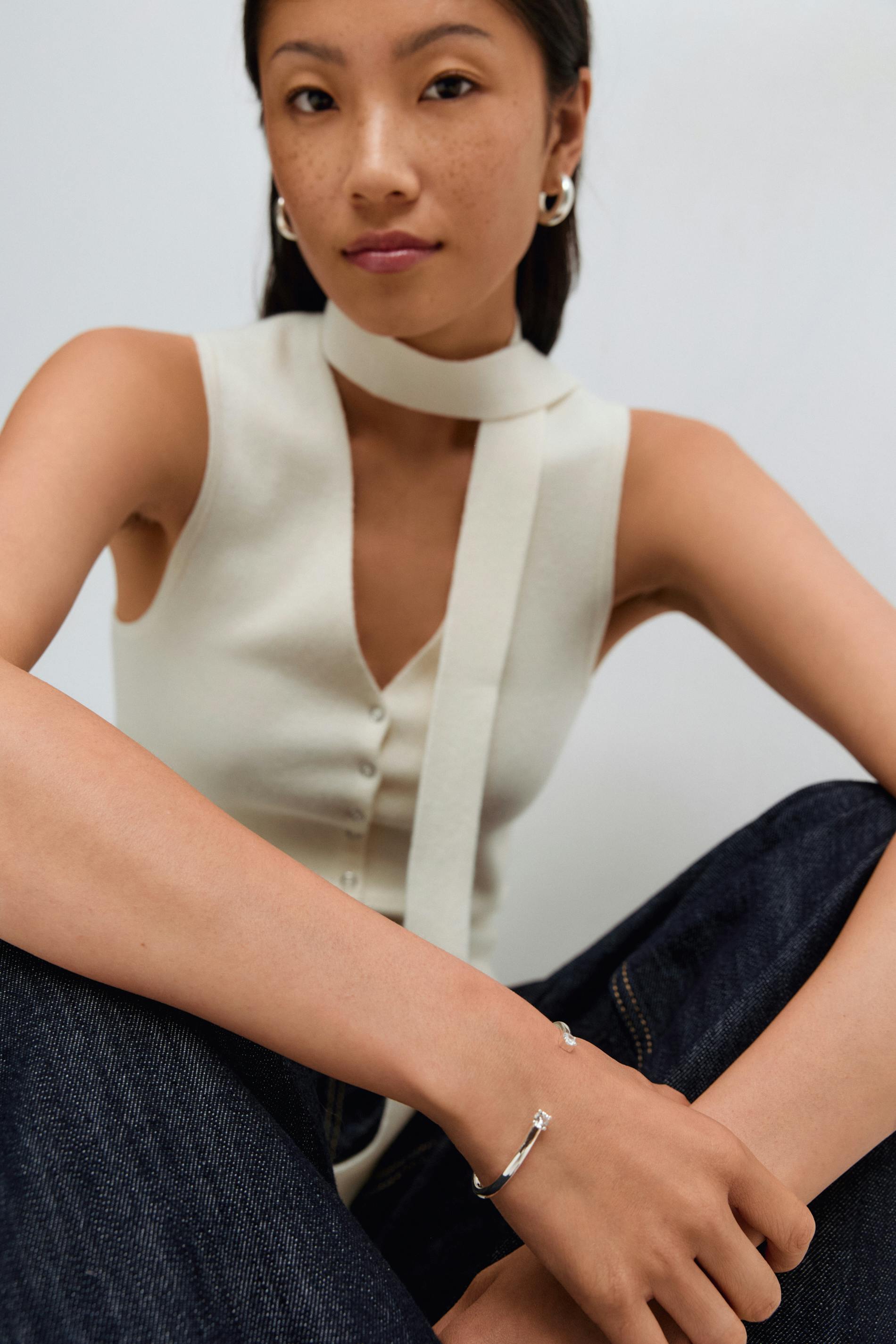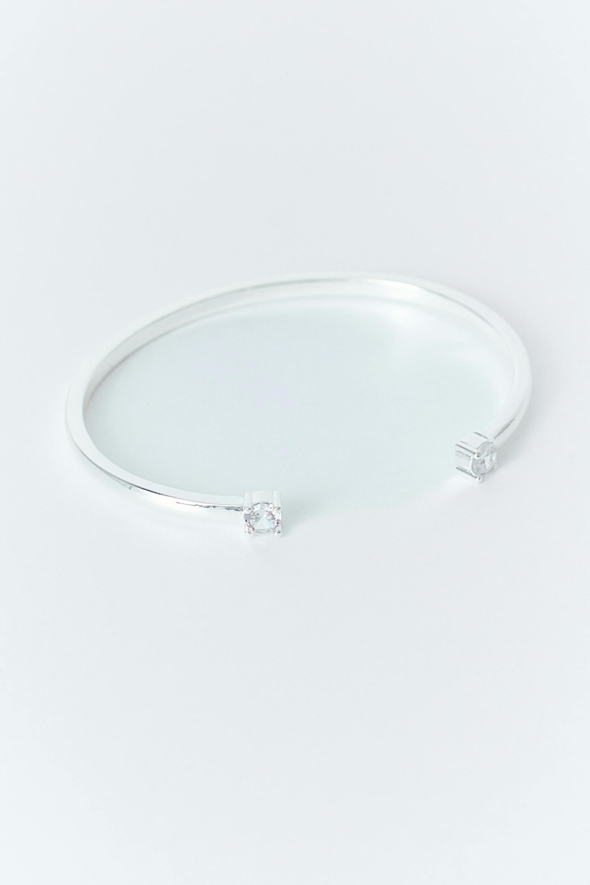 Smalt armband med små stenar vid ändarna. Armbandet är silverfärgat och har öppning framtill.