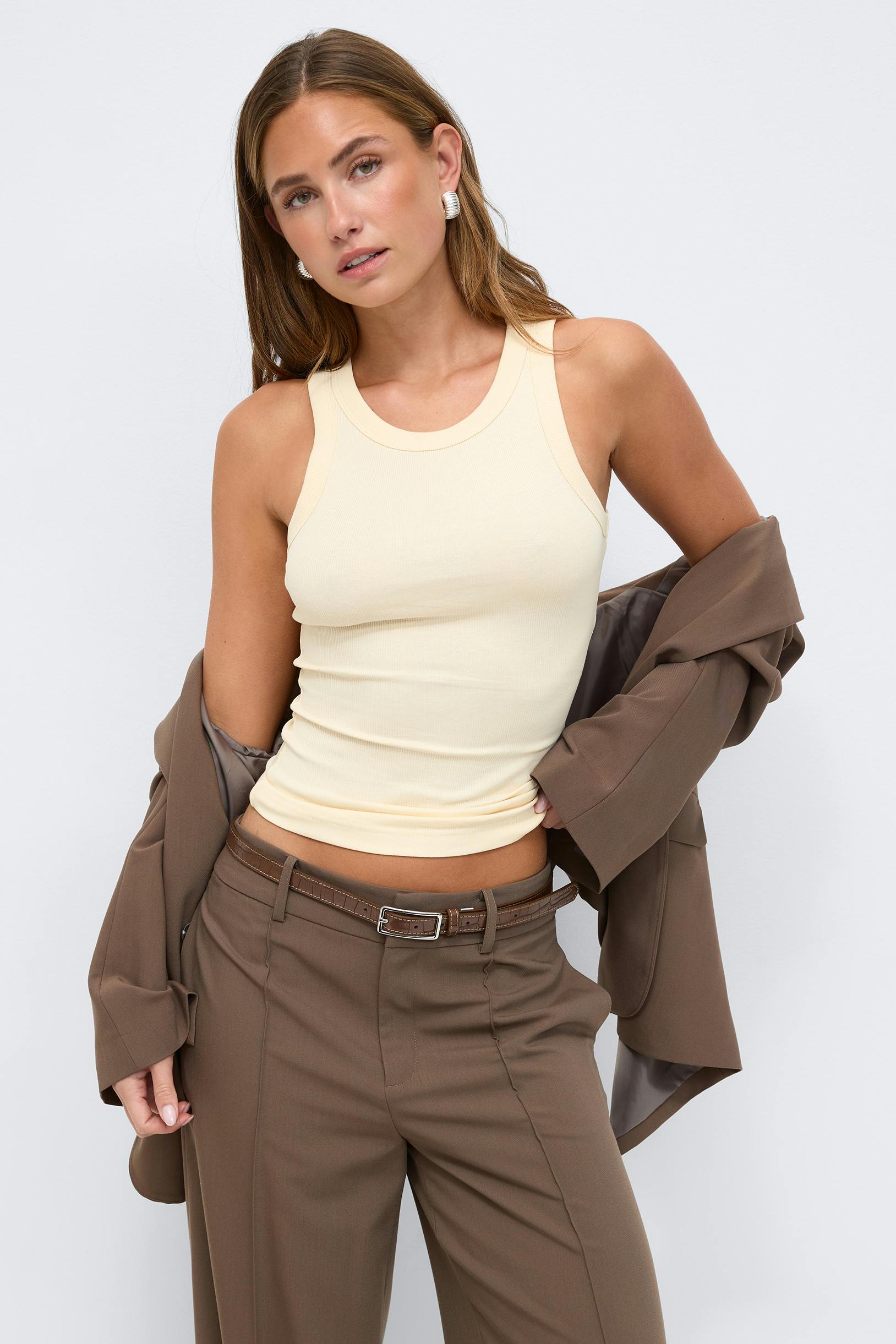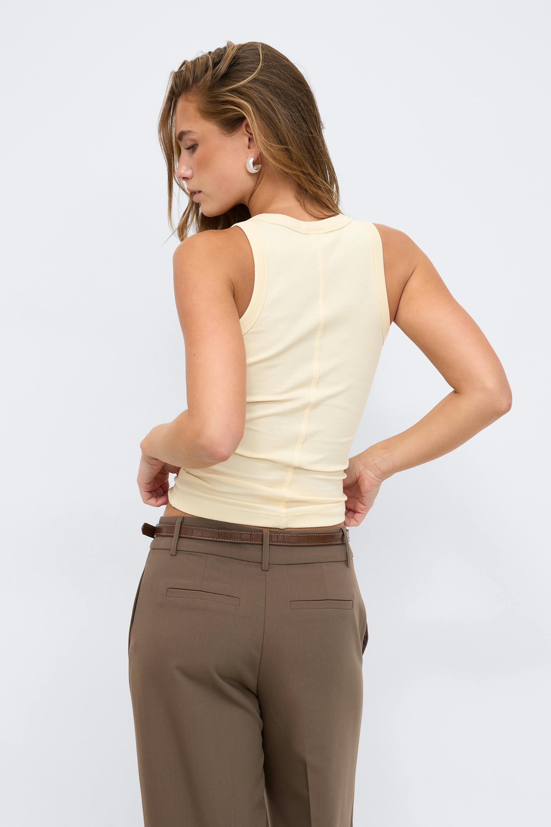Ribbat linne med figurnära passform. Linnet är gult och har en sömdetalj i ryggen. Det har rundad halsringning och normallängd.