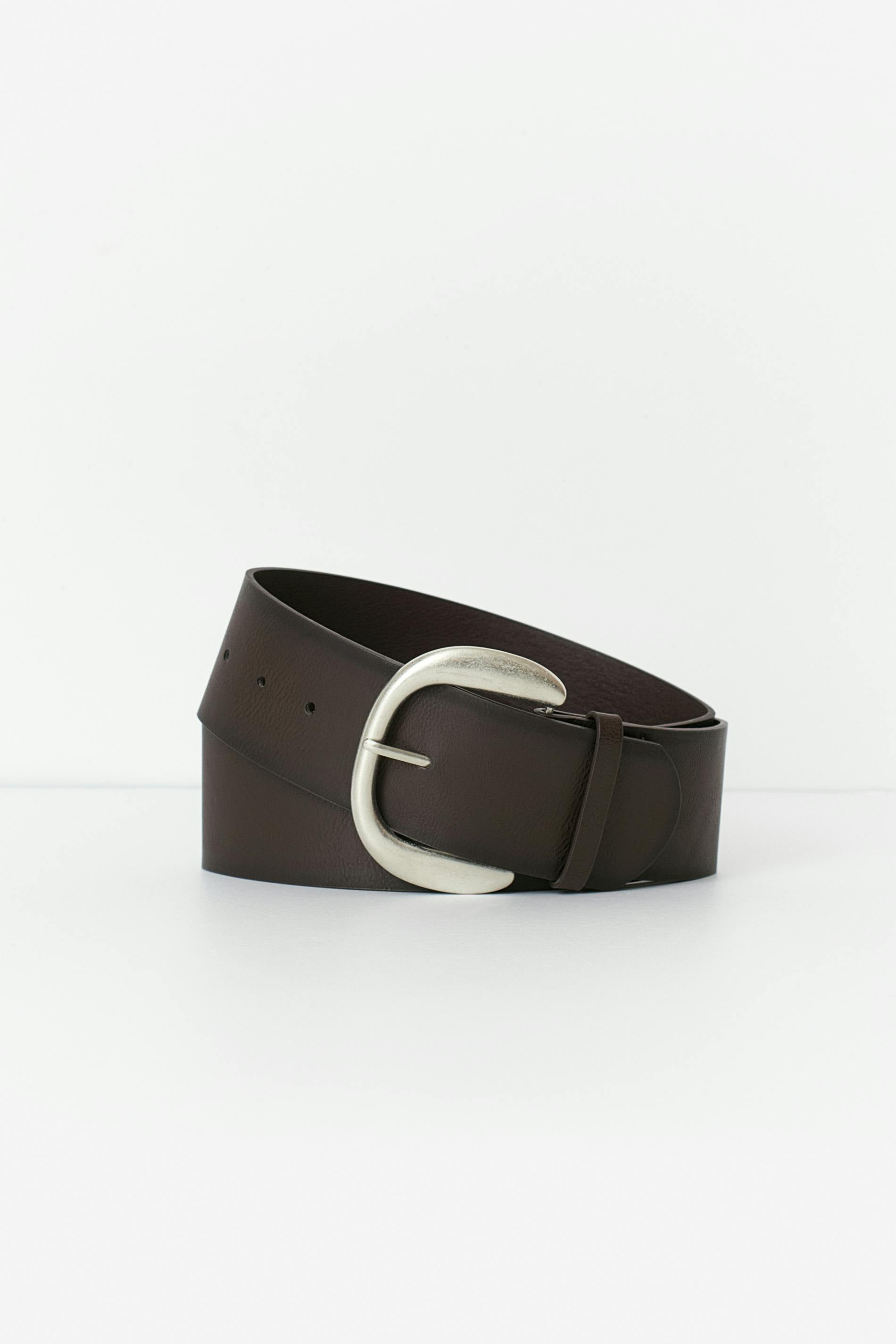 Stort bälte i läderimitation med silverfärgat metallspänne. Bältet är brunt.