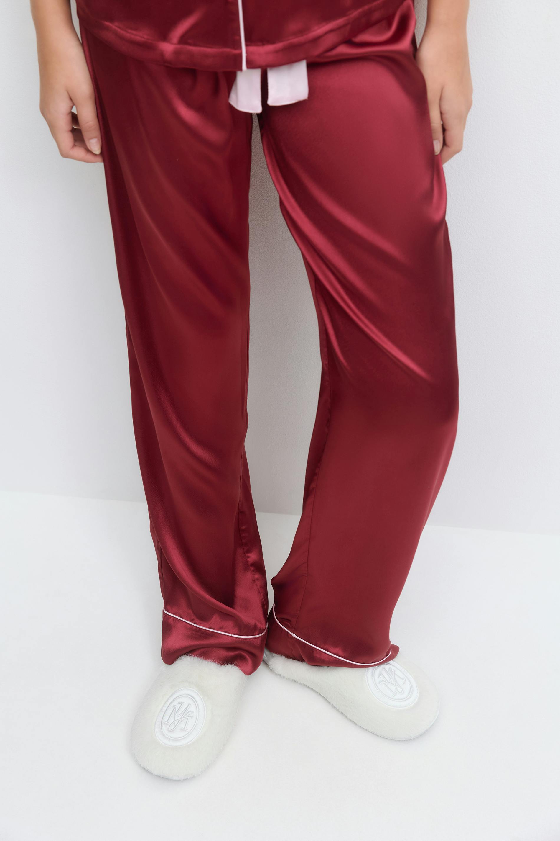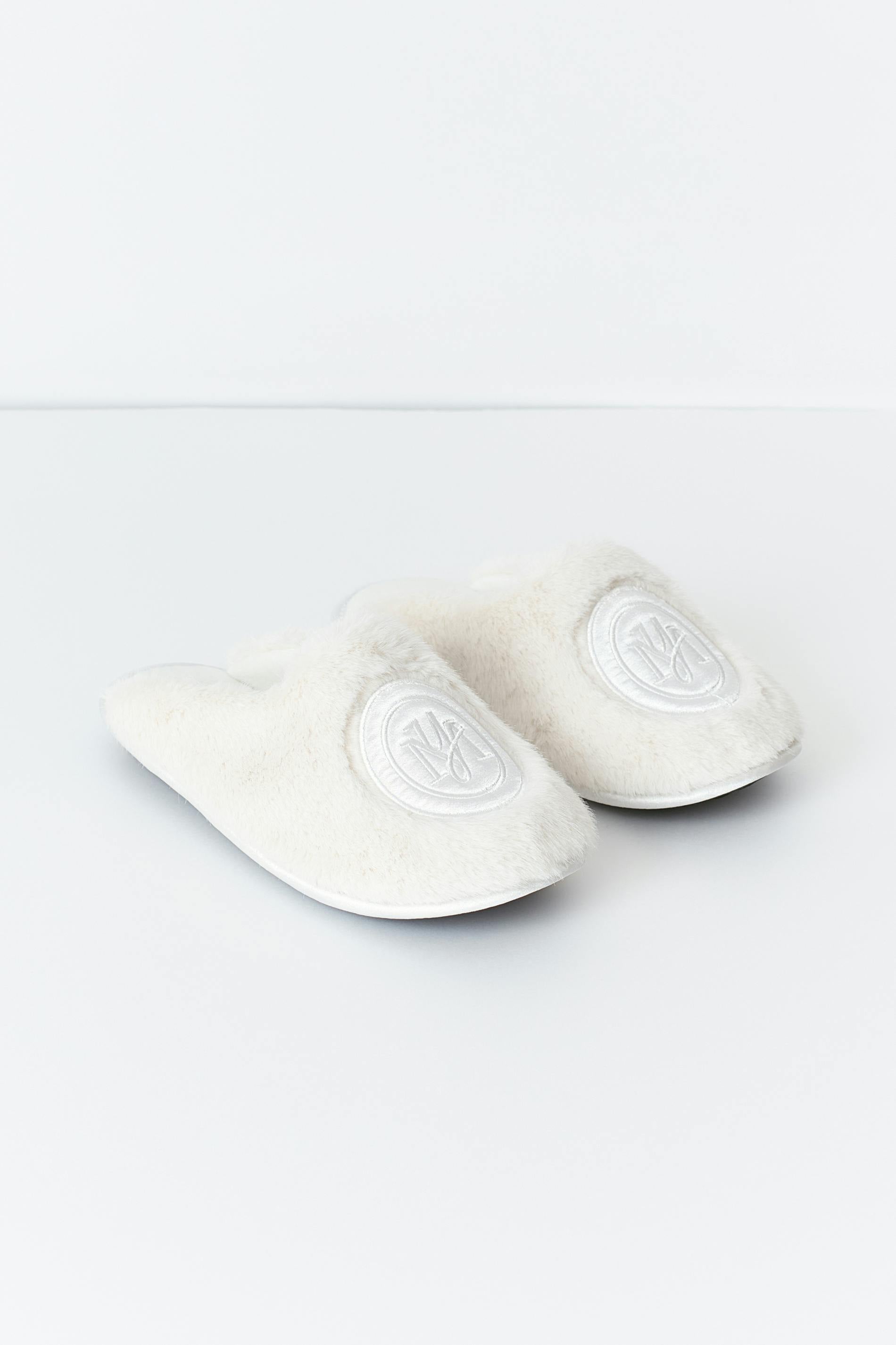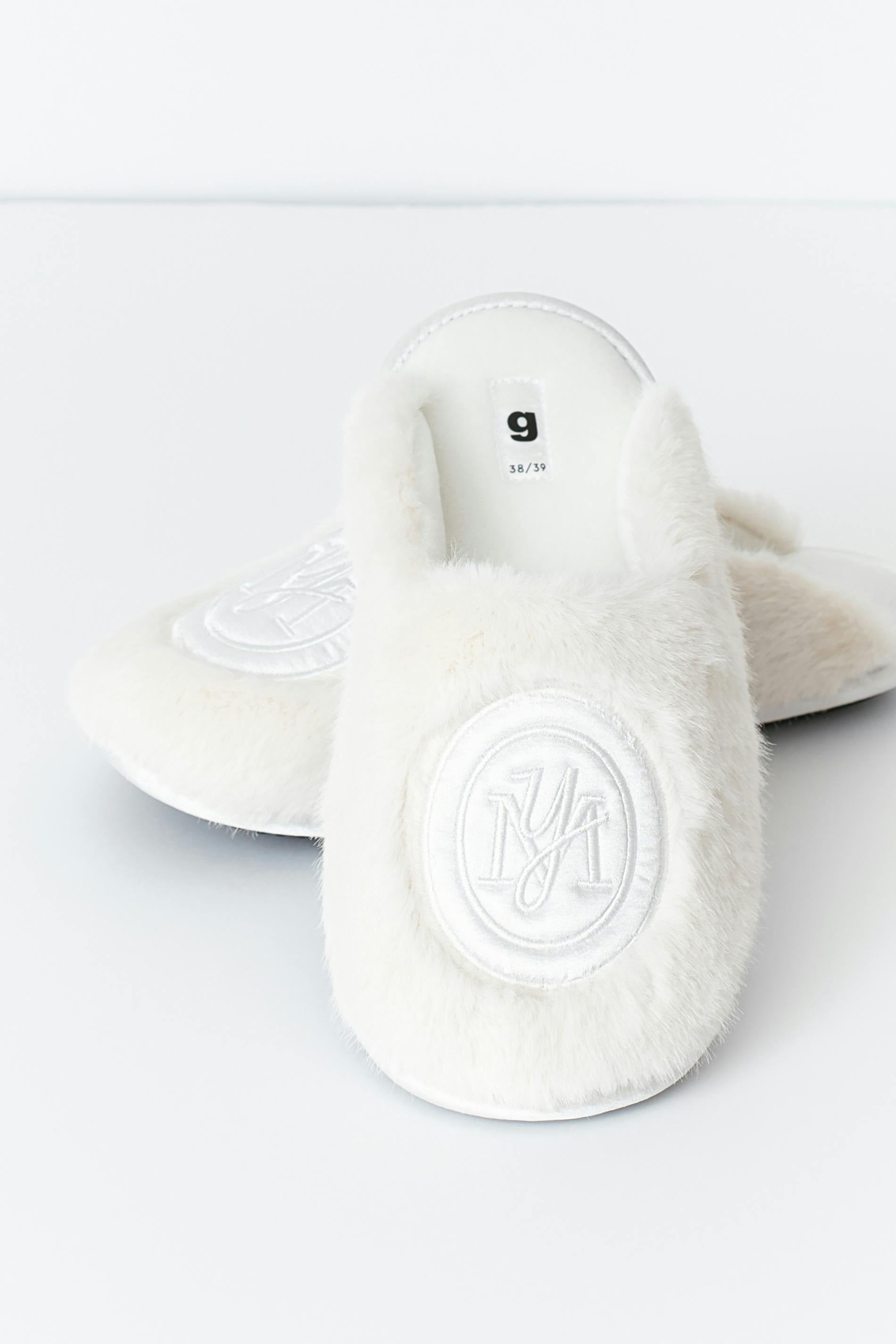 Fluffiga tofflor i fuskpäls med slip in-design. Tofflorna är vita och har broderat emblem på framsidan. De har rundad tå och platt sula.