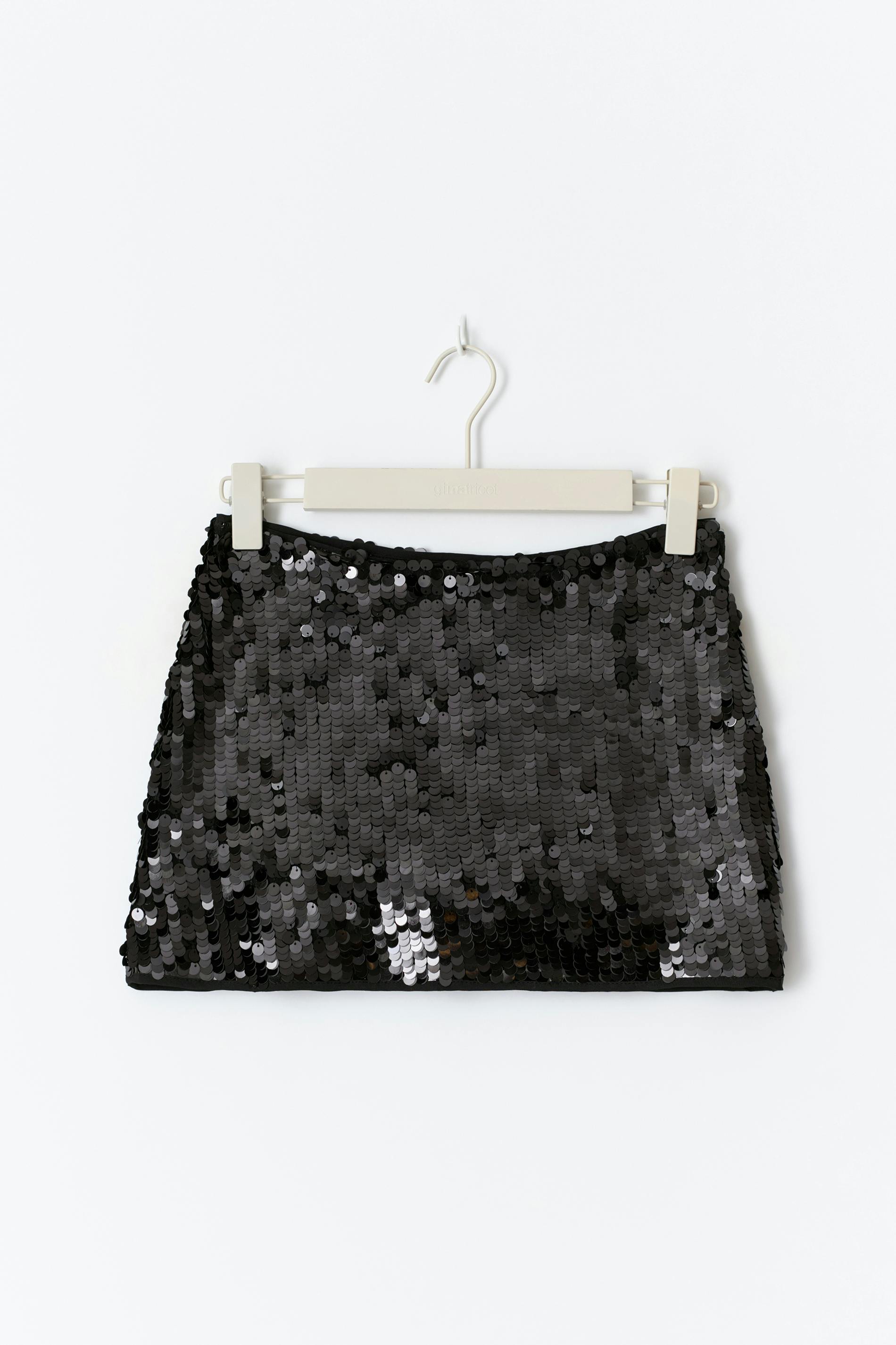 Kort paljettkjol med låg midja. Kjolen är svart och har dragkedjestängning.