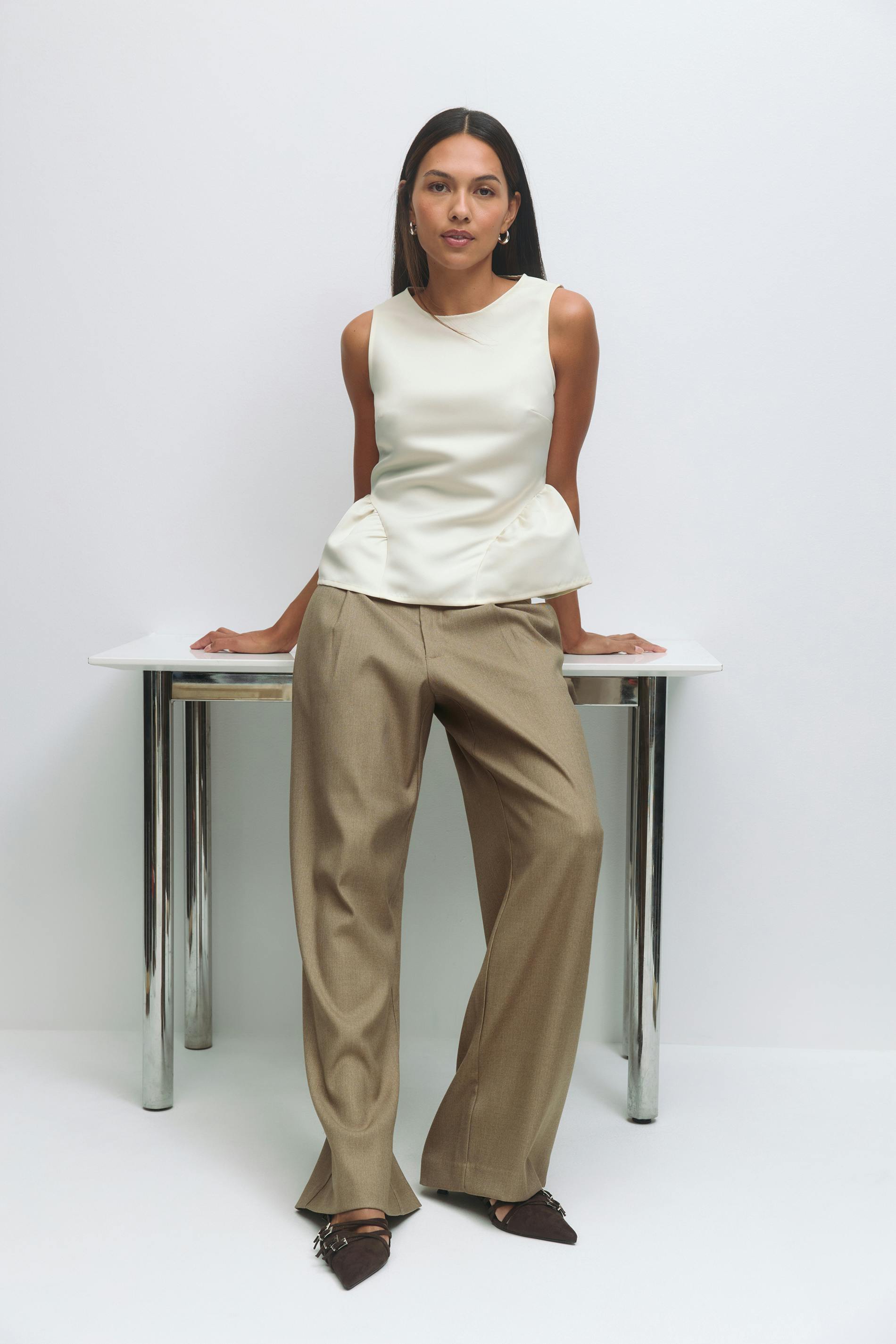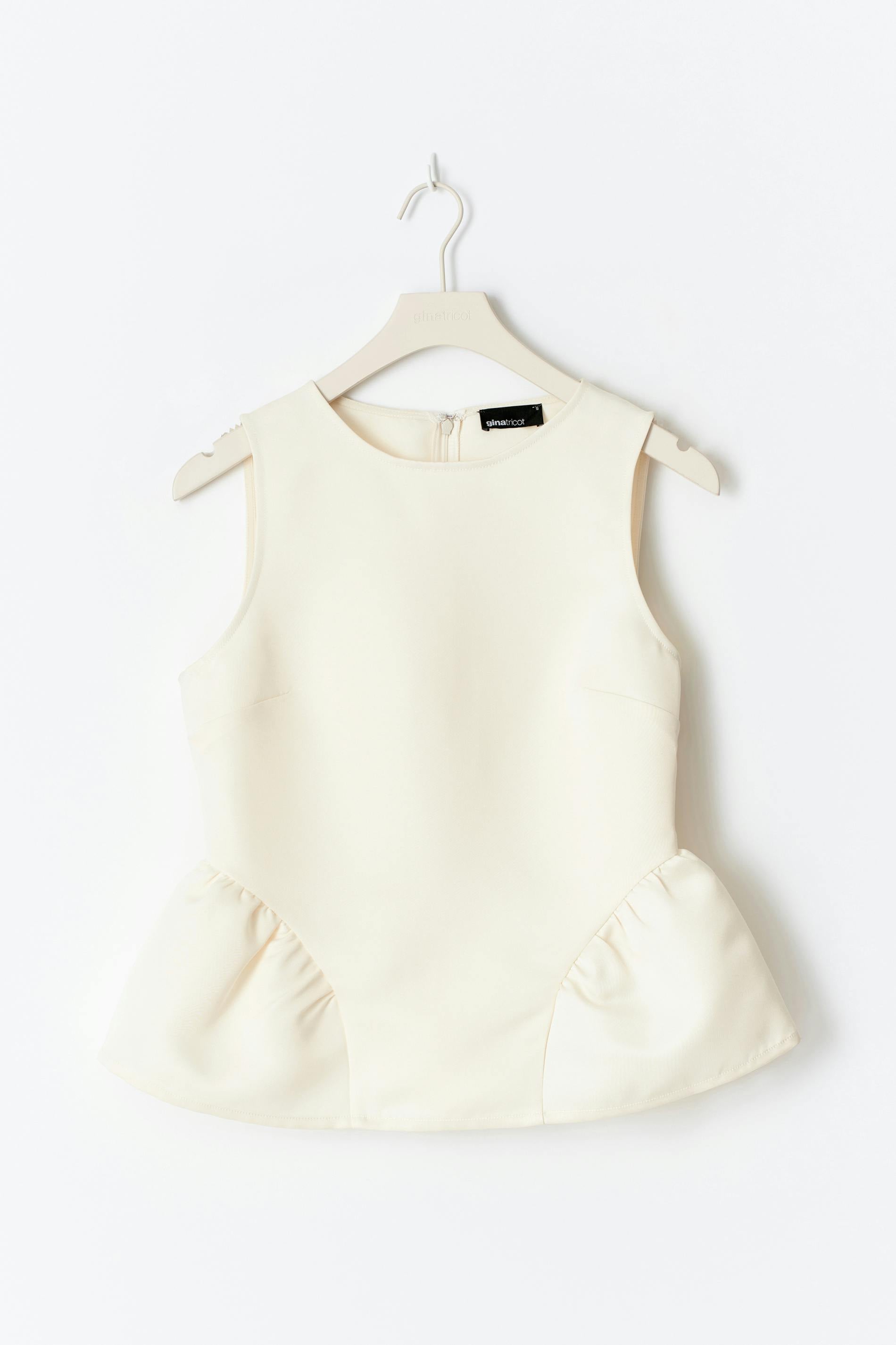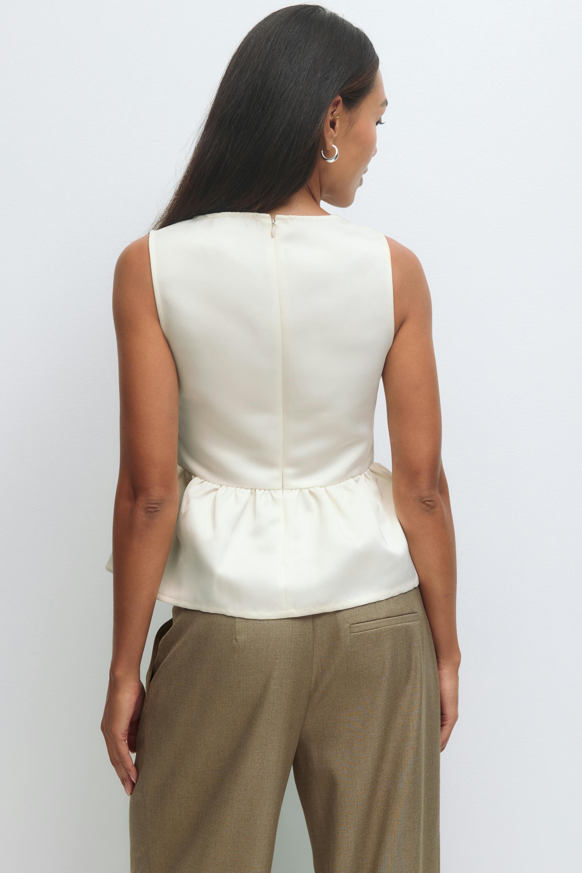 Peplumtopp i satin med volang nedtill. Toppen är krämfärgad och har en rund hals. Den har en dragkedjestängning baktill och en normallängd.
