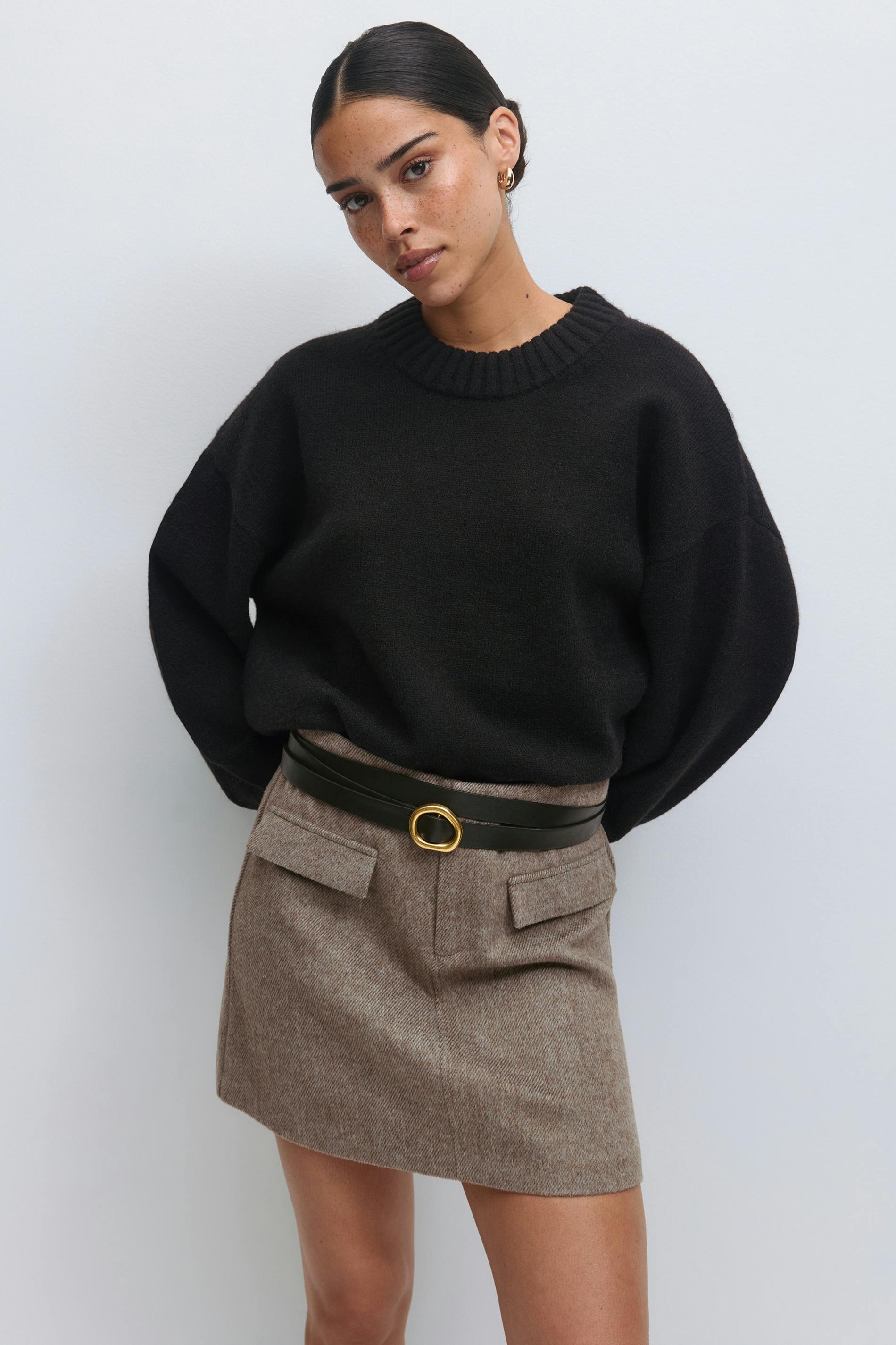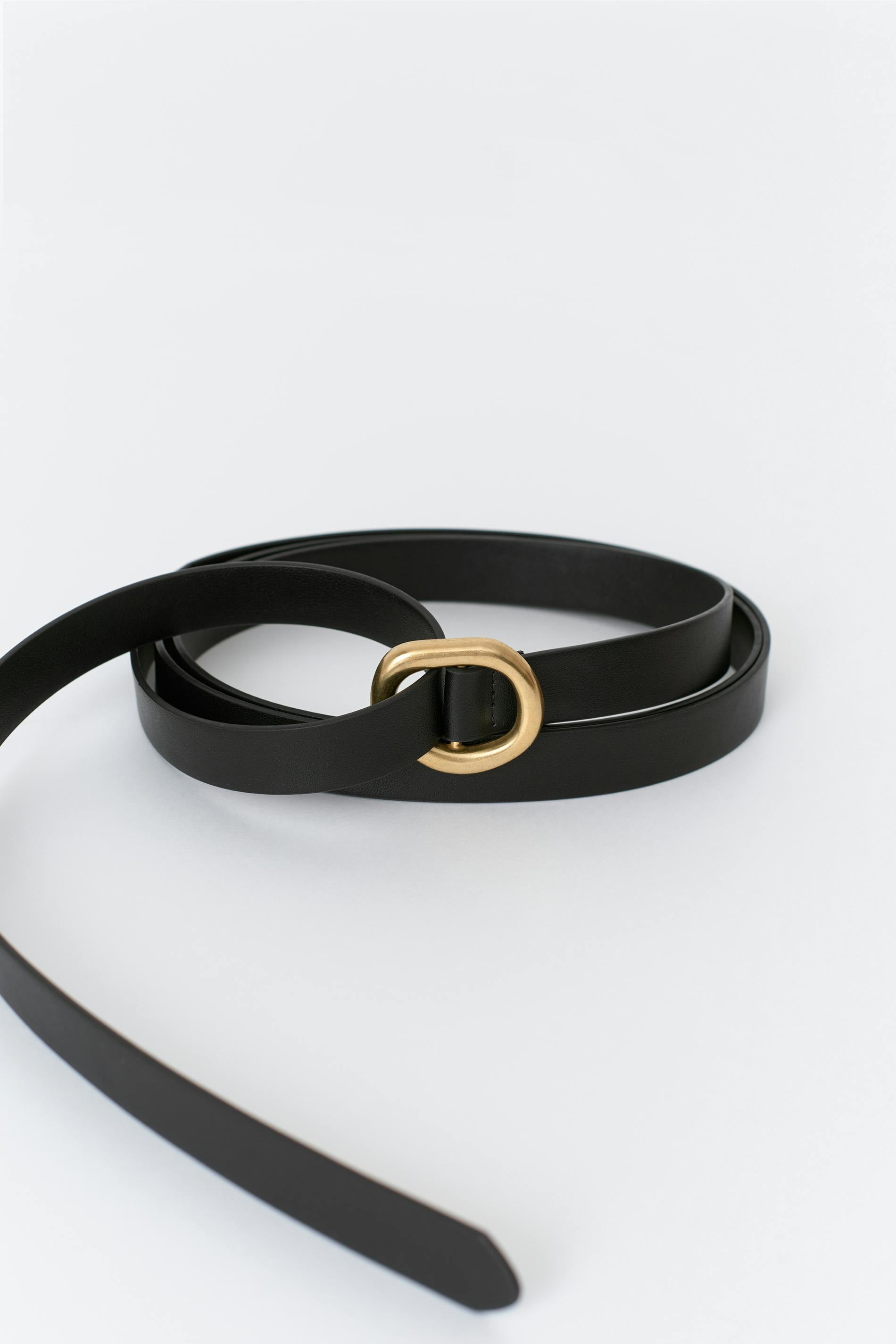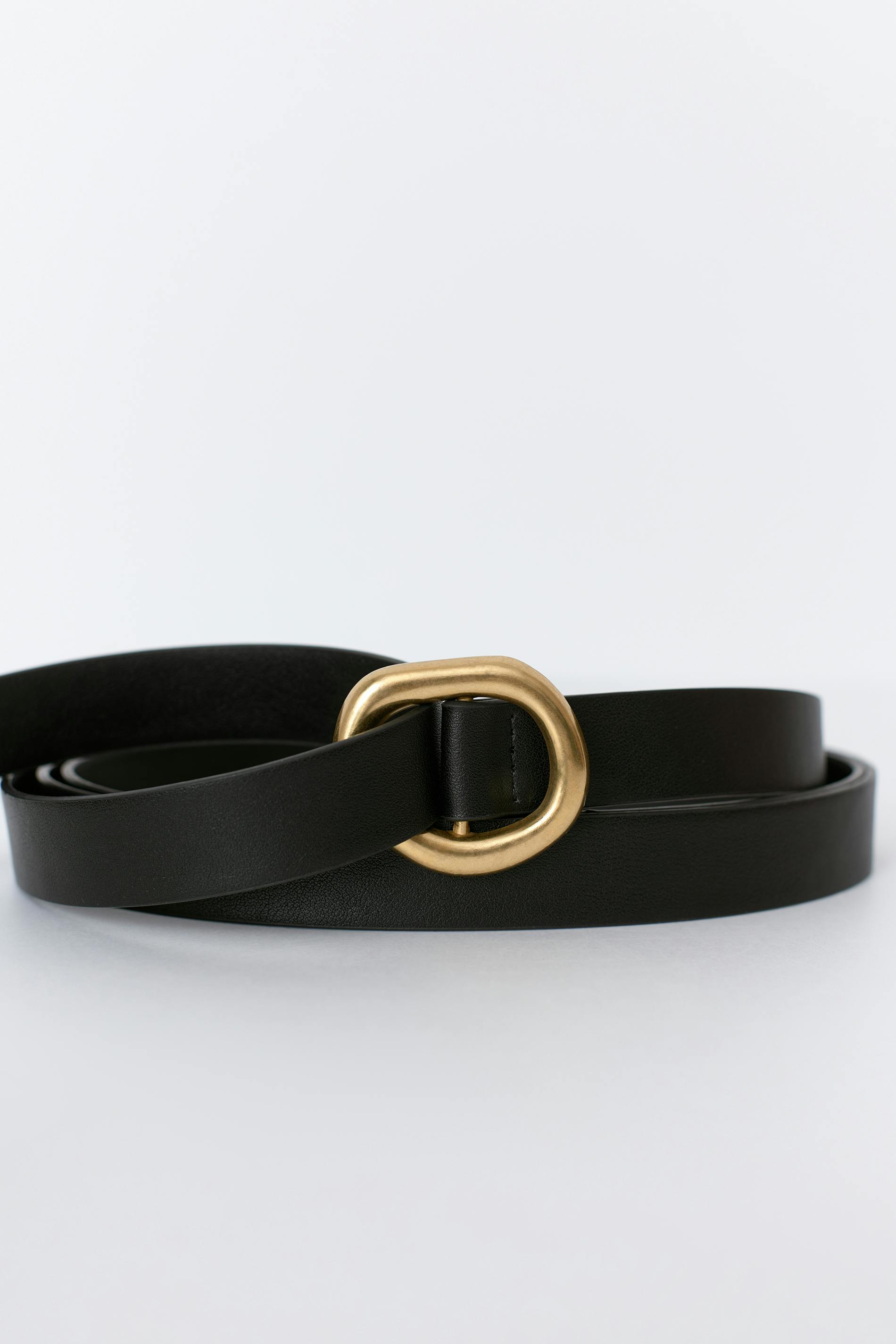 Bälte i läderimitation med ett metallspänne. Bältet är svart och guldfärgat.