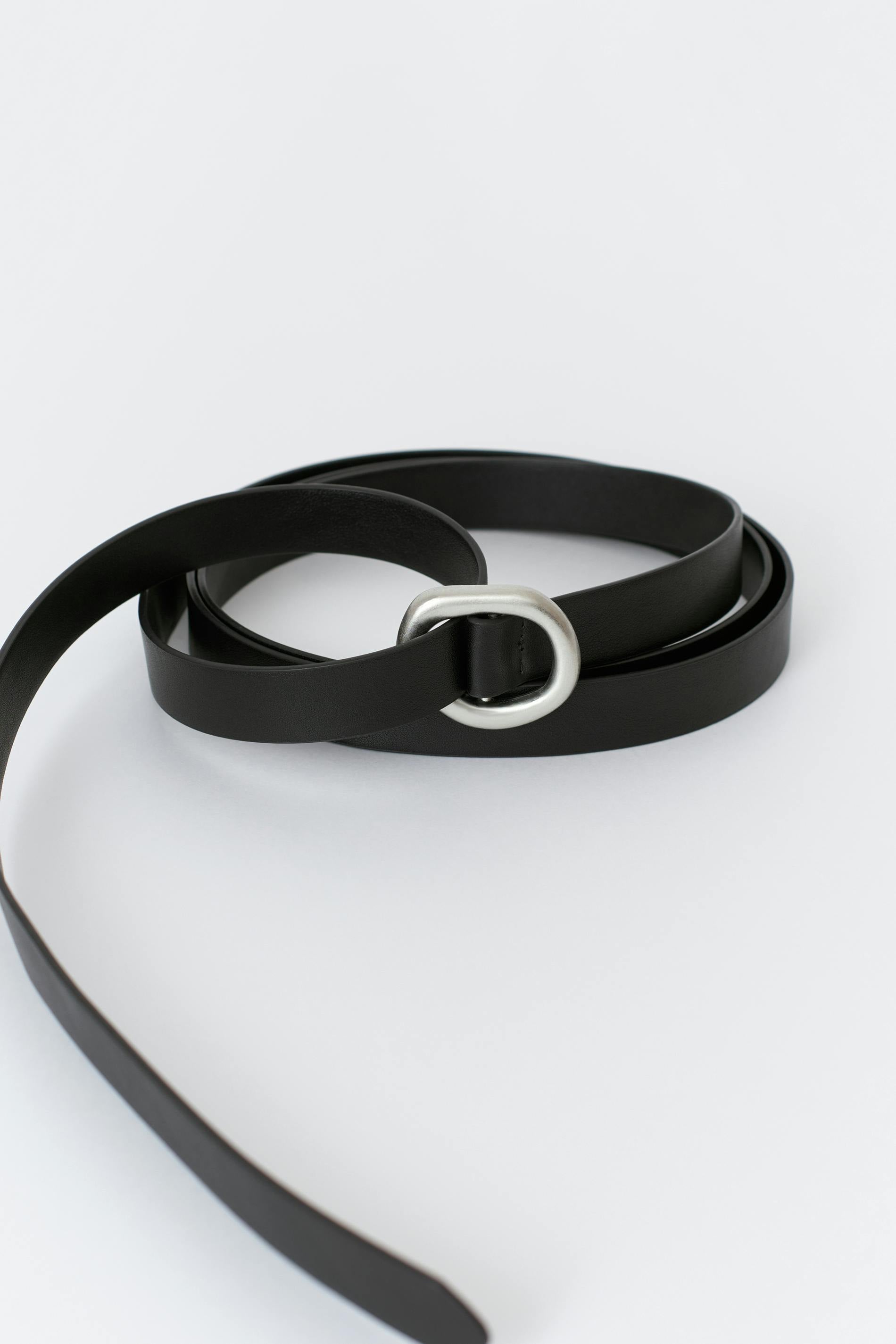 Bälte i läderimitation med ett metallspänne. Bältet är svart och silverfärgat.