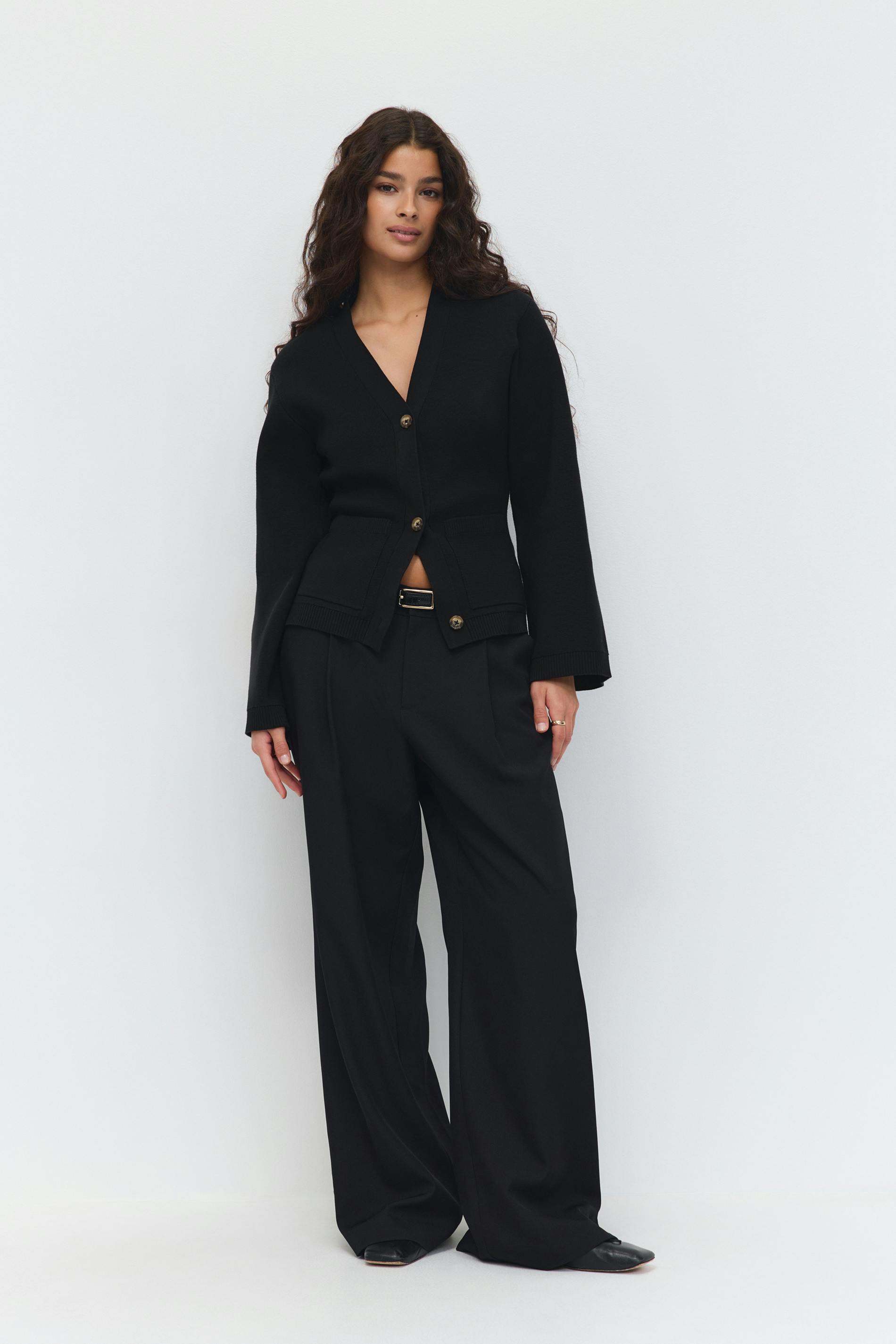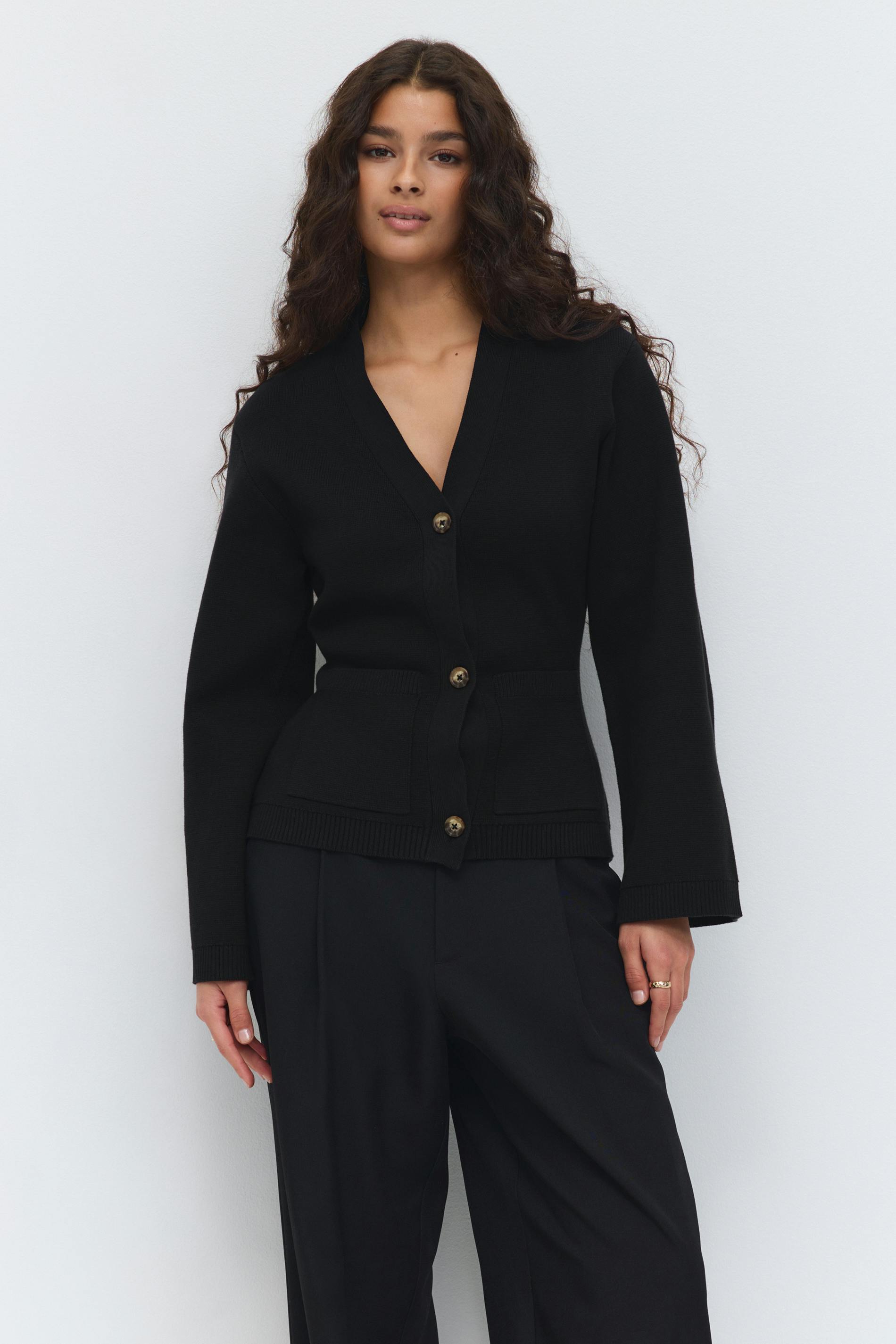 Stickad kofta med påsydda framfickor. Cardigan är svart och har knappar framtill. Den har v-ringning, långa ärmar, normal passform och ribbstickning vid ärmslut och i nederkant.