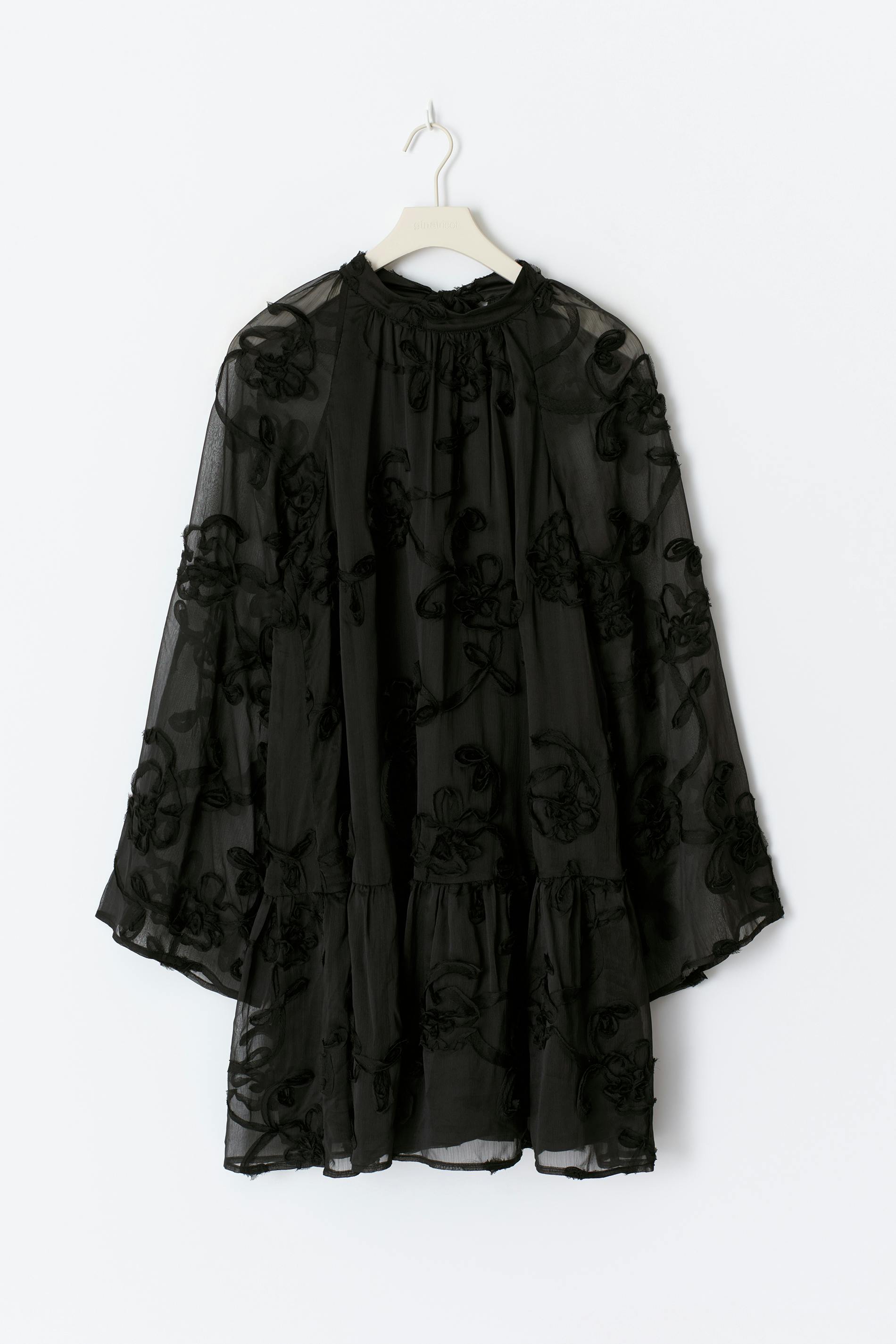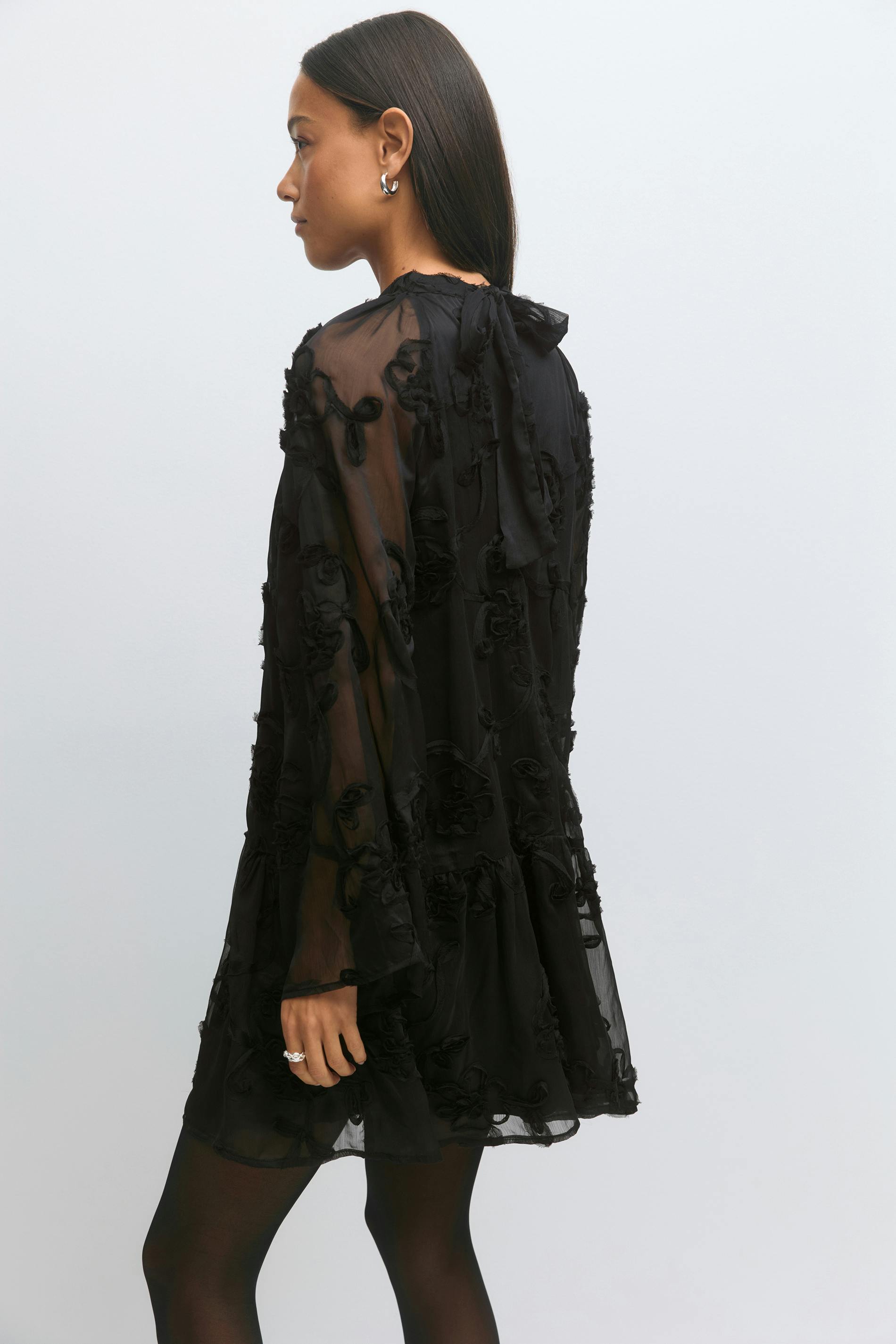Kort klänning med struktur. Klänningen är svart och har en vid, transparent lång ärm. Den har en rundhals och ett knytband baktill.