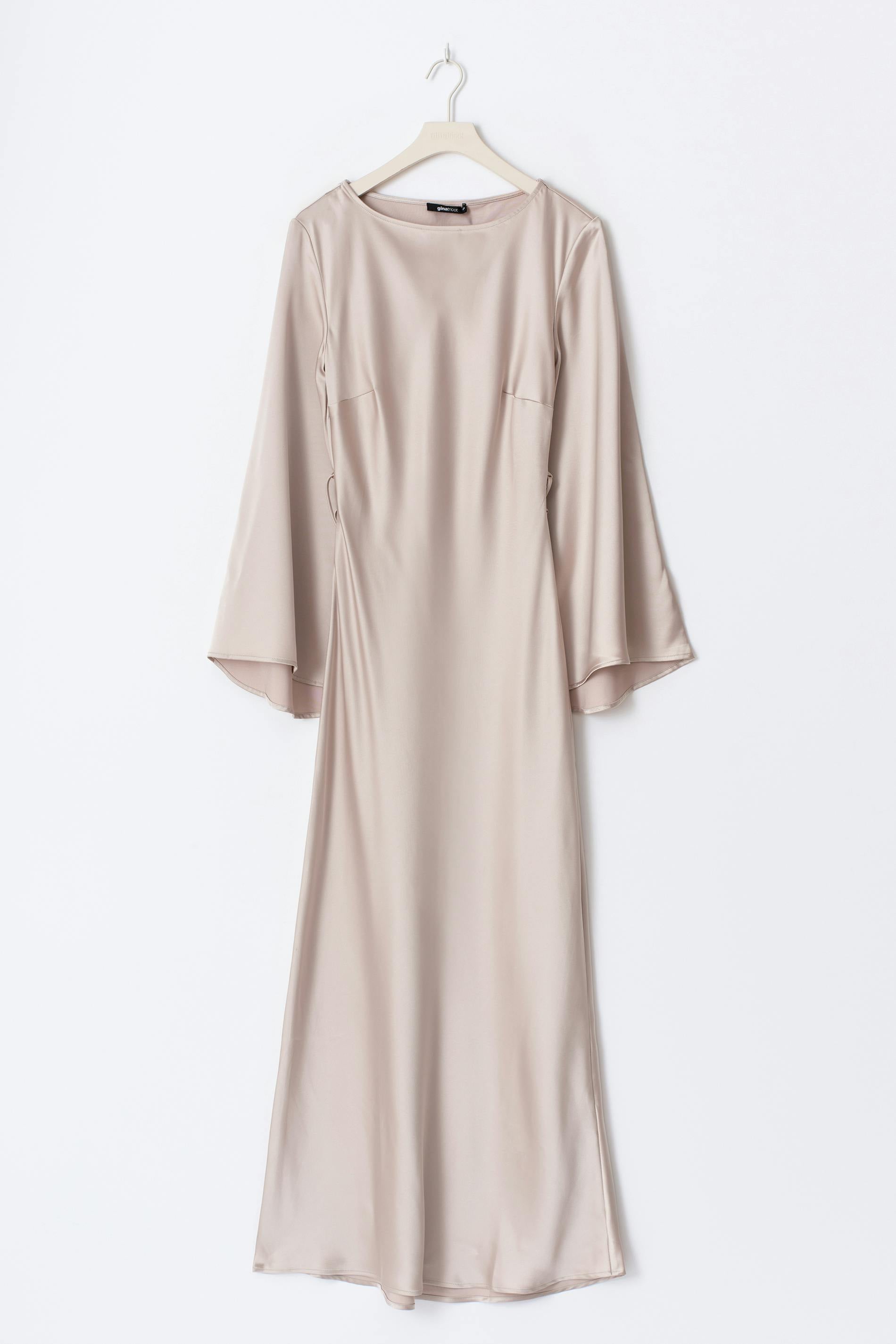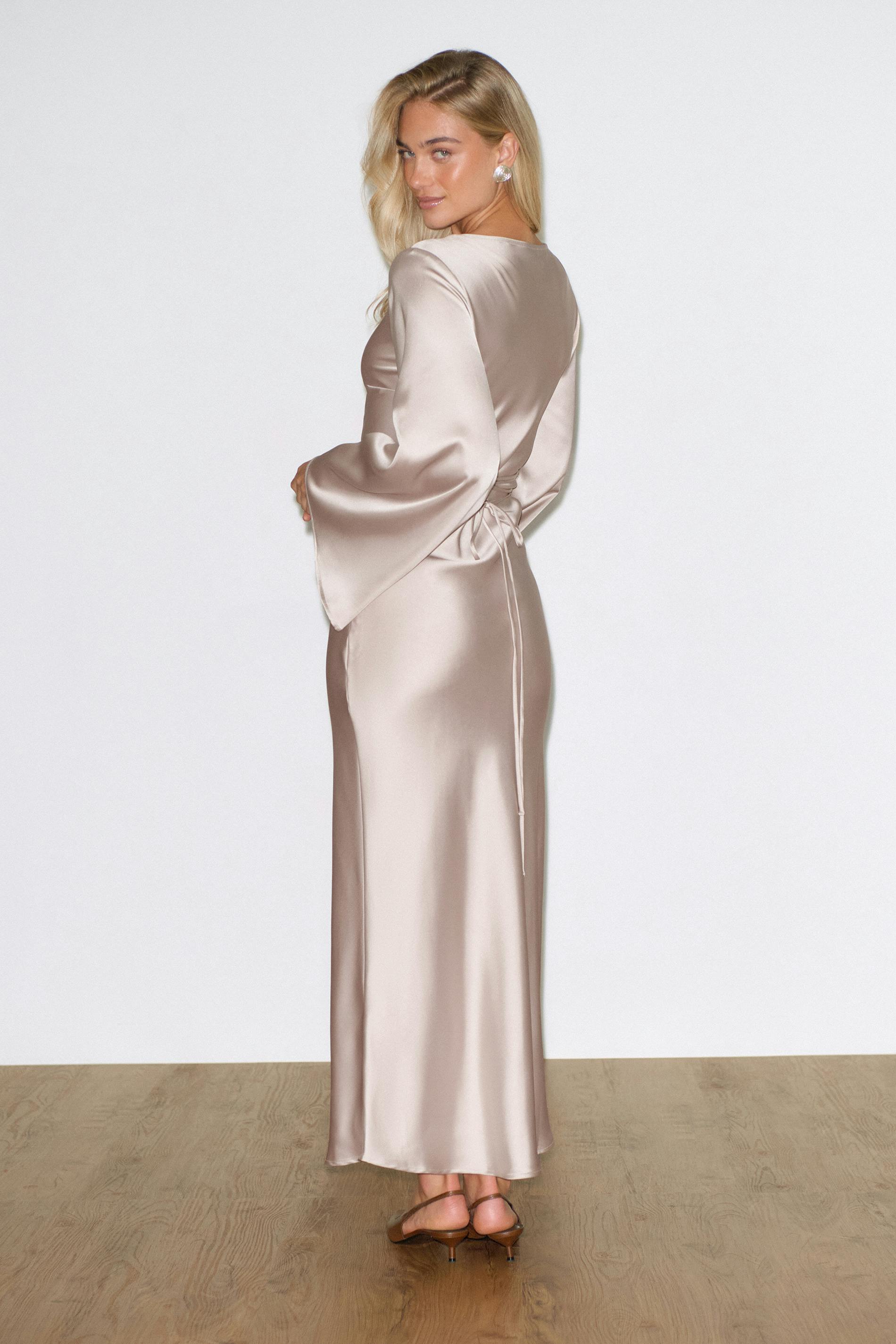Maxiklänning i satin med en vid, lång ärm. Klänningen är champagnefärgad och har en båtringning. Den har knytning baktill och normal passform.