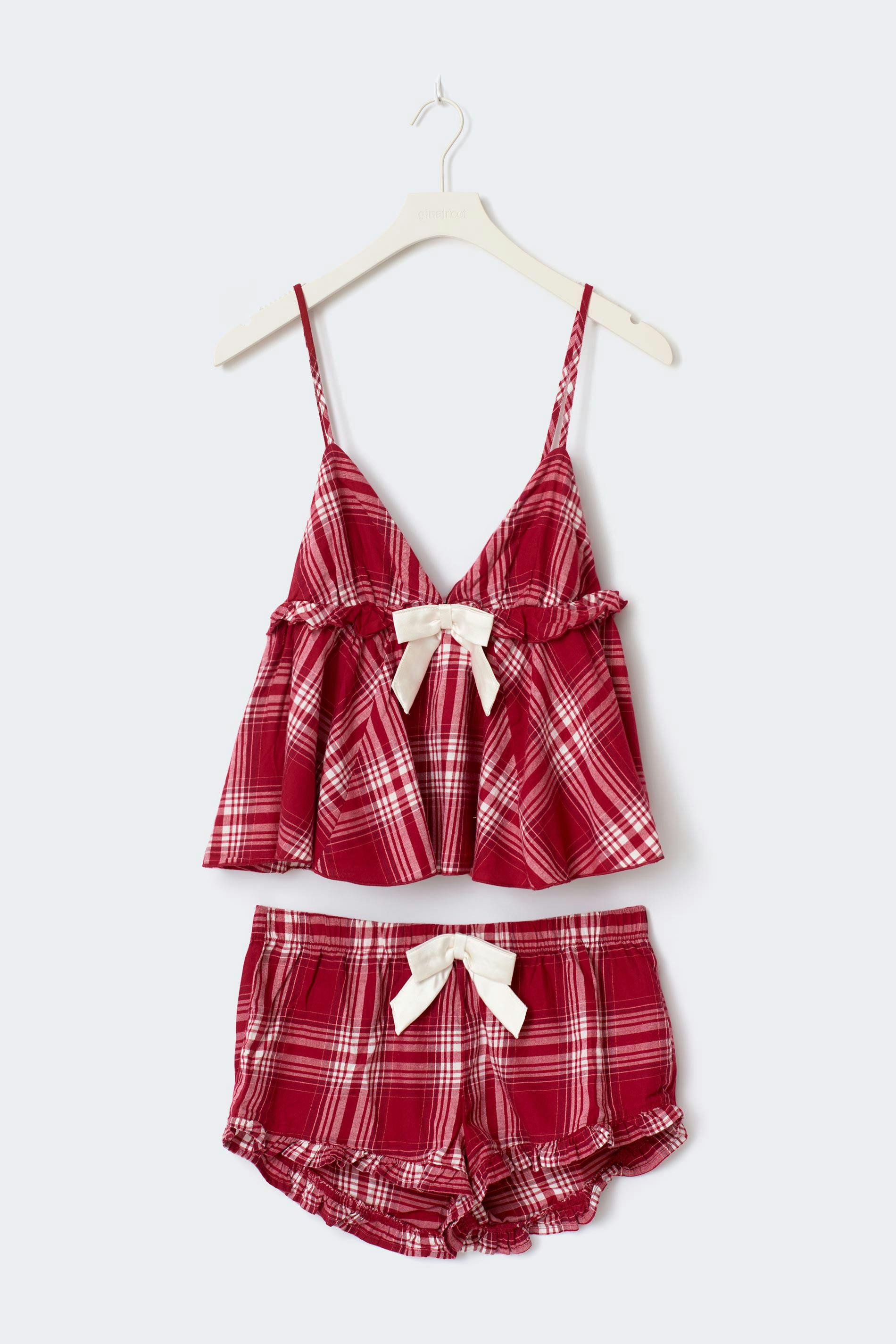 Rutigt pyjamasset i flanell med en normal passform. Pyjamassetet är rött och har ett ärmlöst pyjamaslinne med reglerbara axelband. Det har en rosett under bysten, korta pyjamasshorts med en låg midja, ett knytband i midjan och en volang nedtill.