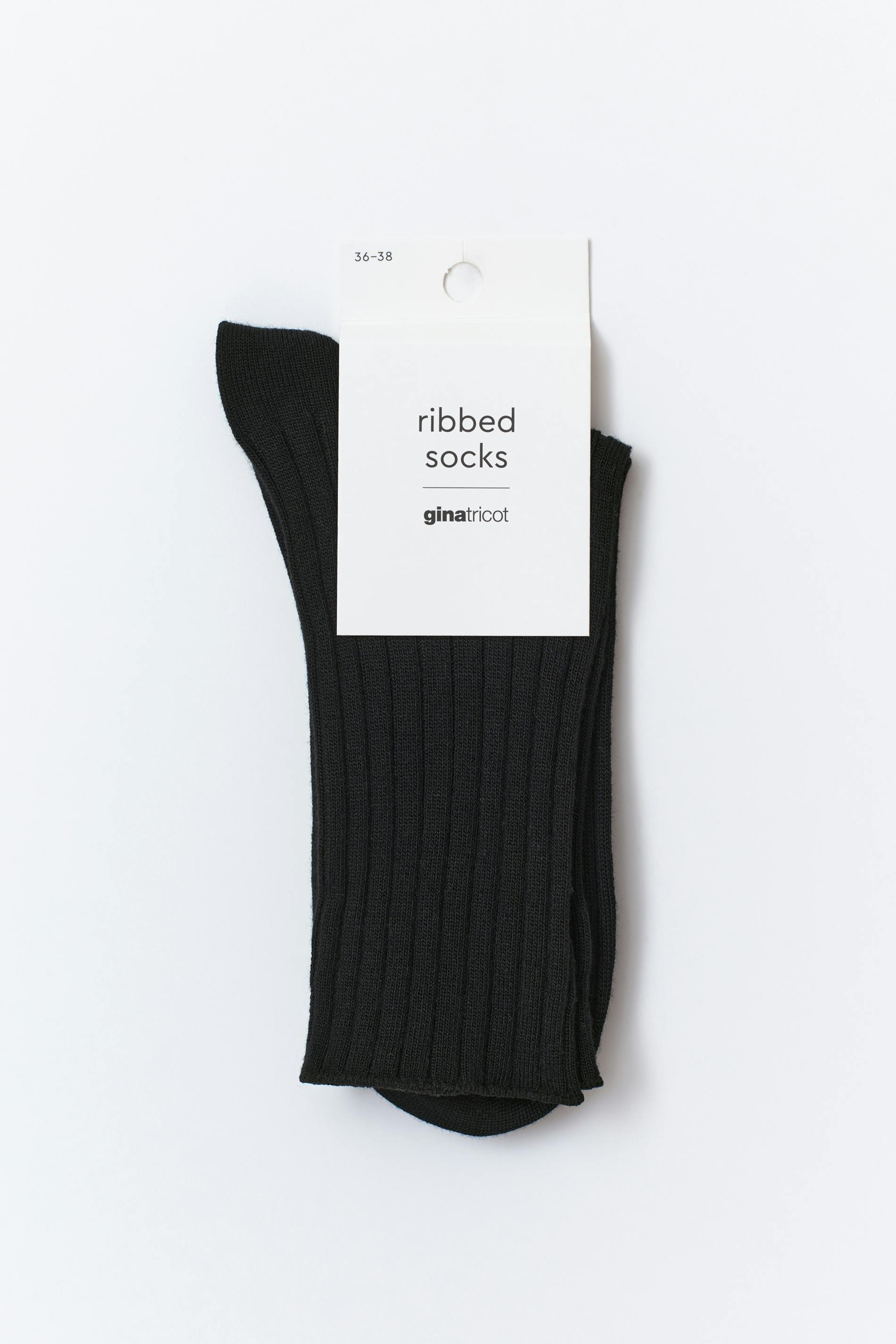 Höga strumpor. Strumporna är svarta och ribbade.
