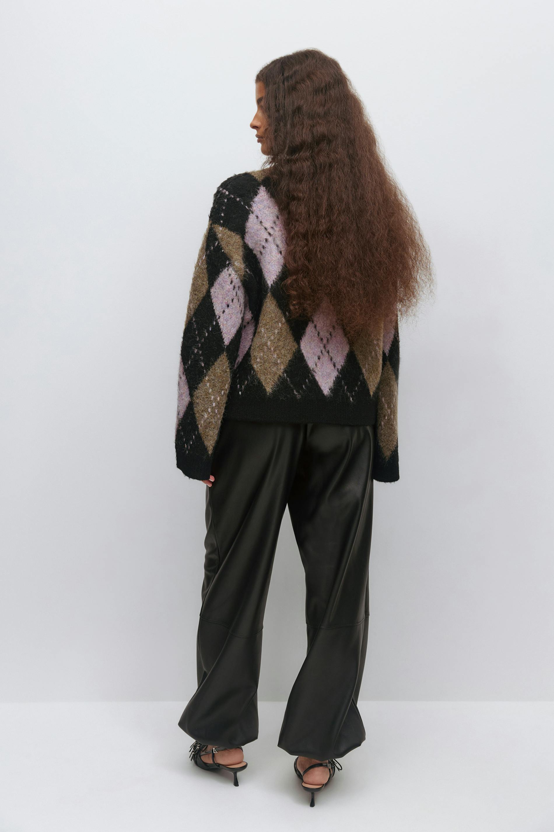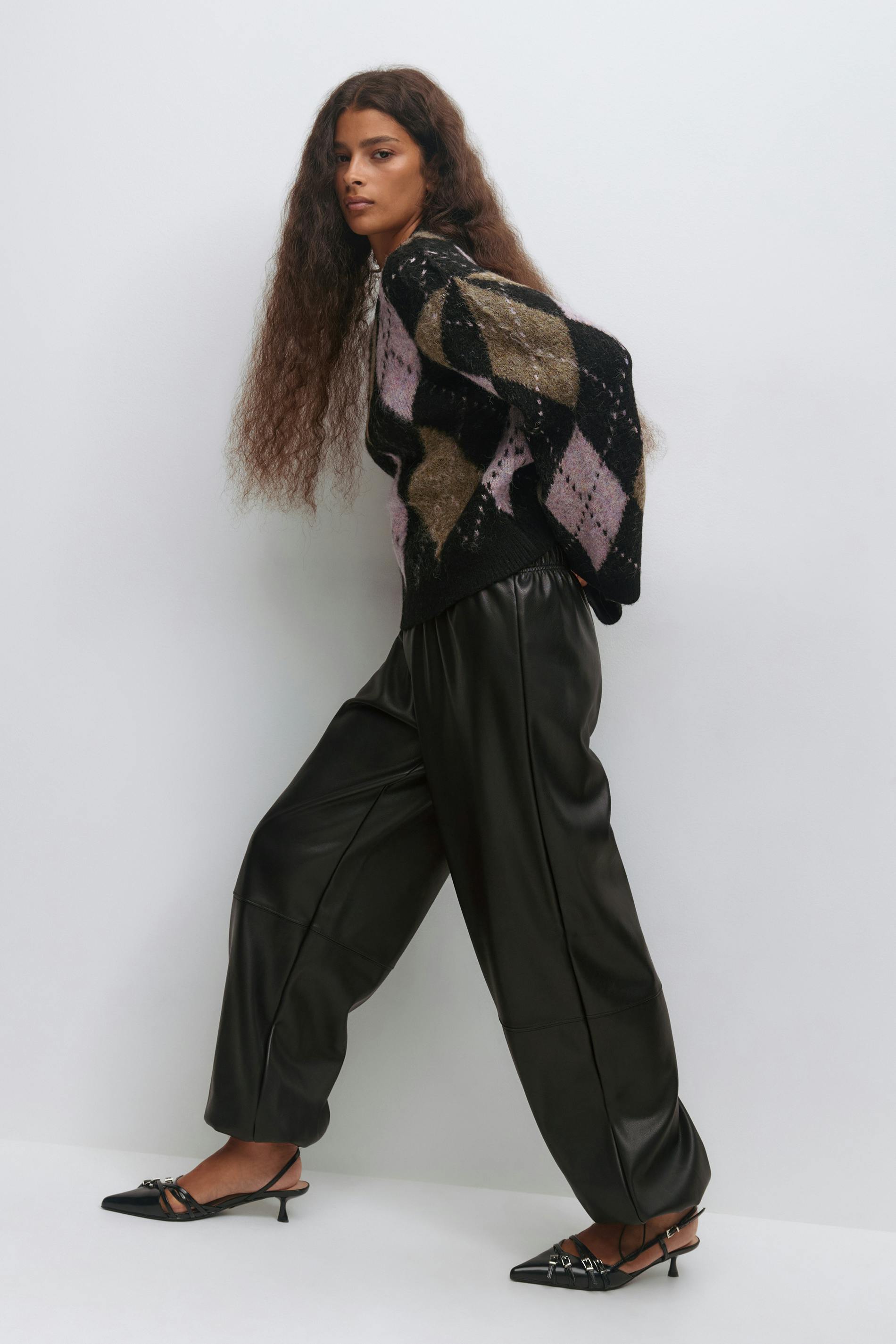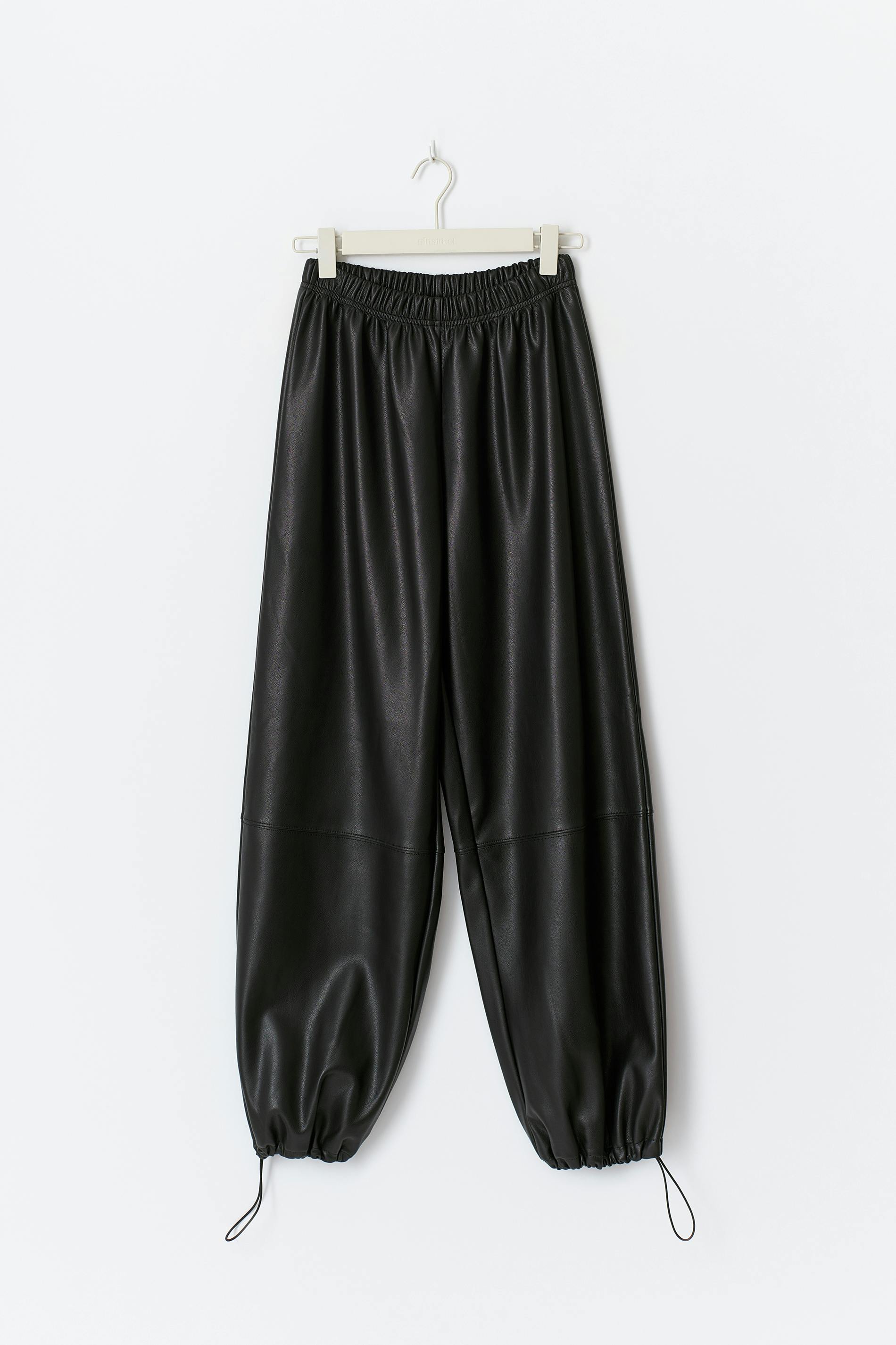 Ballongbyxor i skinnimitation med resår i midjan. Ballongbyxorna är svarta och har lös passform. De har stretchigt material och dragsko vid bensluten.