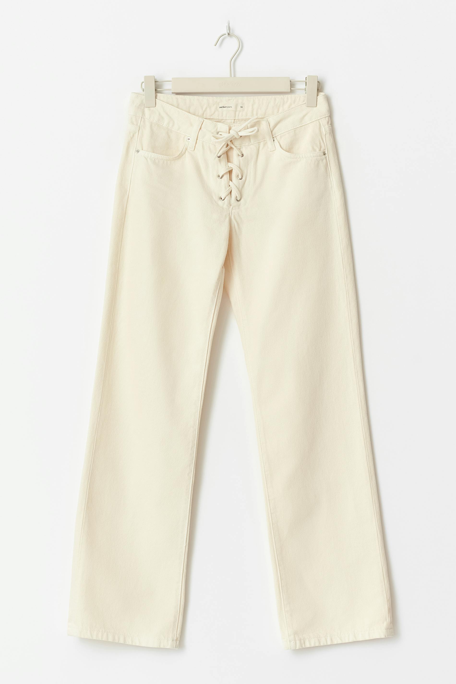 Low waist jeans med snörning vid grenen. Jeansen är vita och har raka ben med fullängd. De har låg midja, bälteshällor, normal passform och fickor fram och bak. Utan stretch.