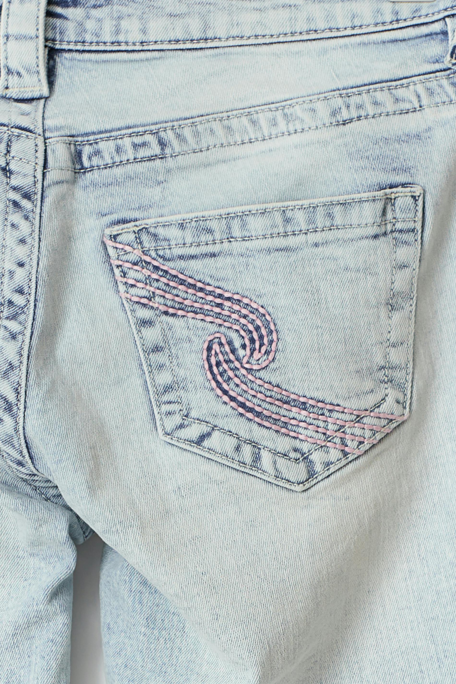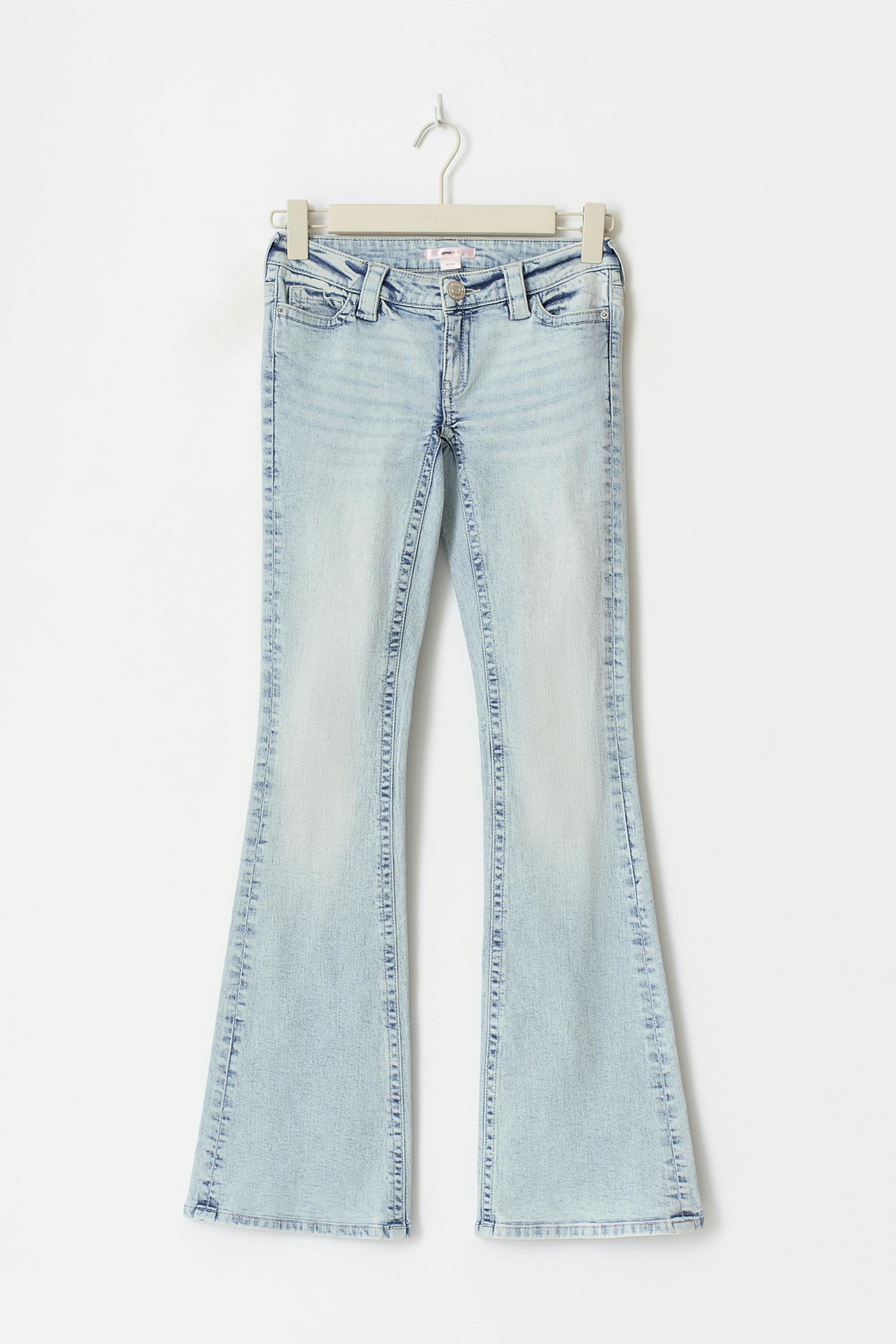 Tall flare jeans med extra långa ben. Jeansen är ljusblåa och har låg midja. De har utsvängda ben, bälteshällor, framfickor och broderade bakfickor.