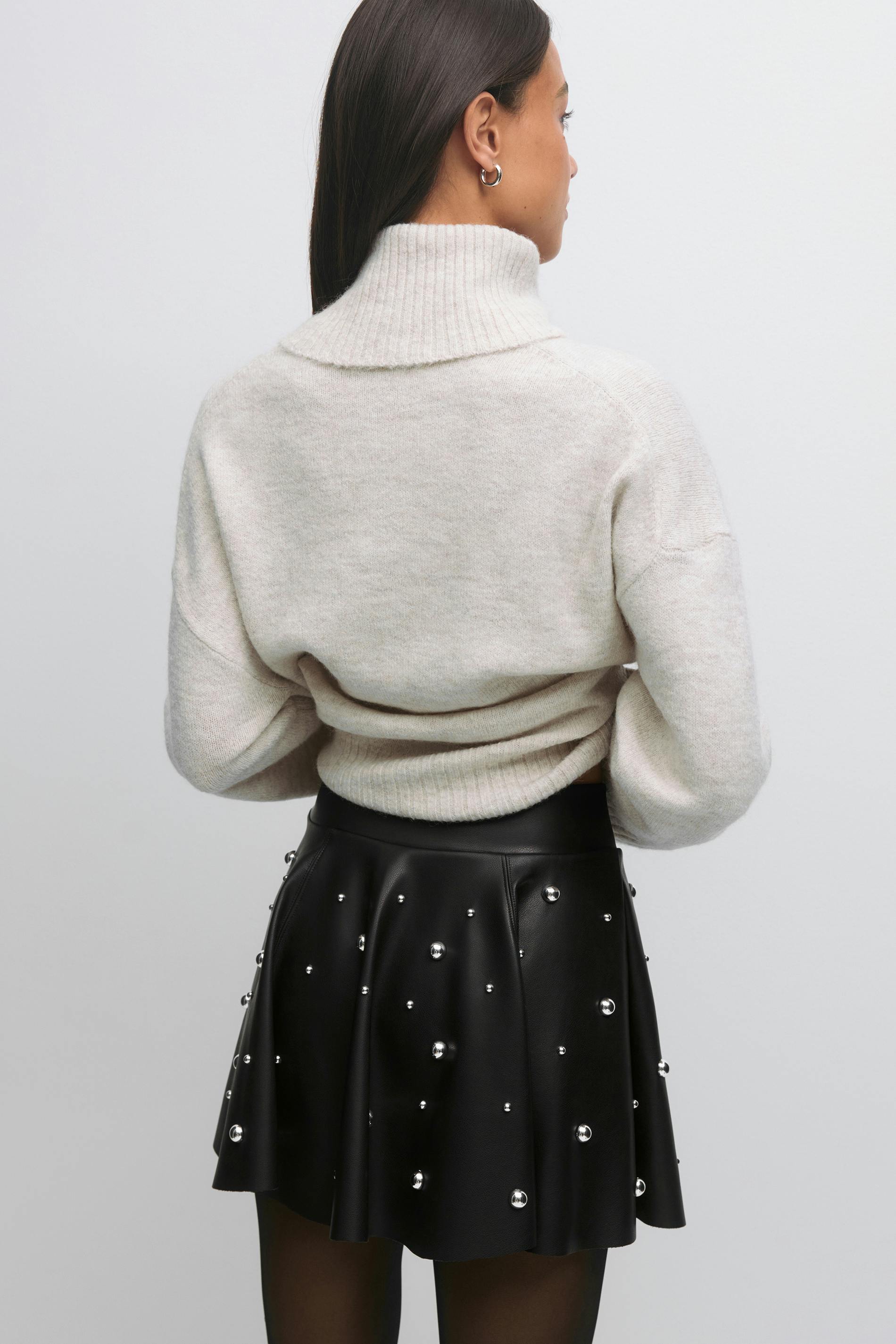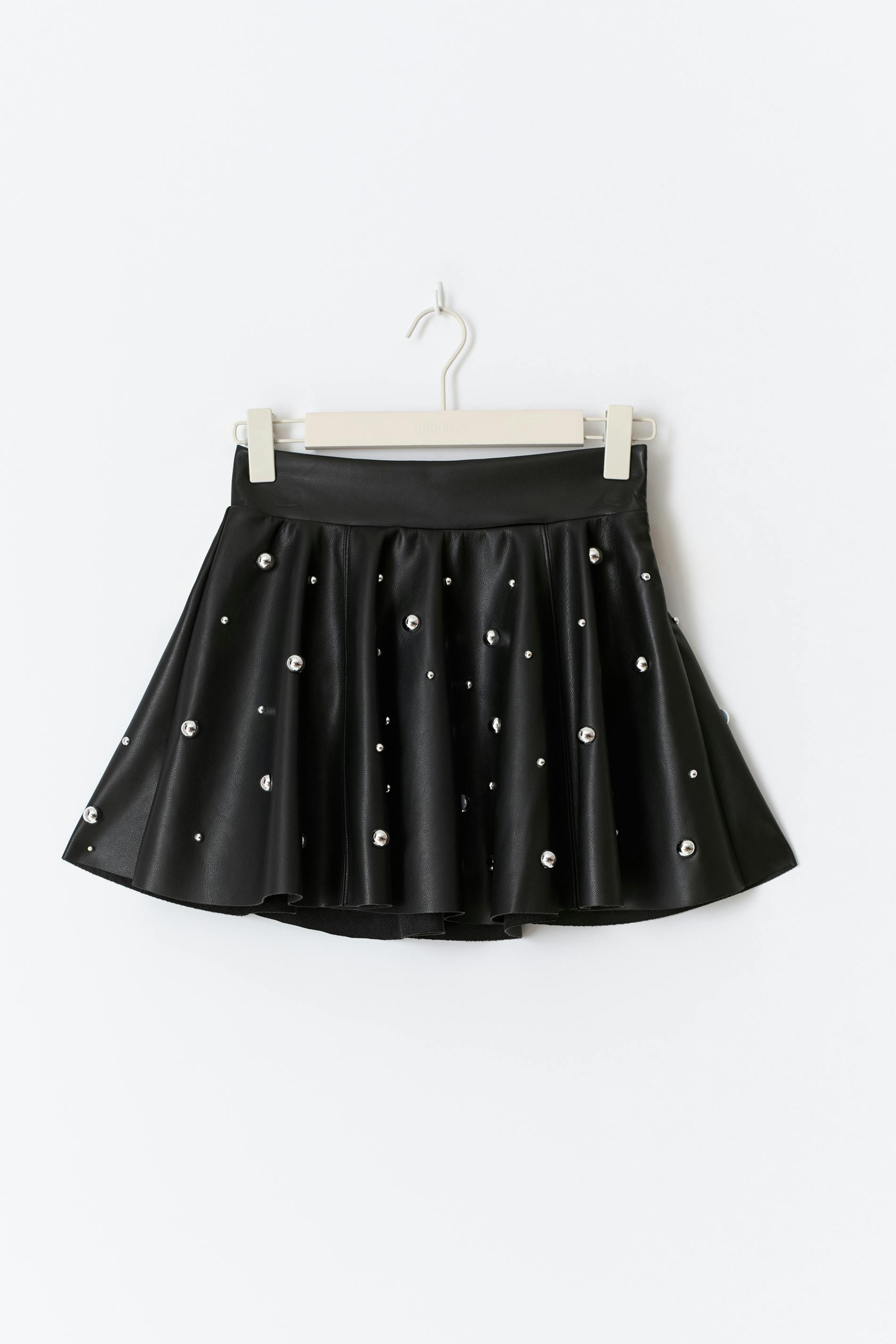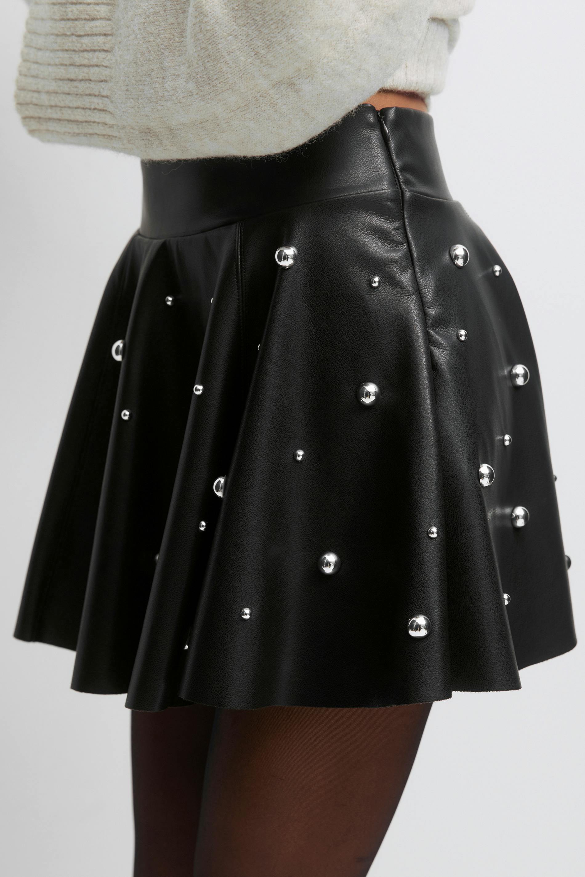 Kort kjol i skinnimitation med metallnitar. Kjolen är svart och har en veckad design. Den har en dragkedjestängning i sidan, en medelhög midja och en normal passform.