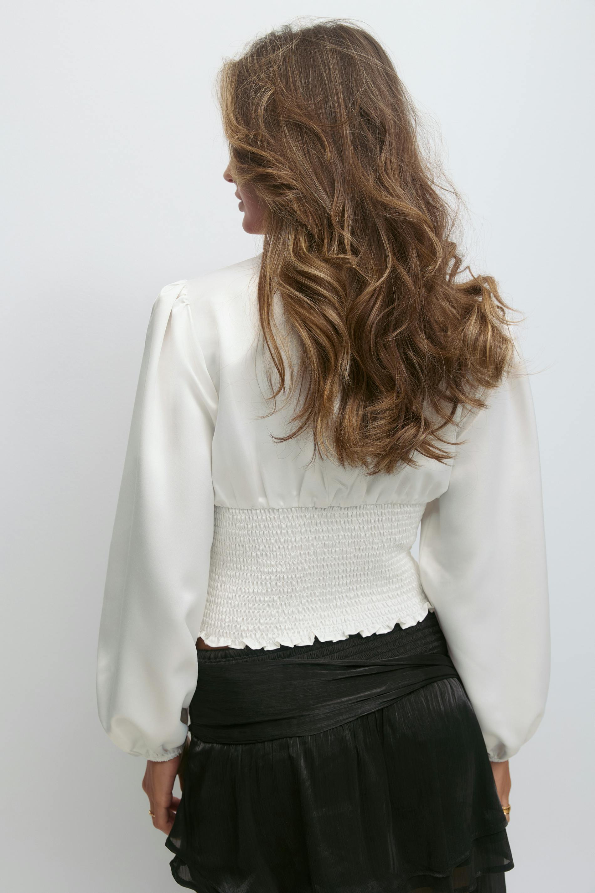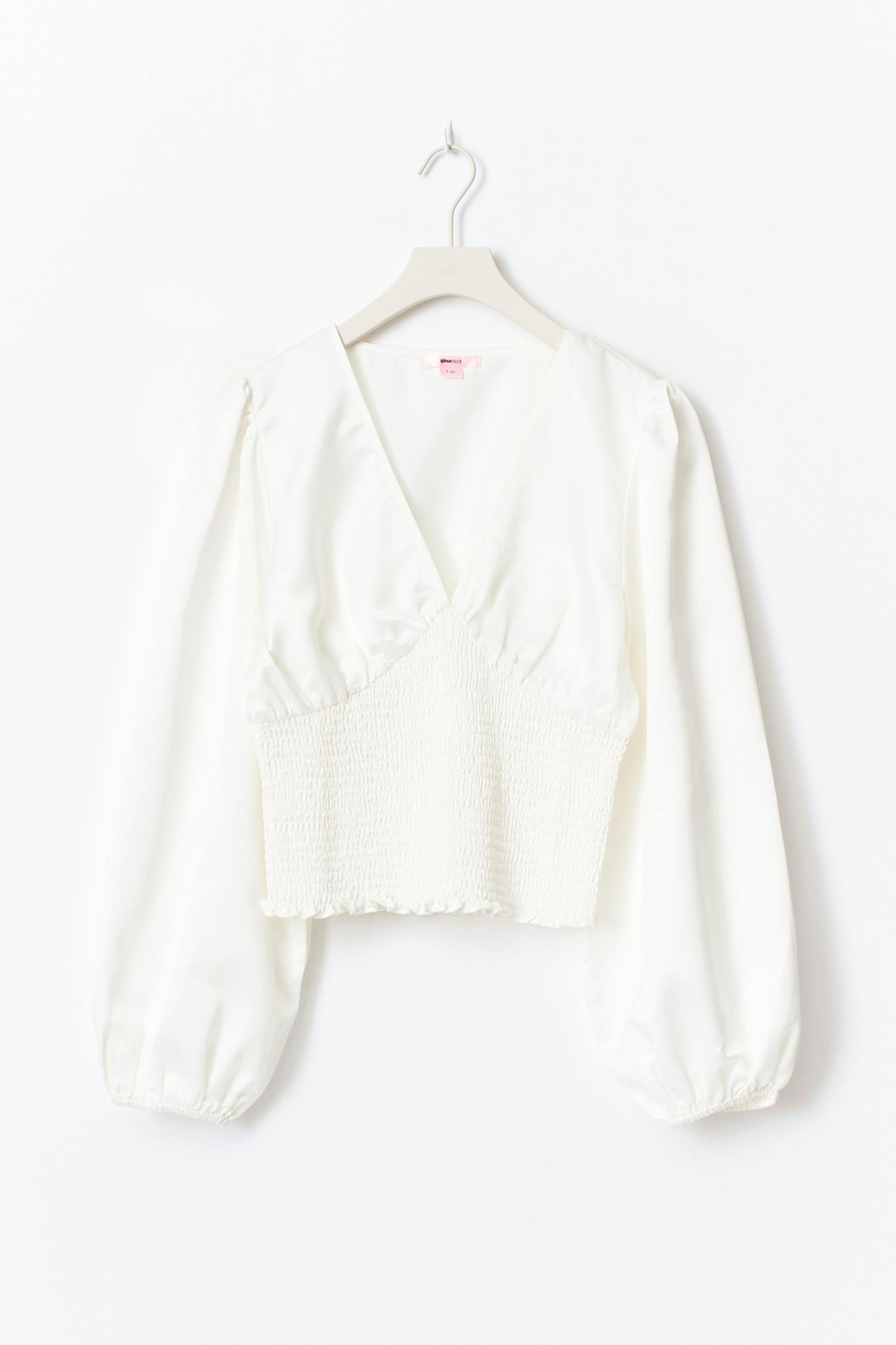Blus i satin med en lång ärm. Blusen är vit och har en v-ringning. Den har smockad midja.