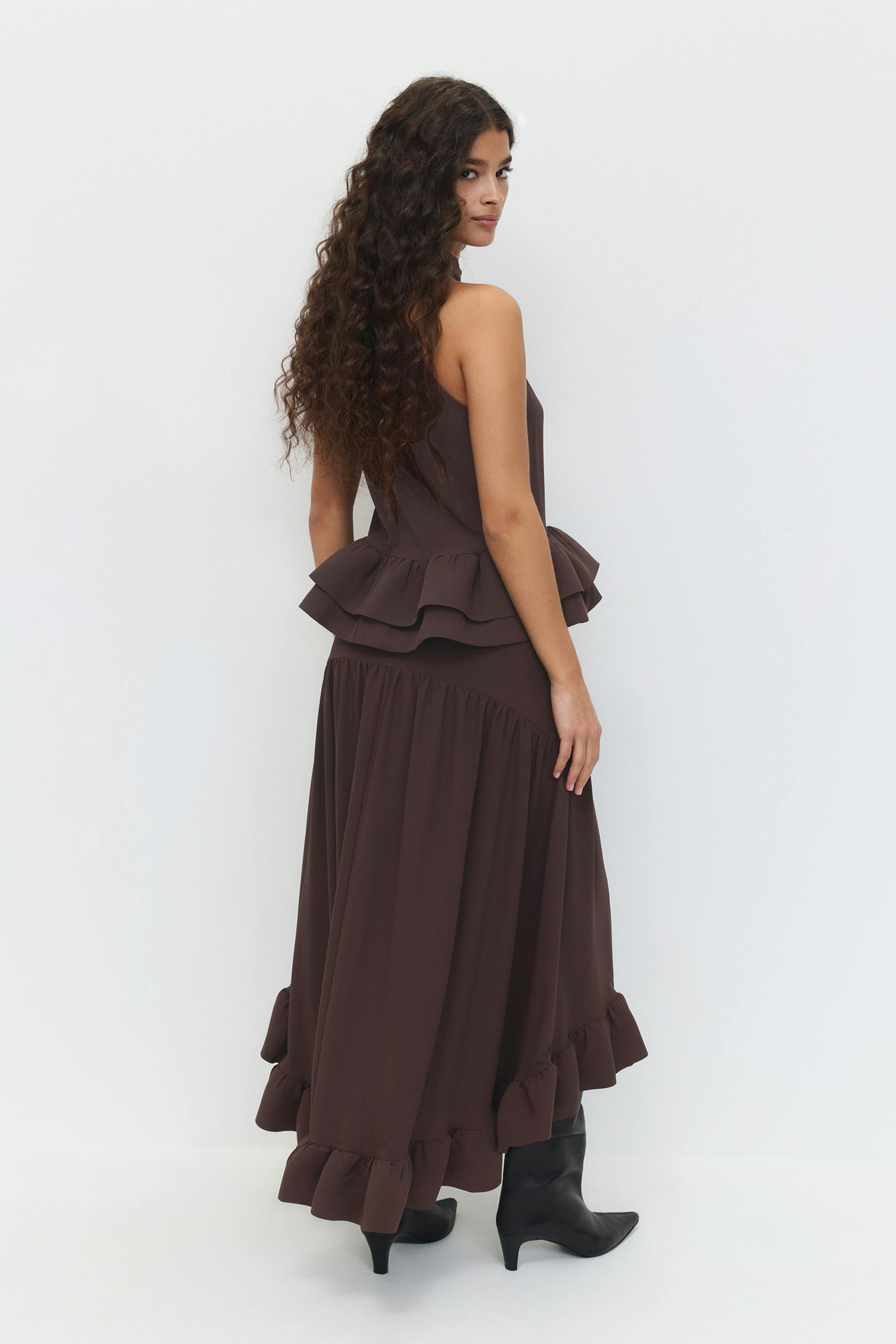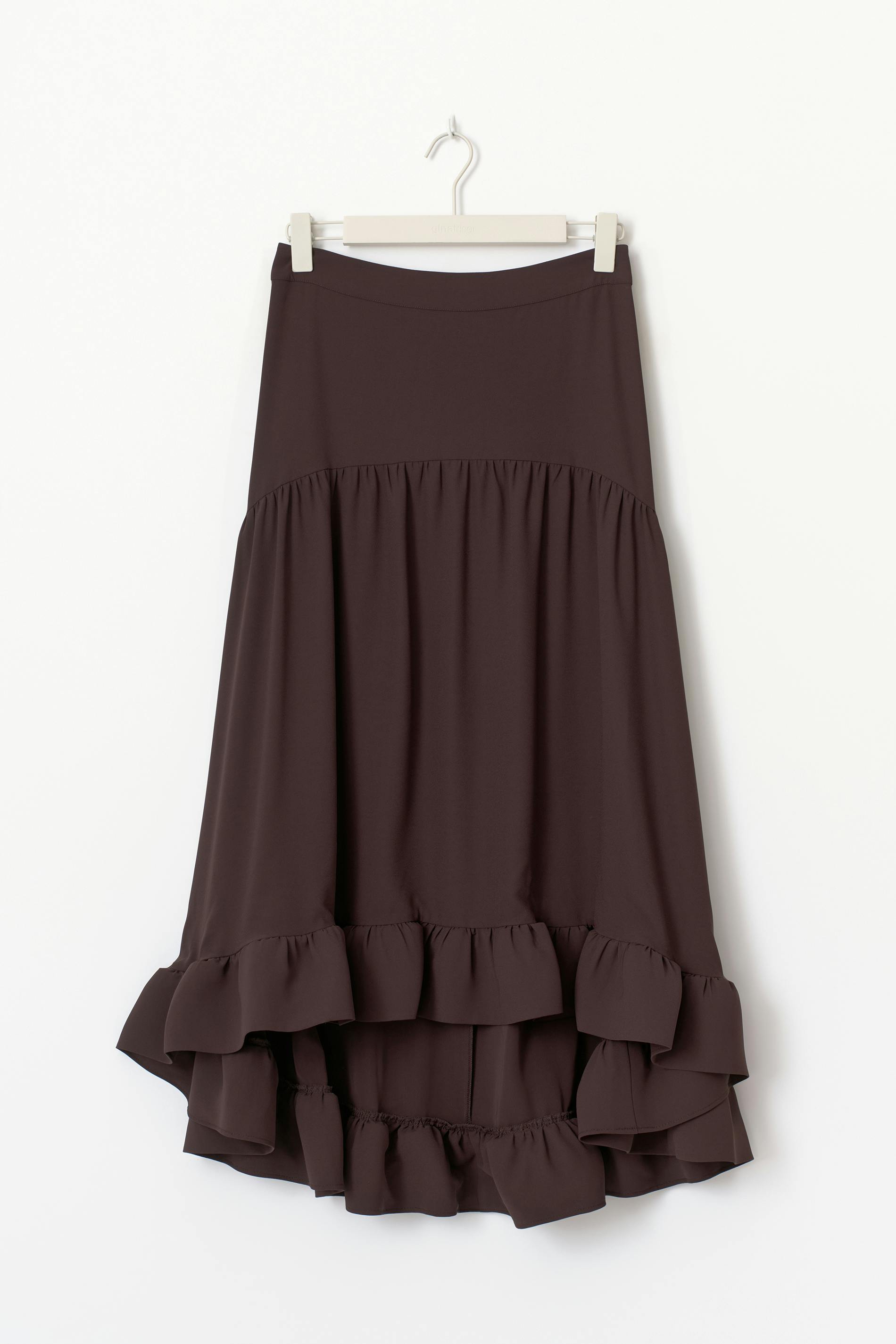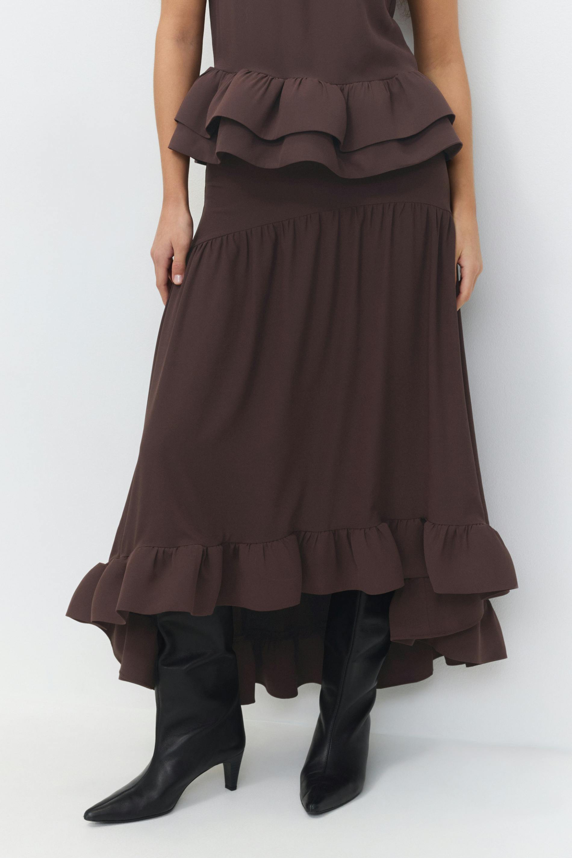 Långkjol med en volang nedtill. Kjolen är mörkbrun och har en normalhög midja. Den har sömdetaljer, en hysk- och hakestängning och en normal passform.