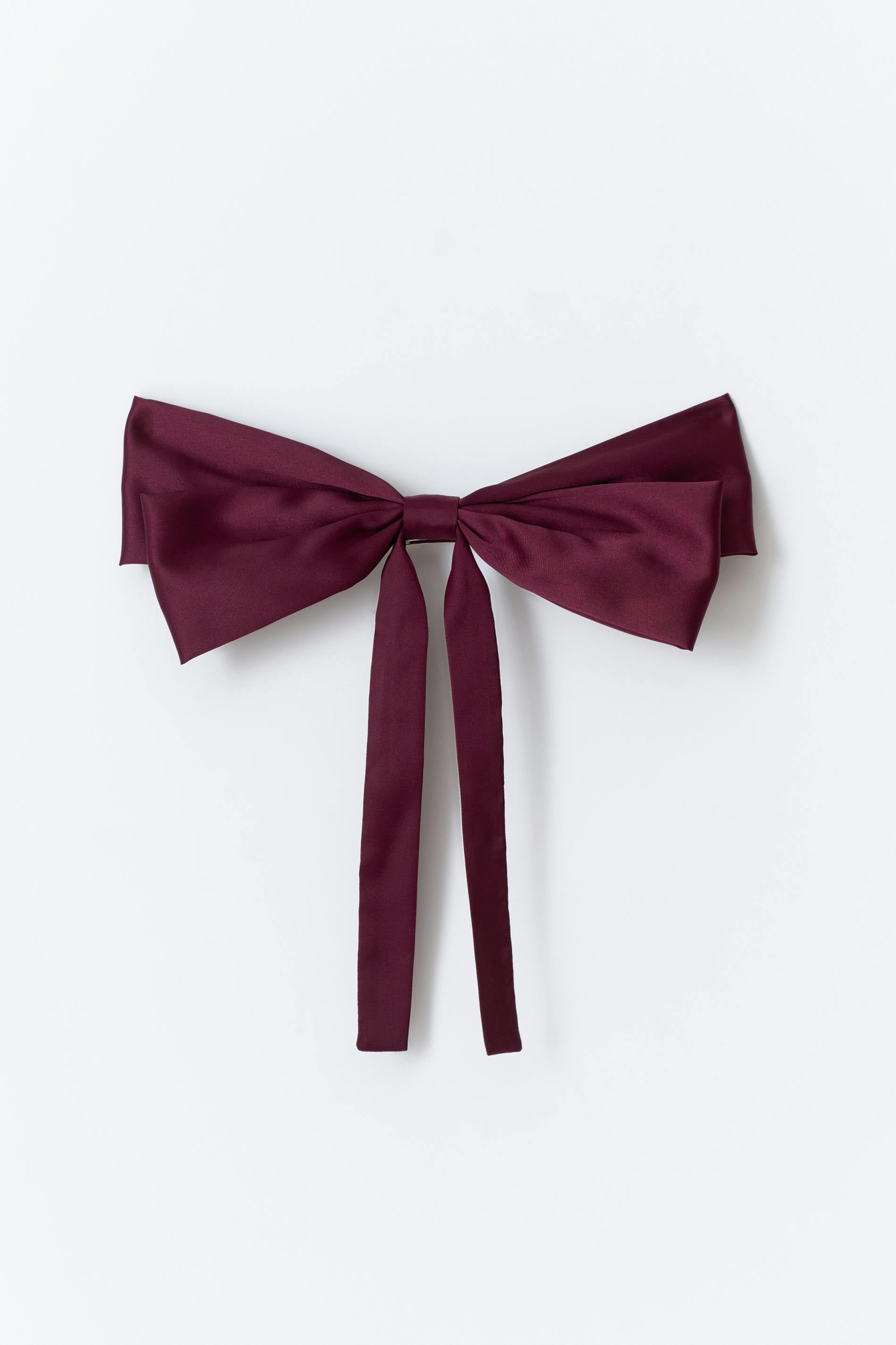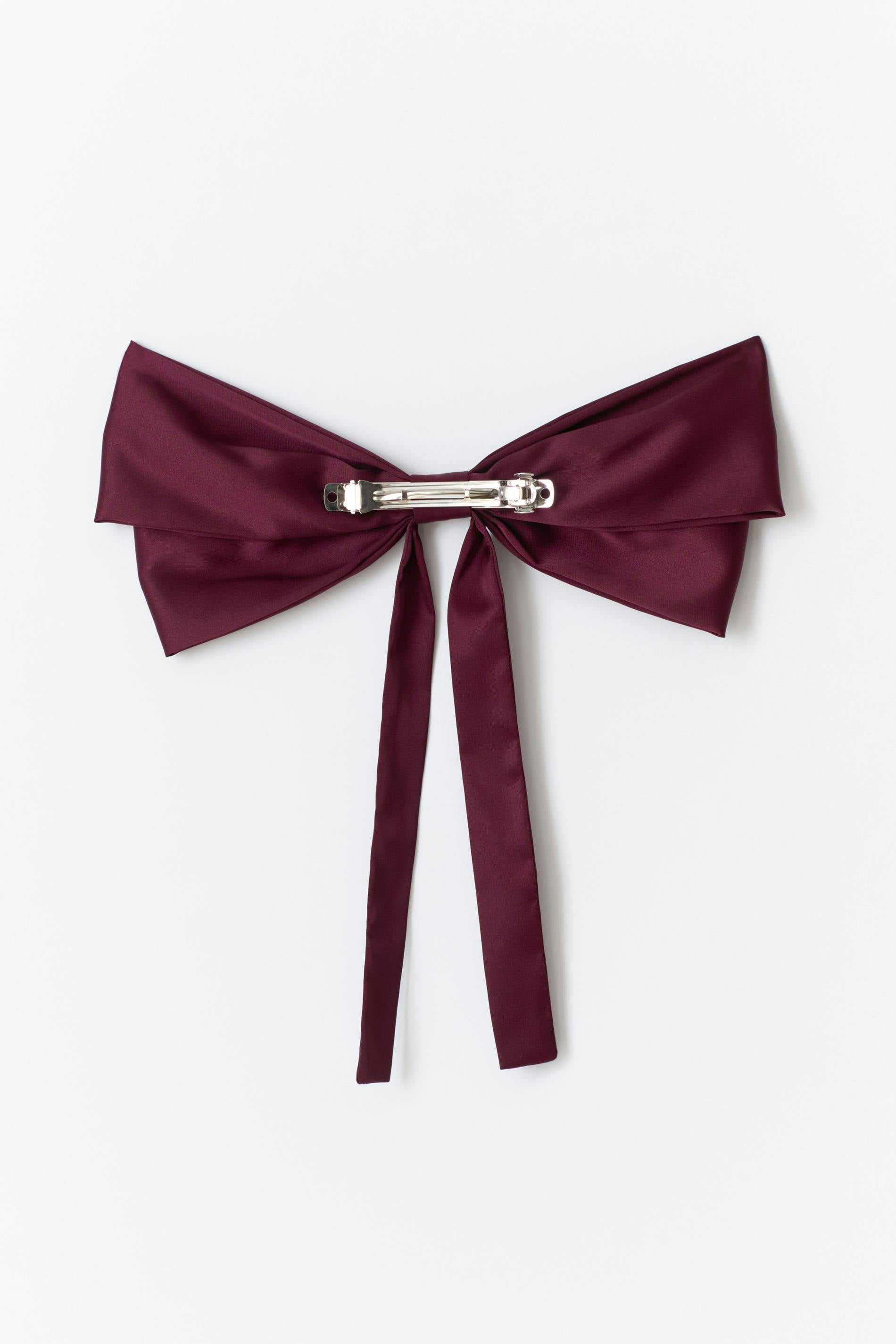 Rosett i satin med hårklämma bak. Rosetten är röd.