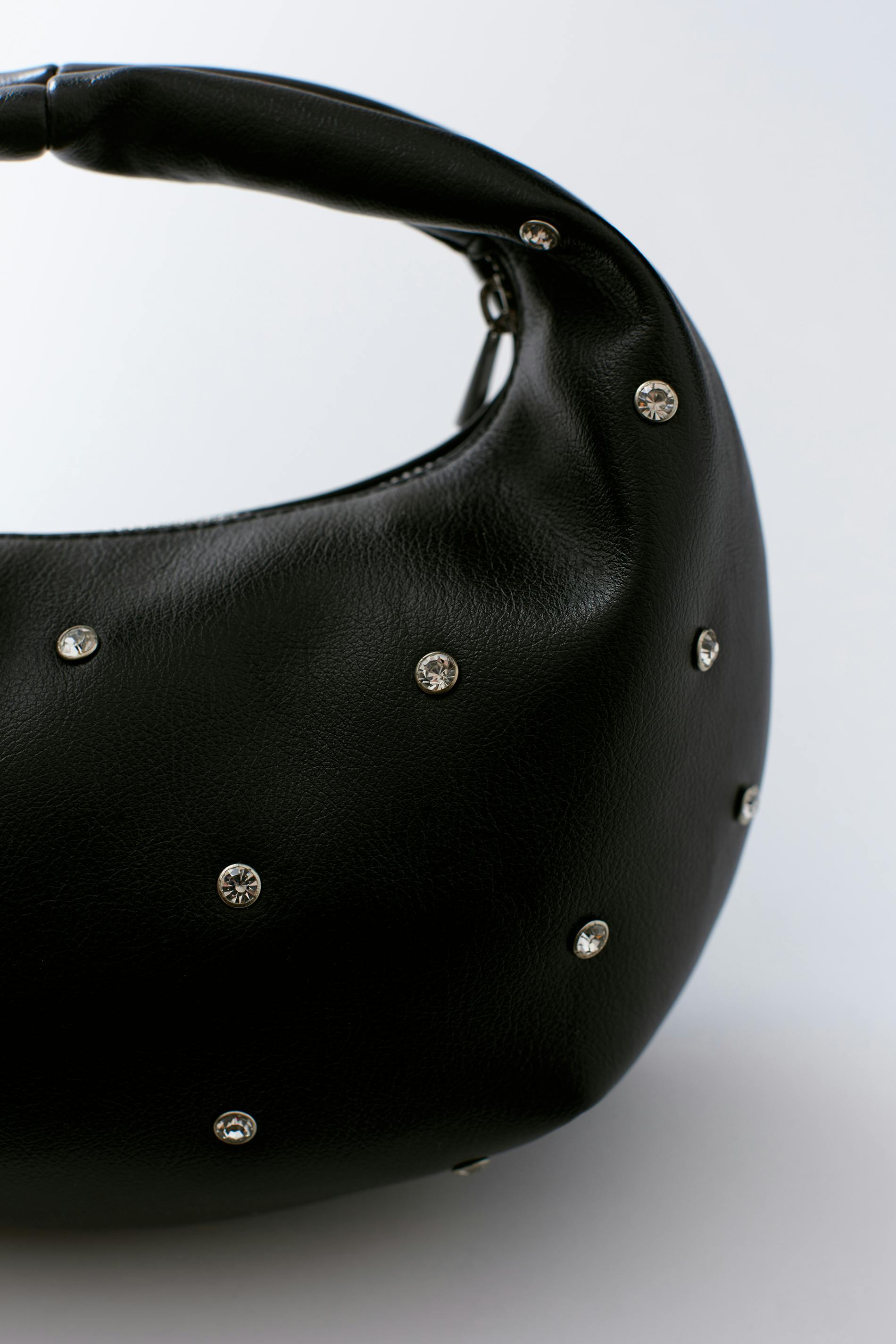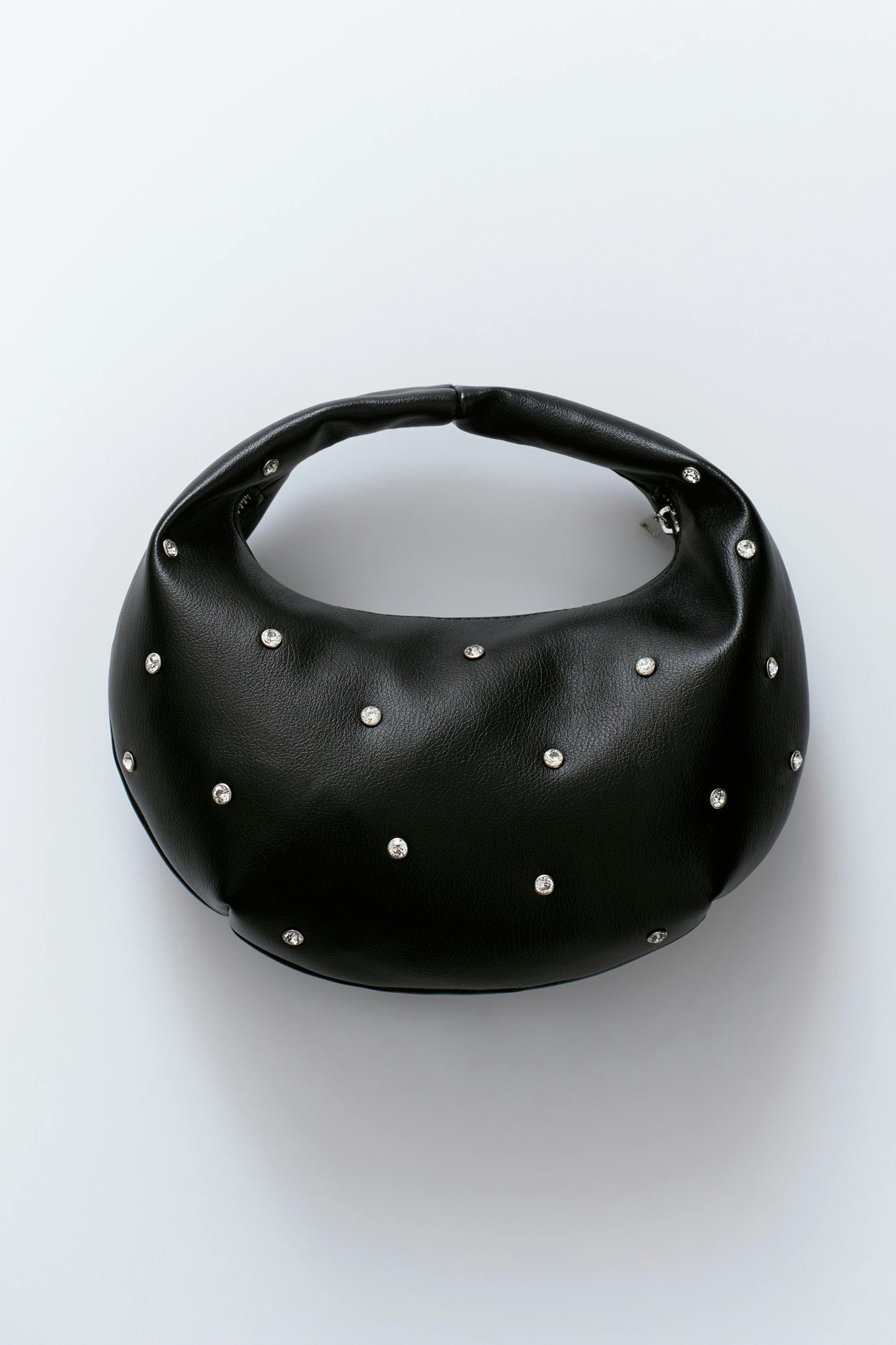 Liten handväska i skinnimitation med strassdetaljer. Handväskan är svart och har en ovalformad design. Den har dragkedjestängning, en innerficka och innerfoder.
