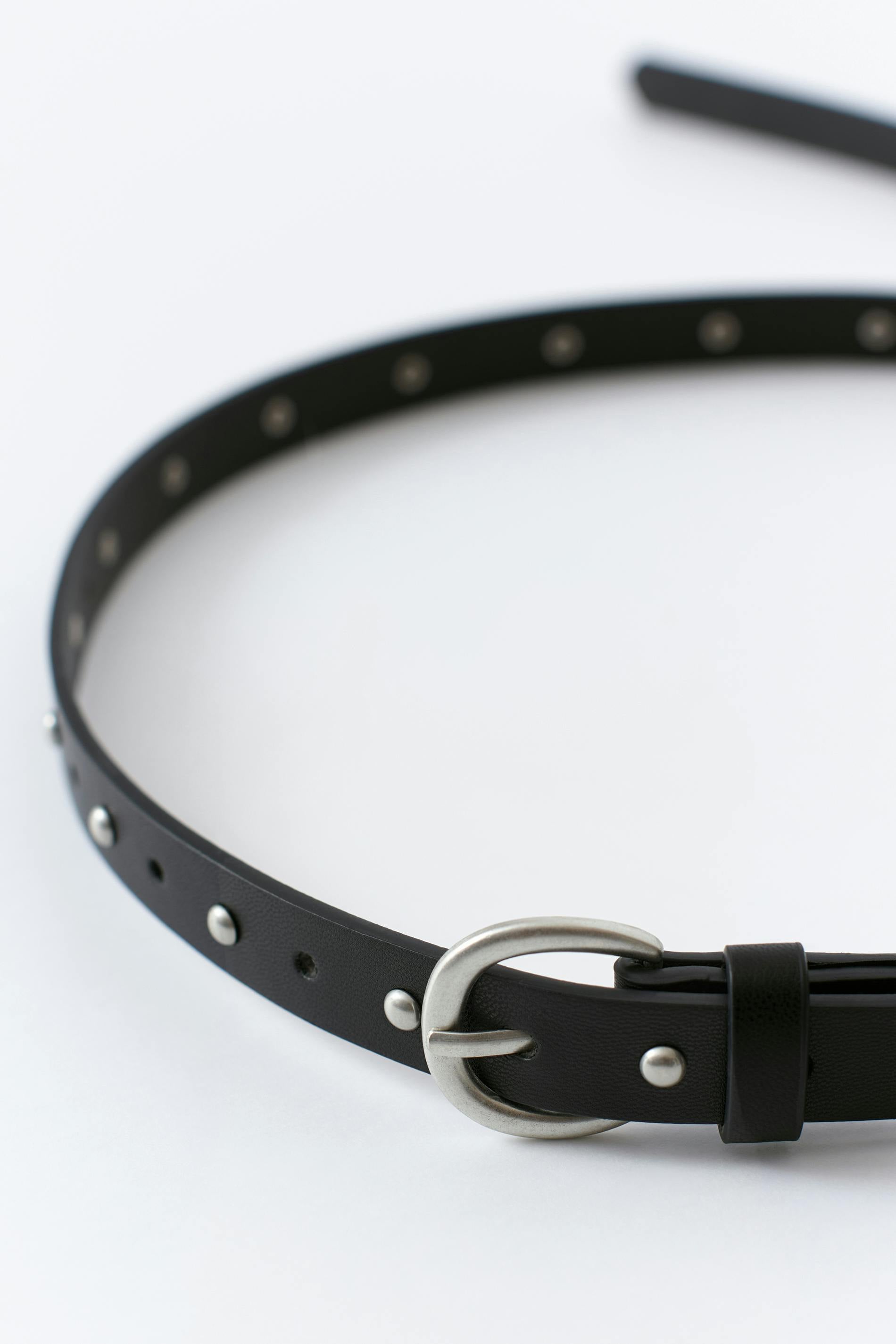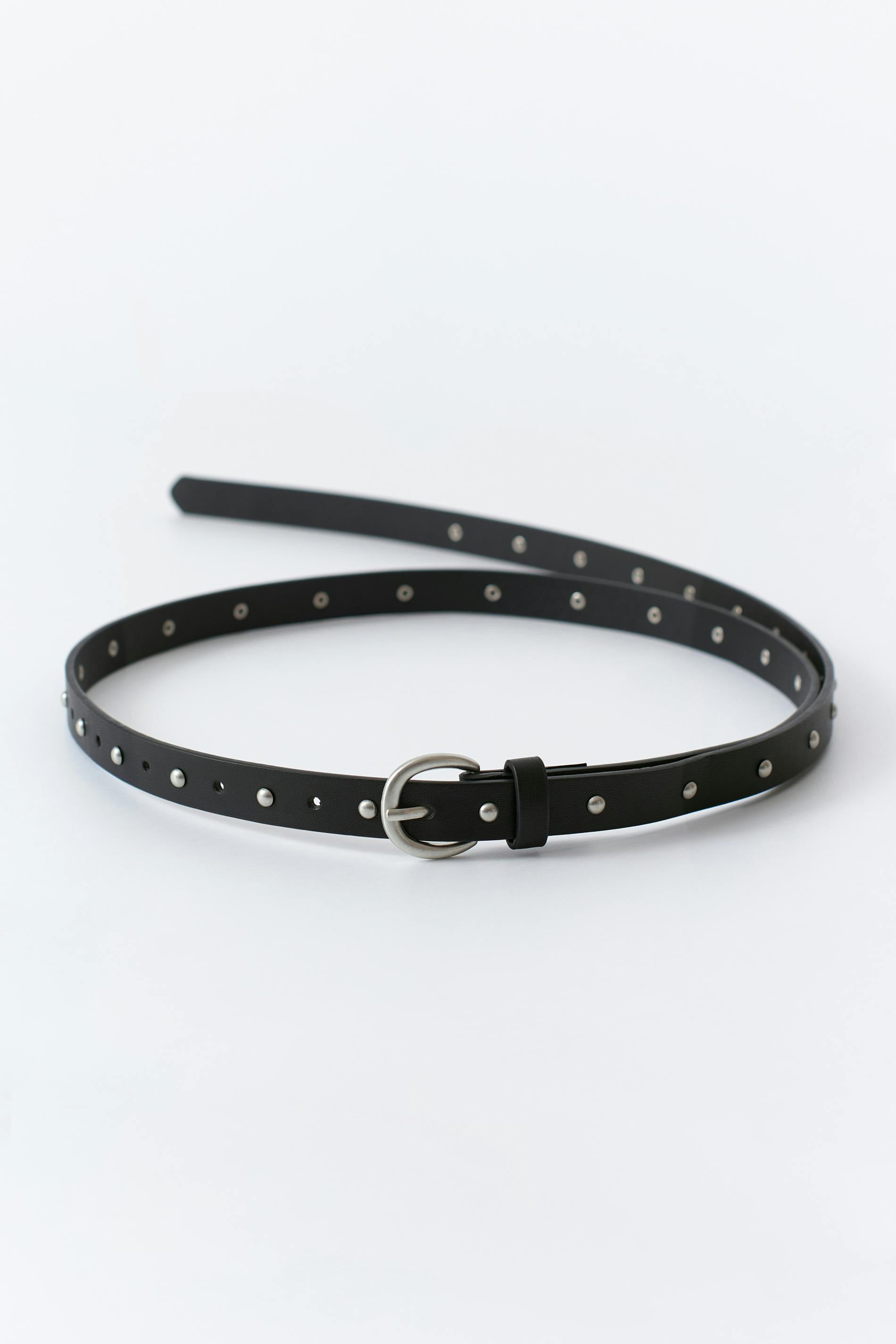 Bälte med nitar. Bältet är silverfärgat och svart och har ett metallspänne. Det har en justerbar rem.