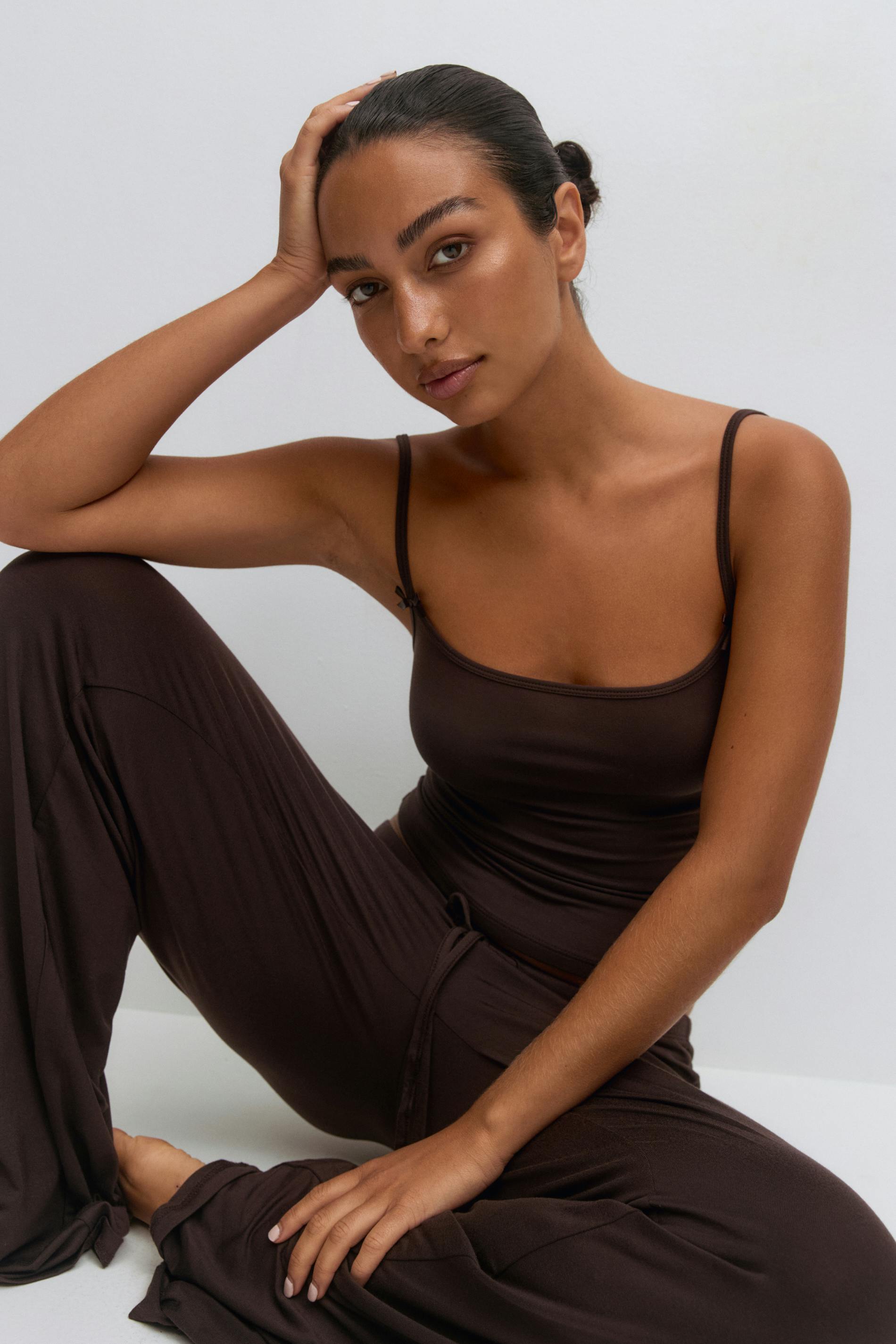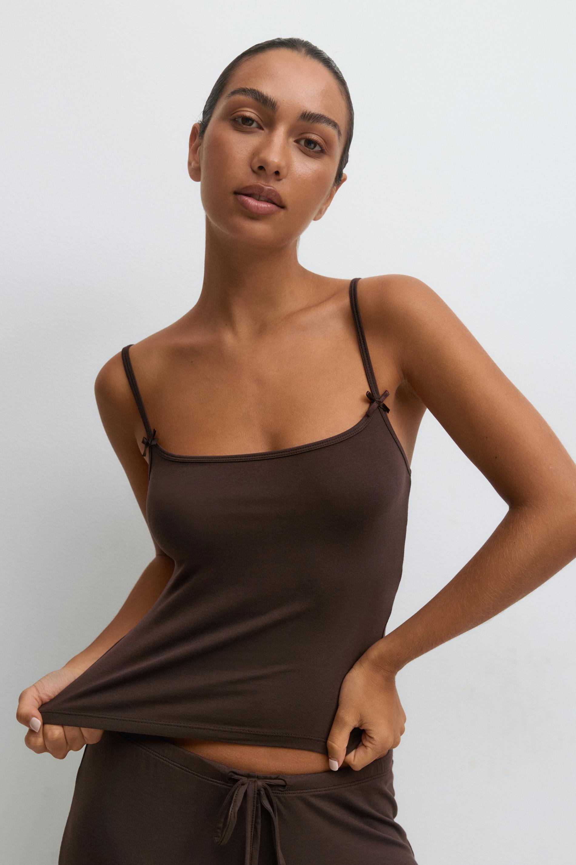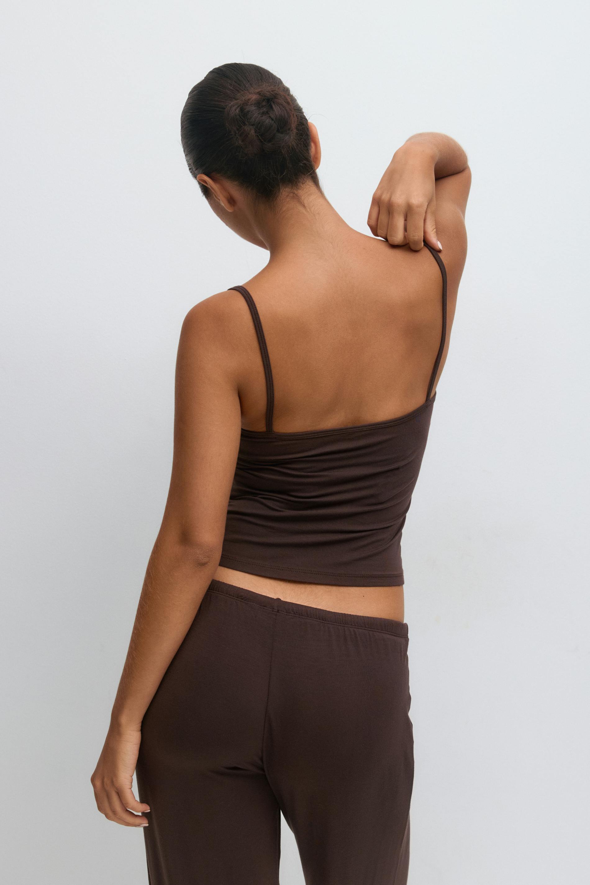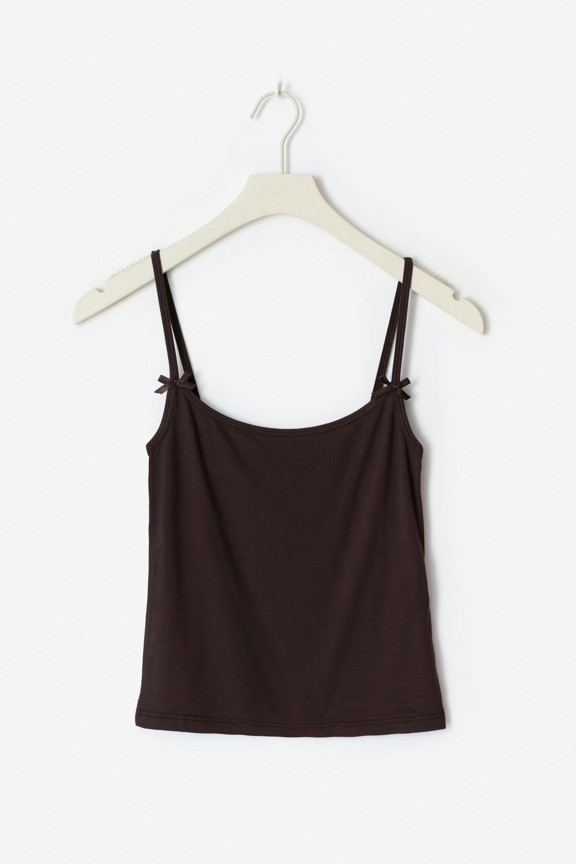 Linne med u-ringning. Linnet är brunt och har smala axelband med rosetter. Det har normal passform, kort längd och ett mjukt, stretchigt material.