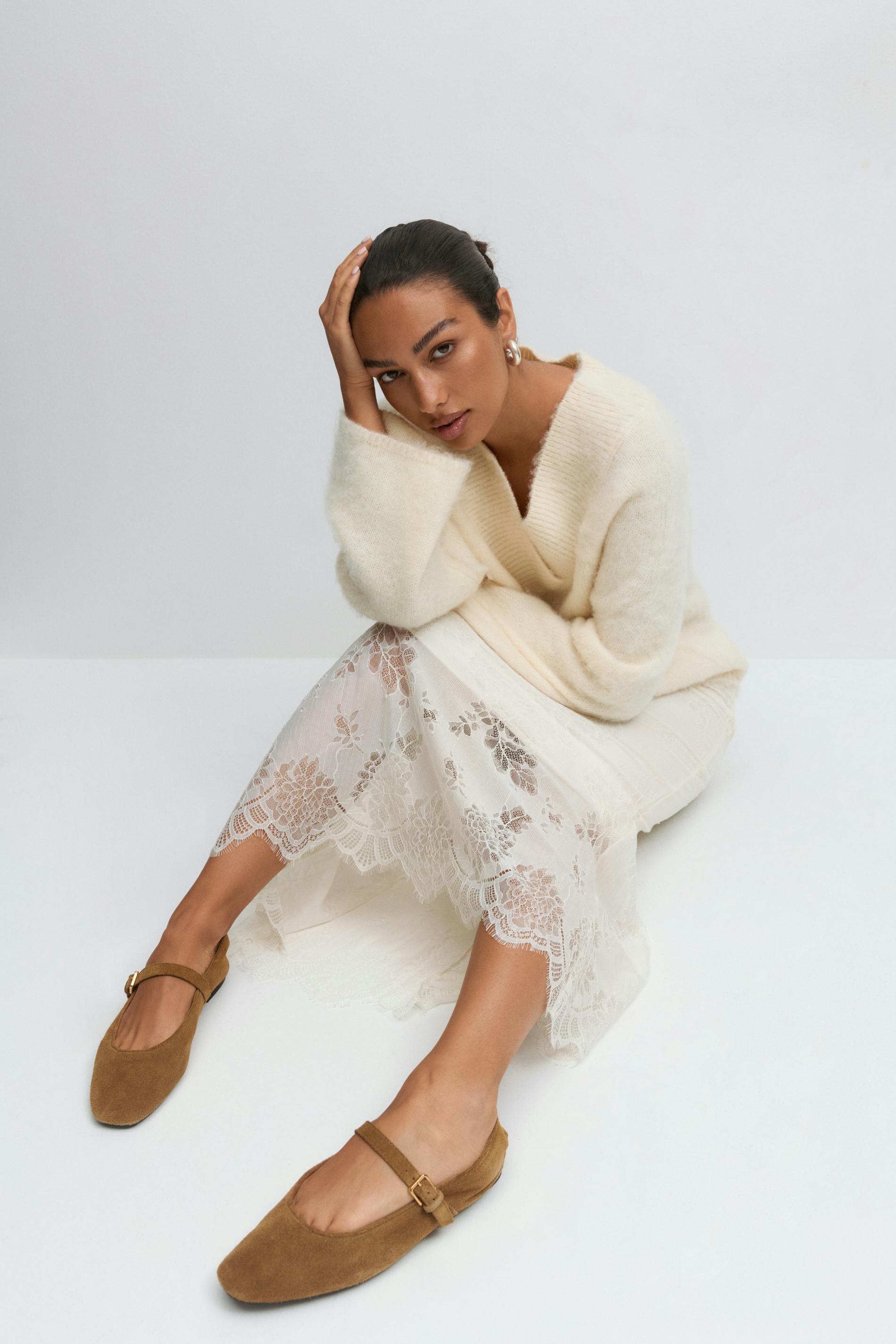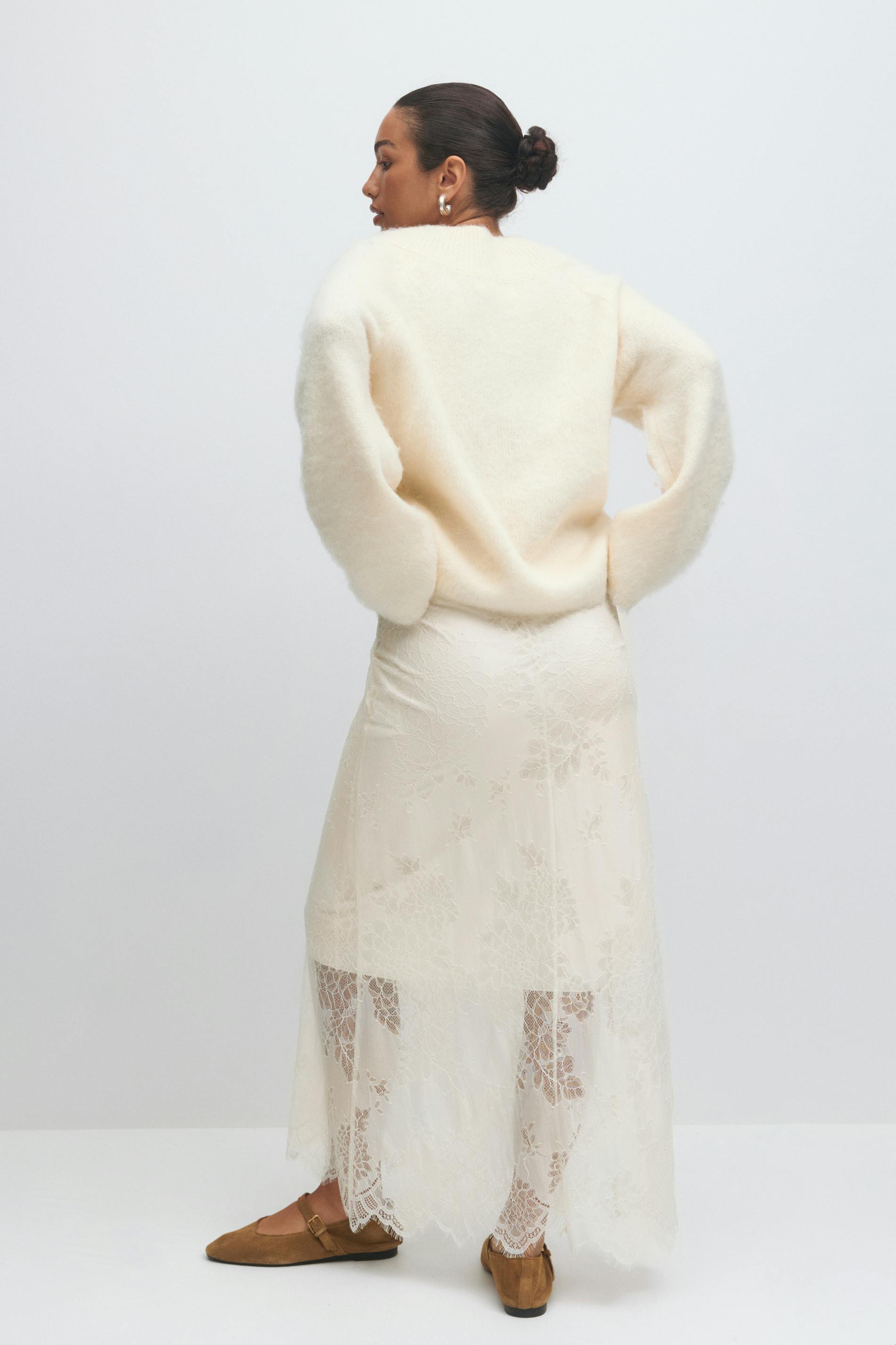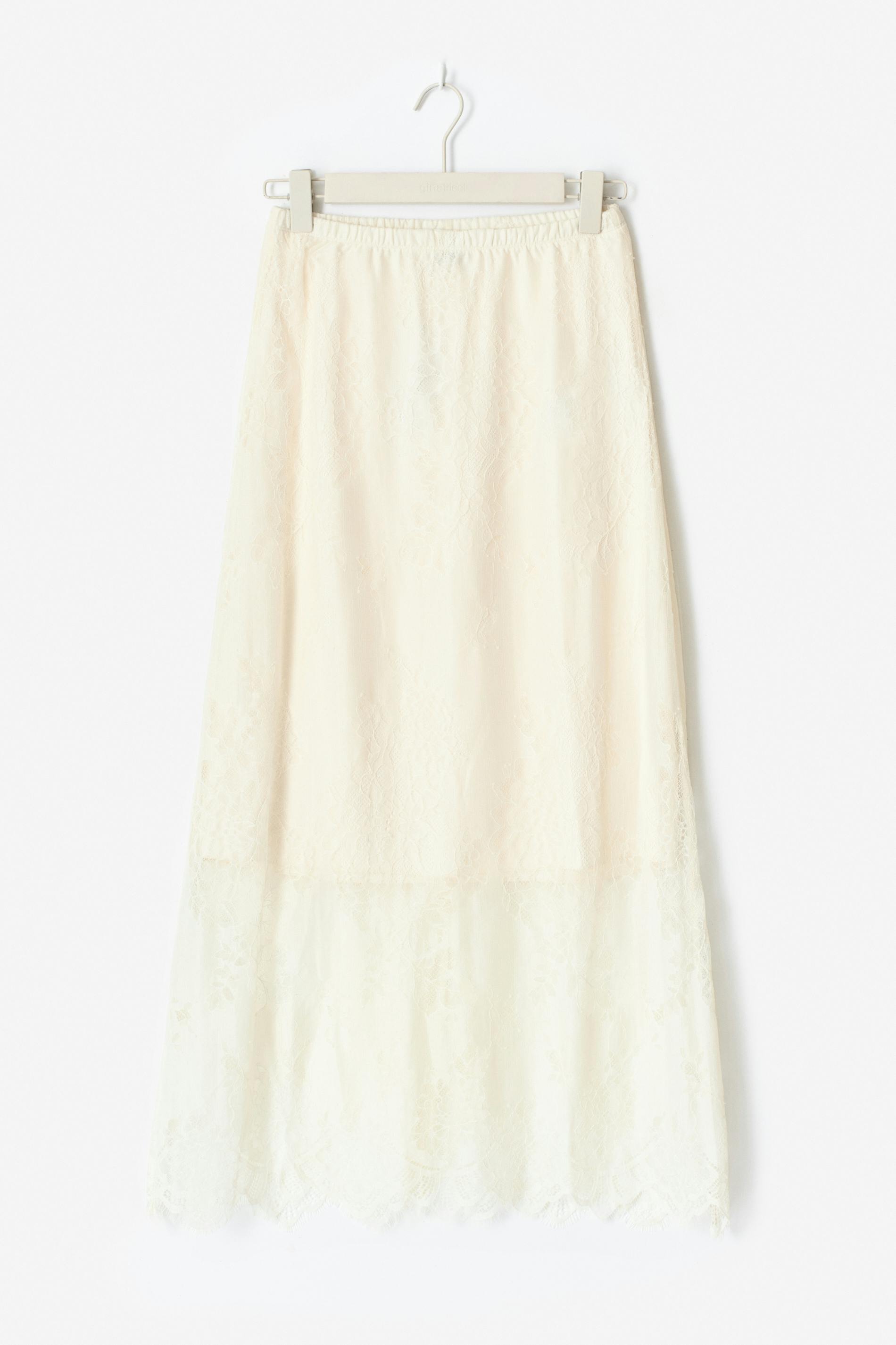 Lång spetskjol med foder. Kjolen är vit och har resår. Den har normal passform, midilängd och hög midja.