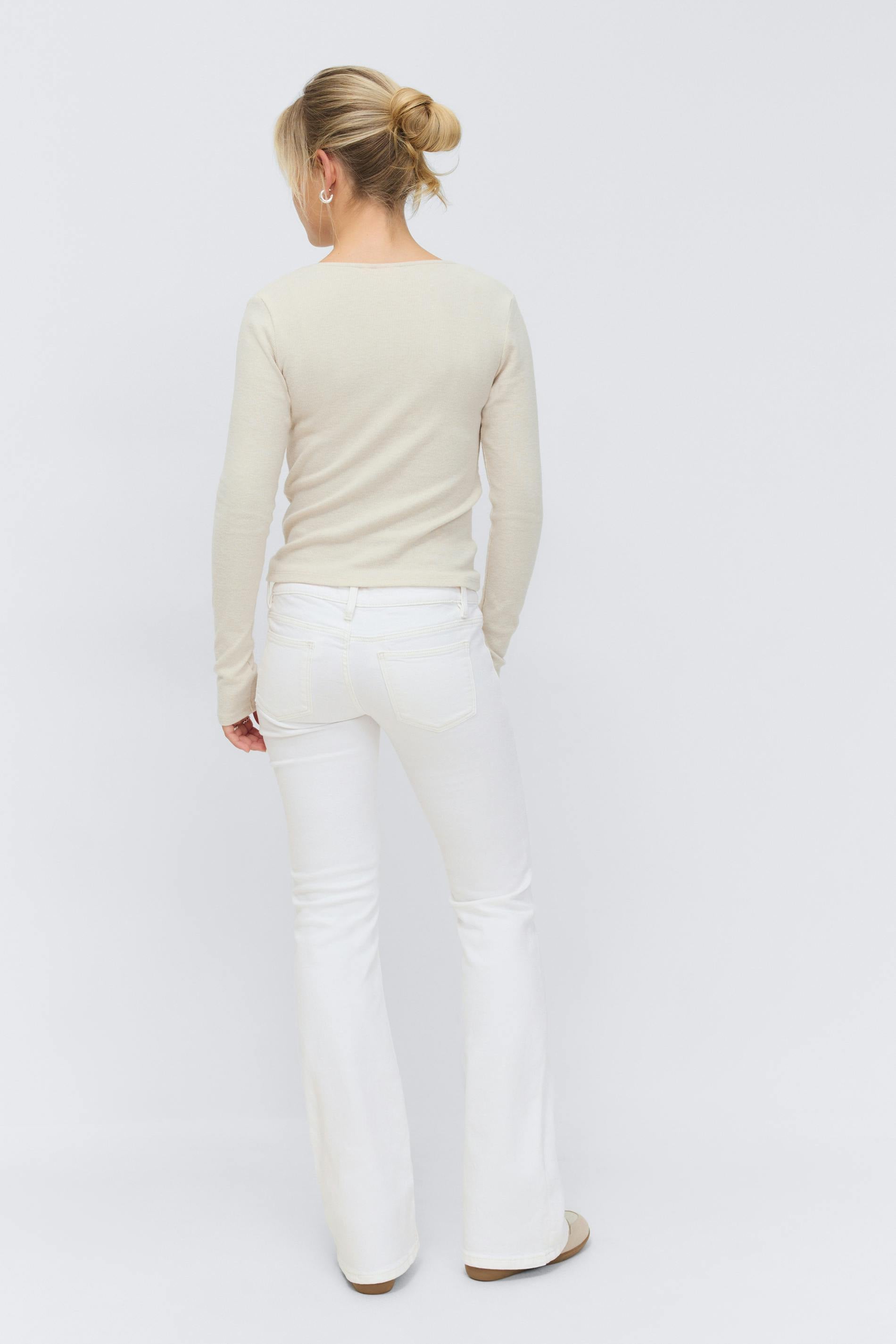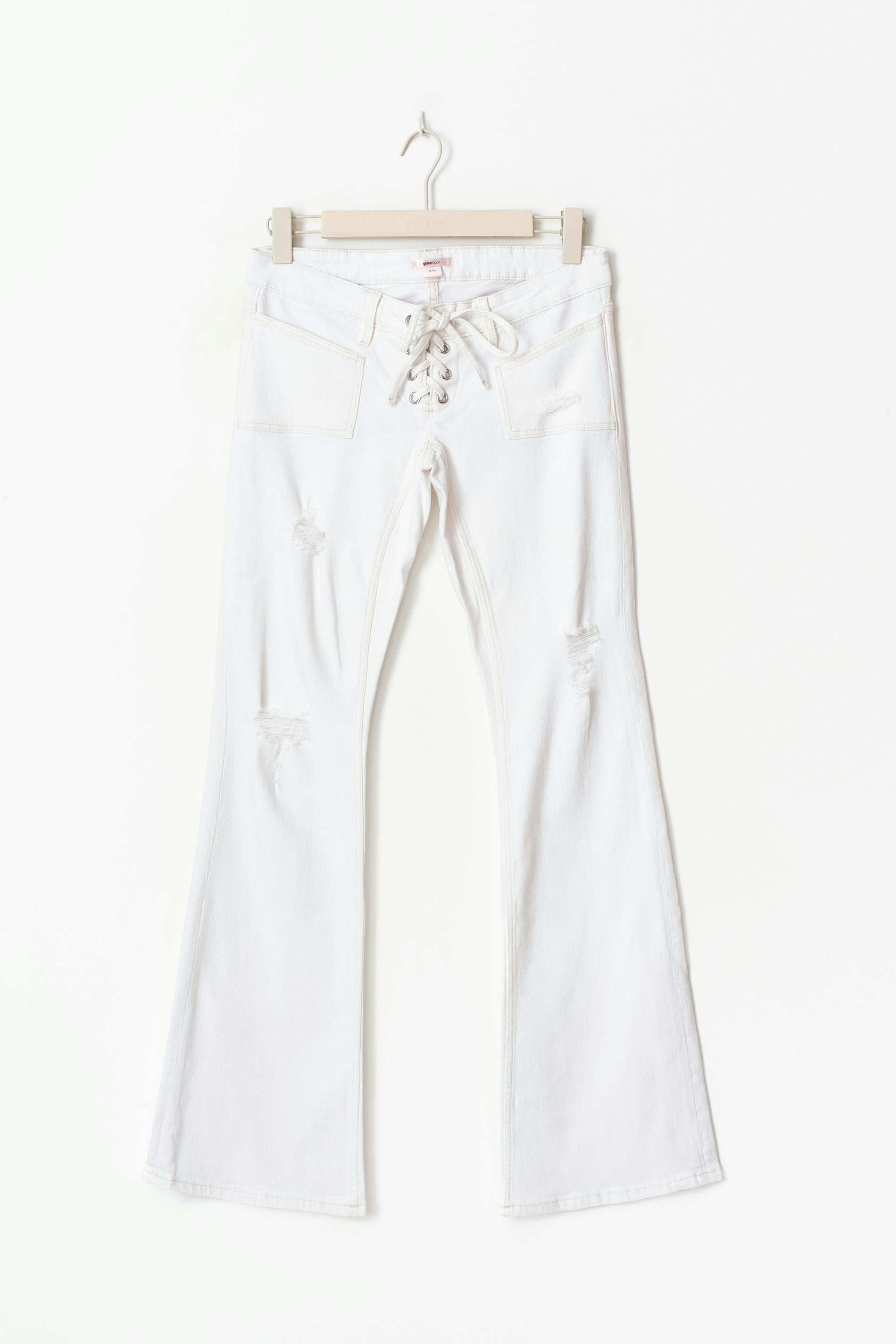 Flare jeans med låg midja. Jeansen är vita och har fickor fram och baktill. De har en snörning framtill, låg stretch, slitningar och en normal passform.