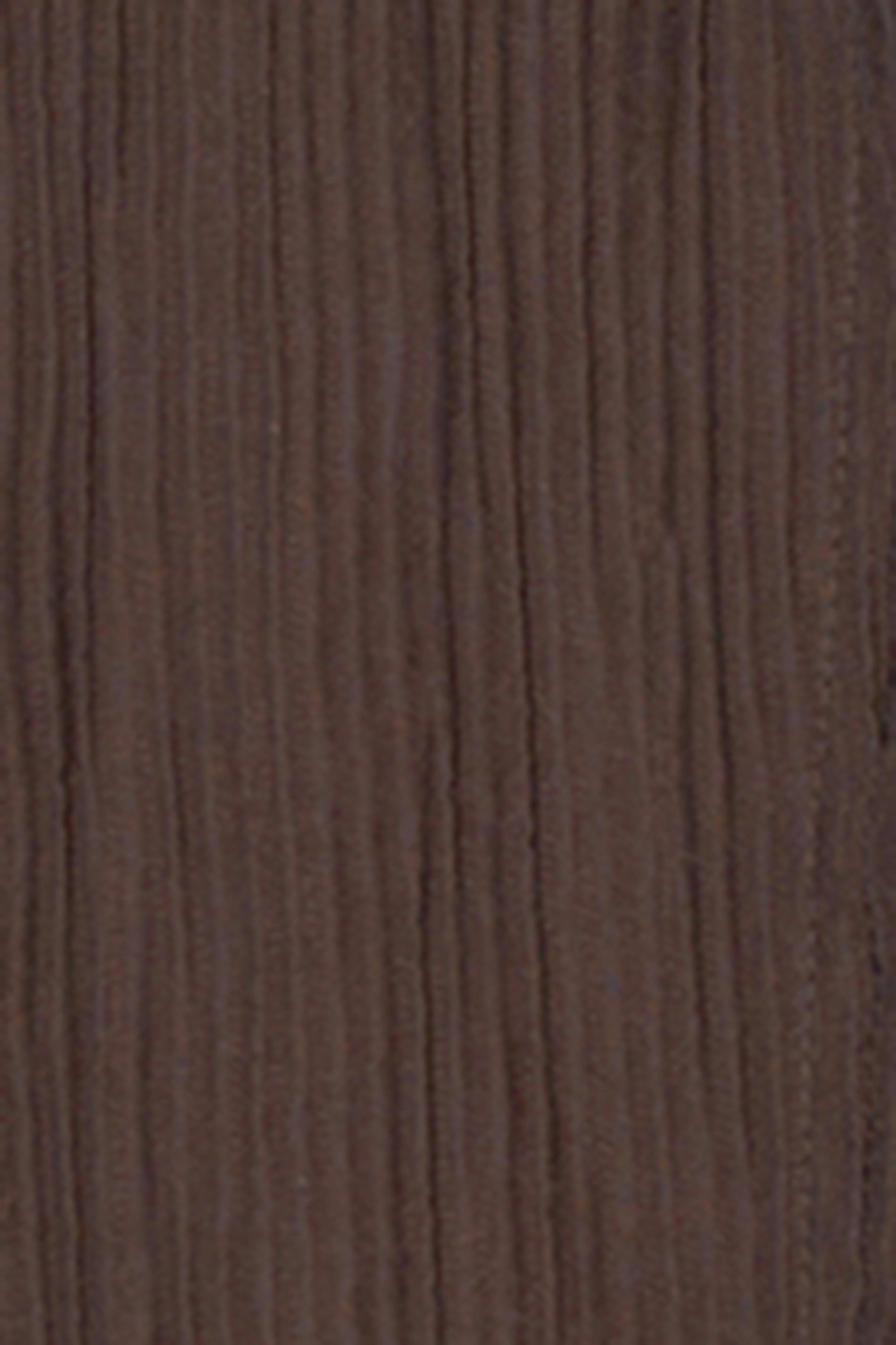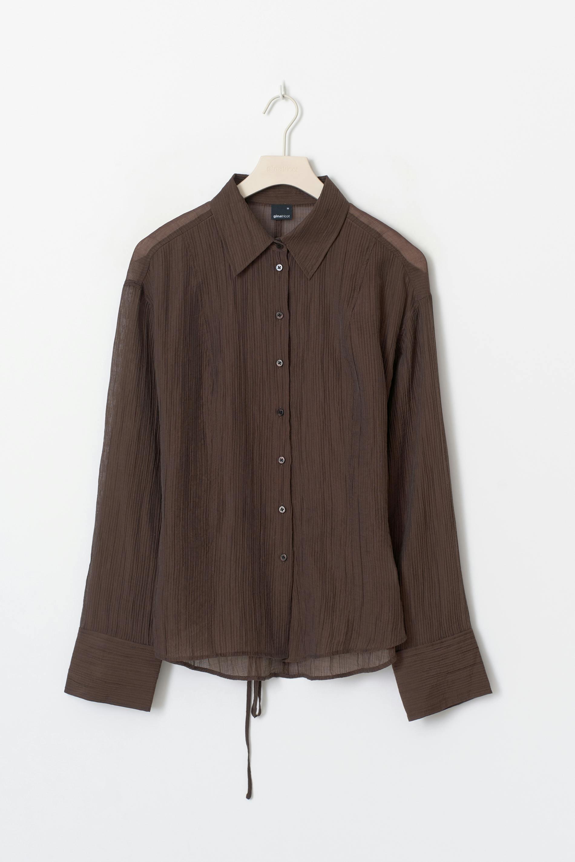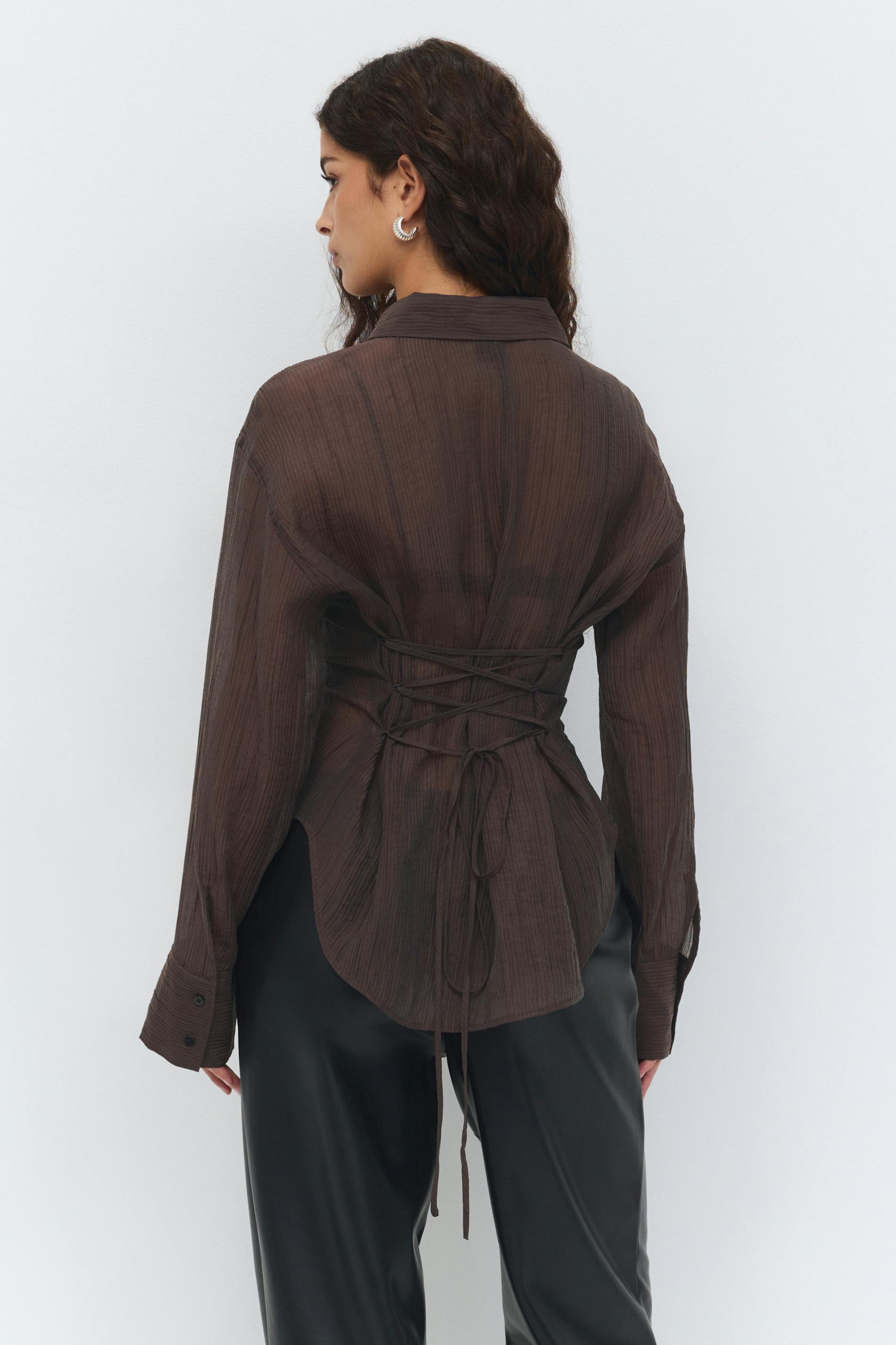 Figursydd skjorta med en lång ärm. Skjortan är brun och har knappar framtill. Den har sömdetalj i midjan, en krage och en knytdetalj baktill.