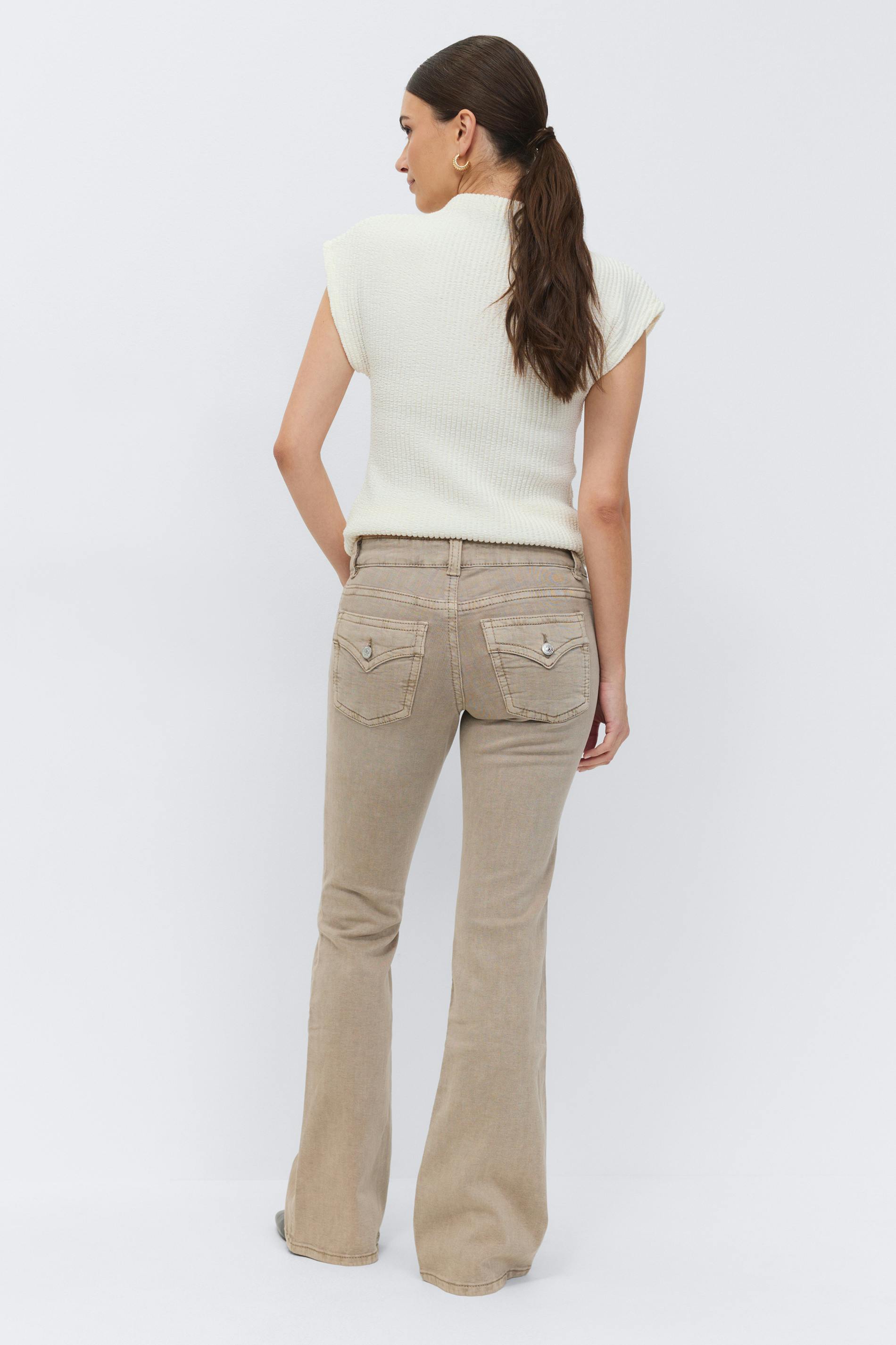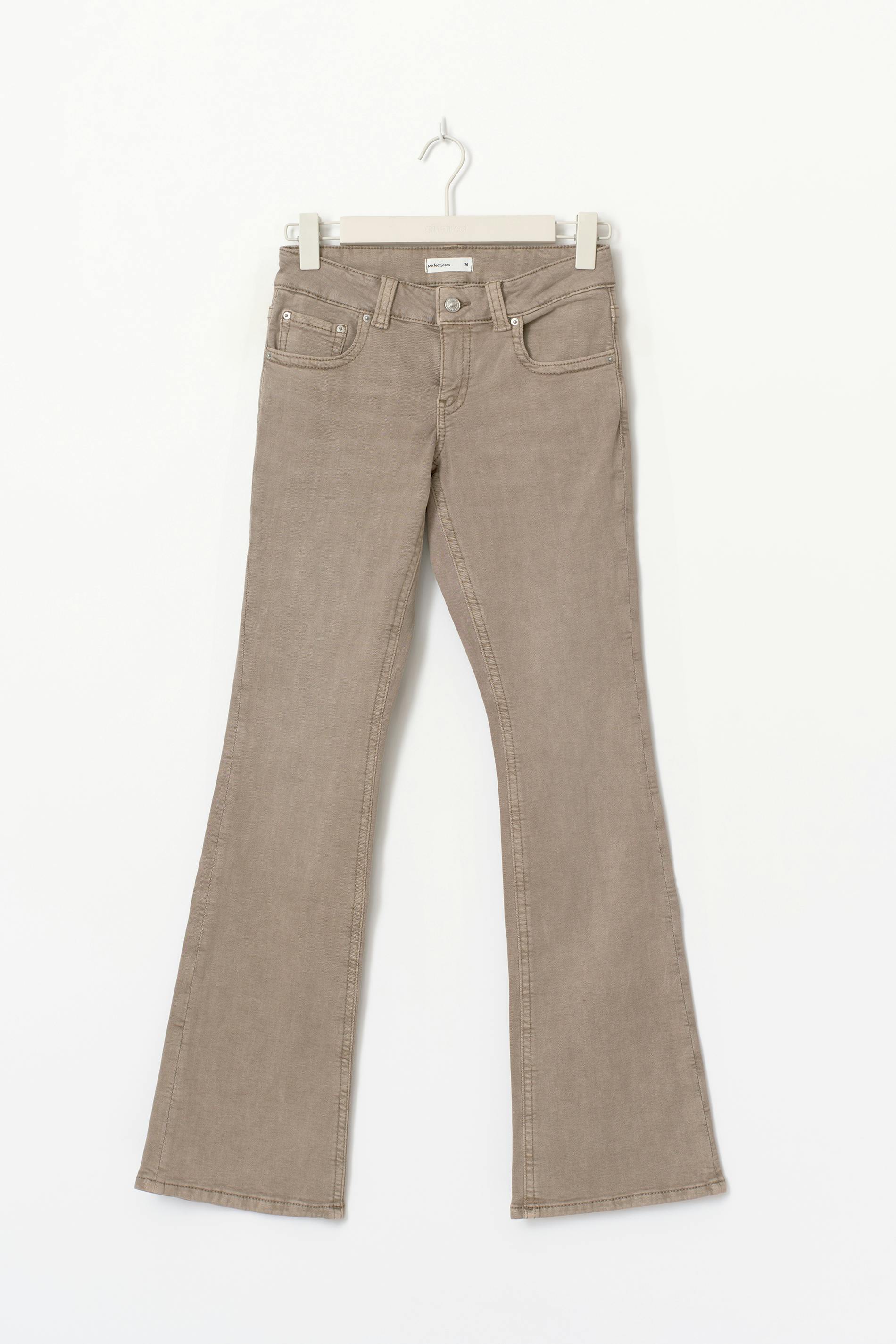 Bootcut jeans med låg midja. Jeansen är beigea och har stretchig kvalitet. De har utsvängda ben med normallängd, figurnära passform, framfickor och bakfickor med knapp och lock. Se gärna vår storleksguide för att hitta din storlek.