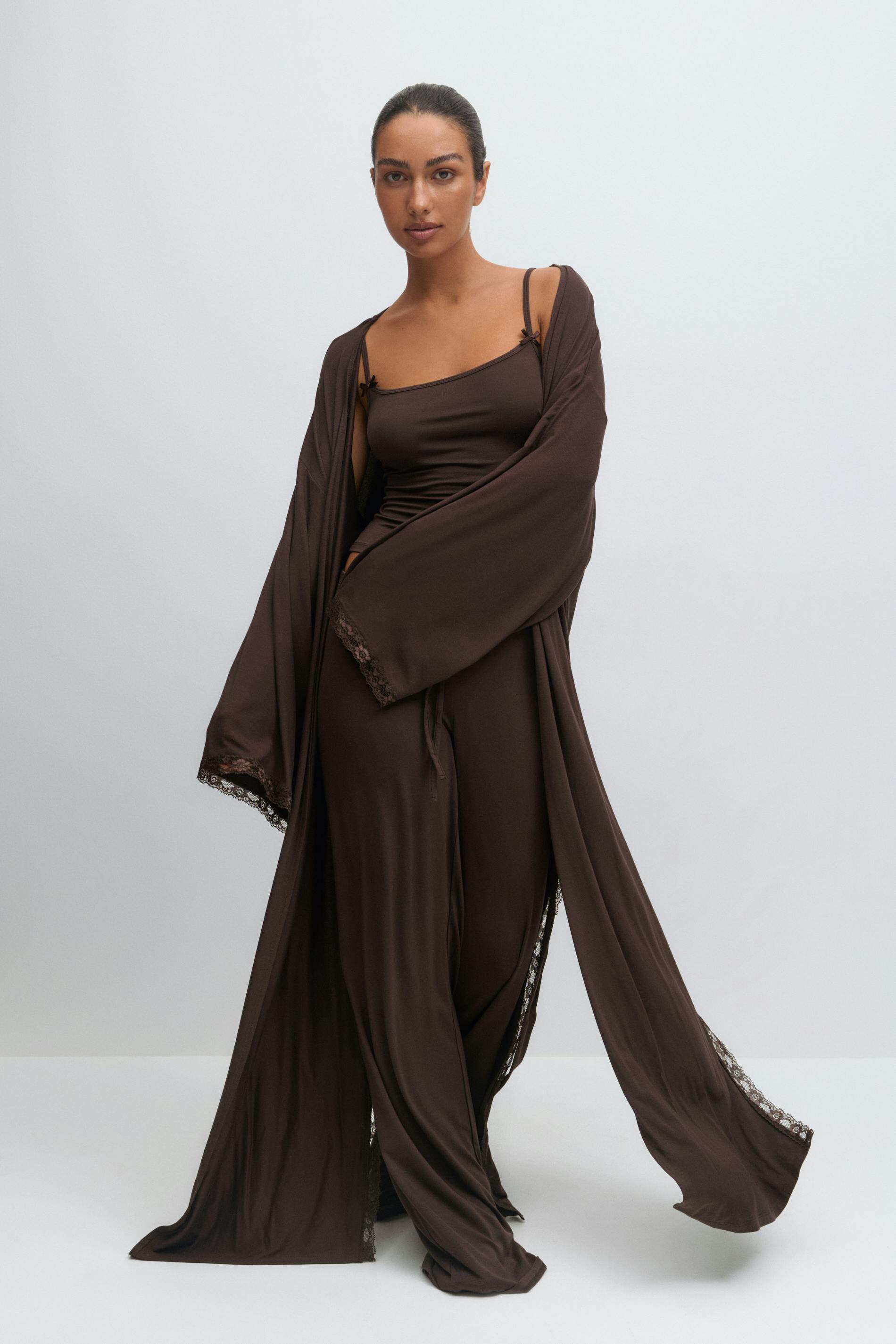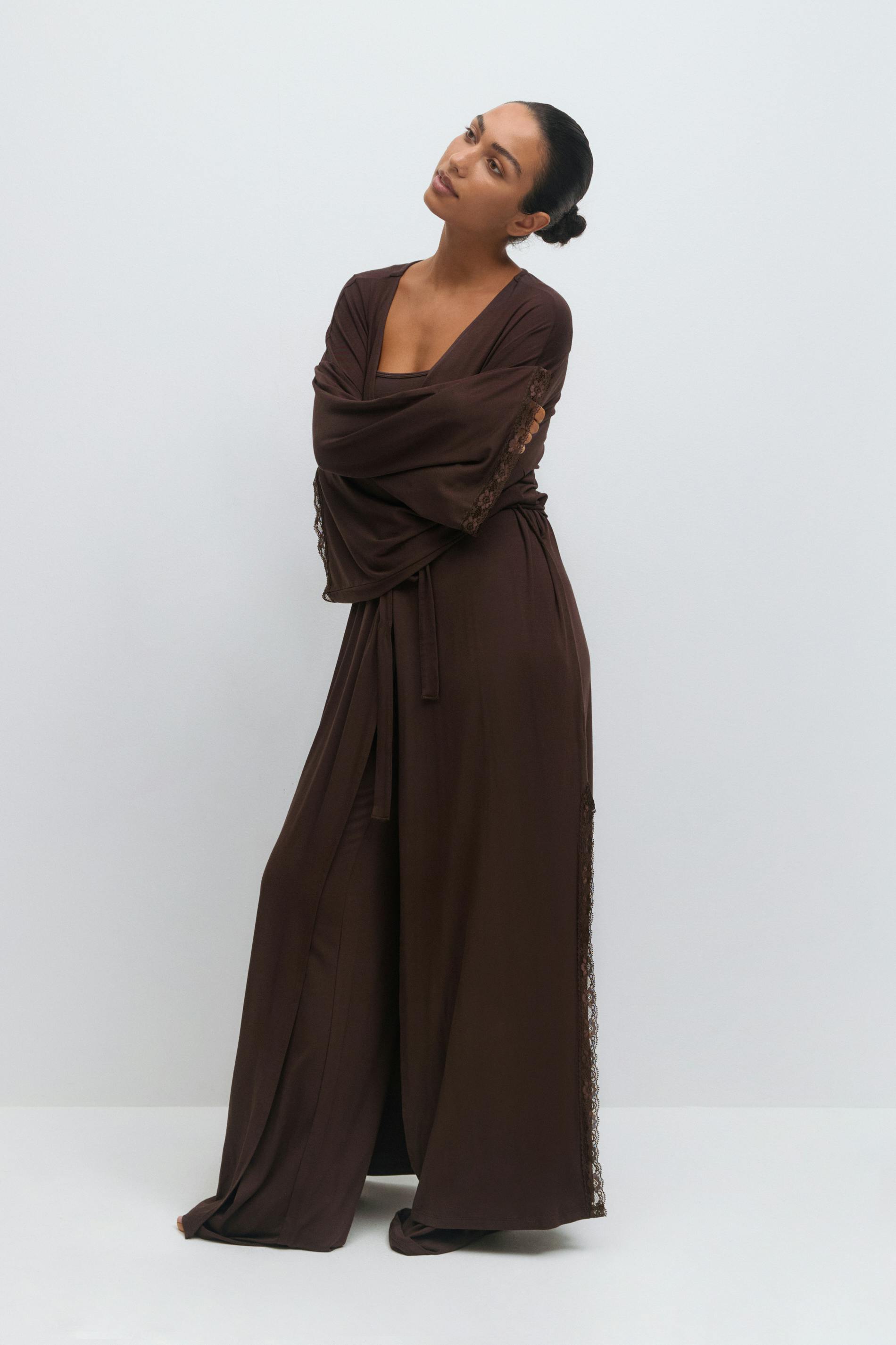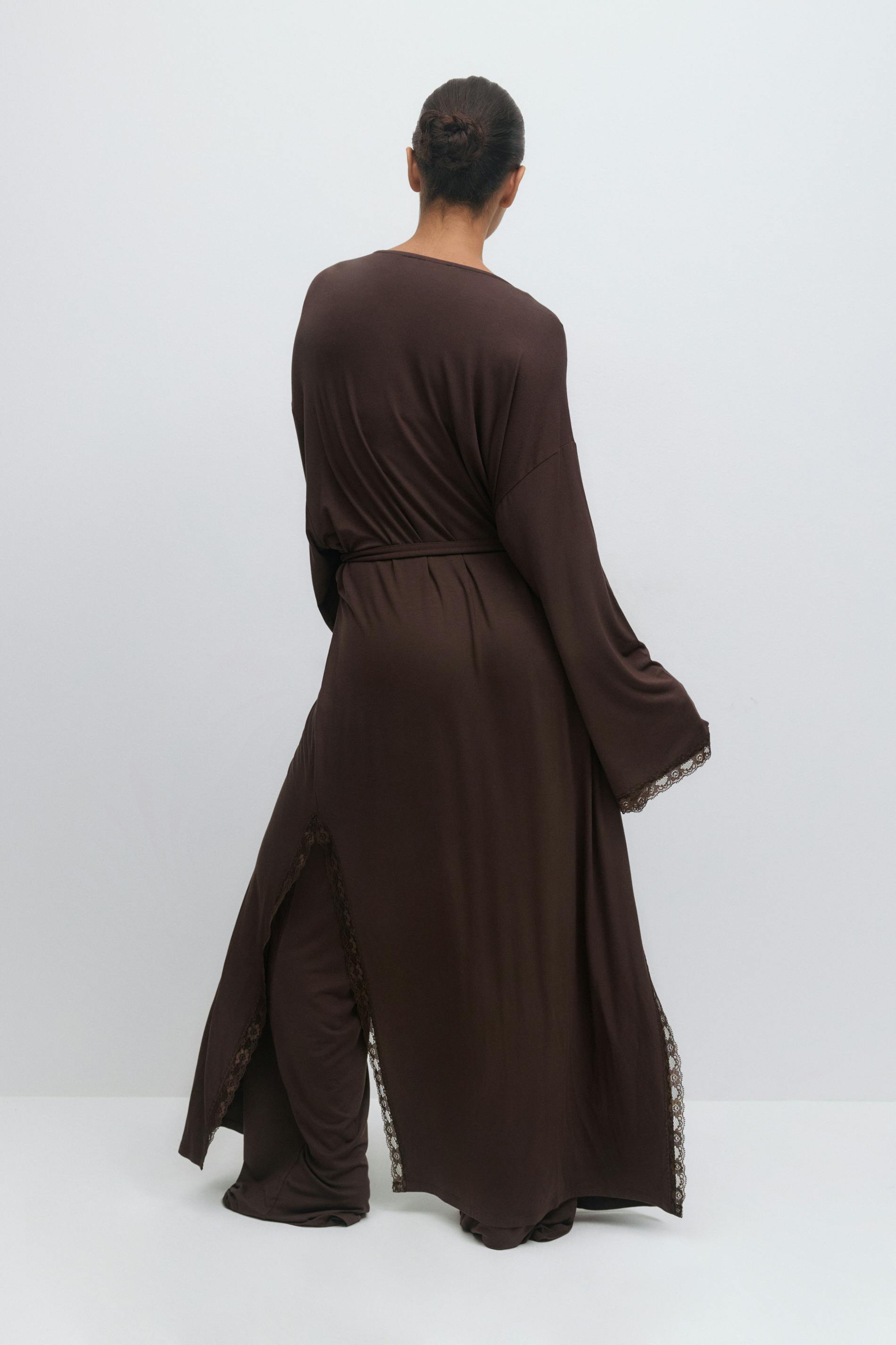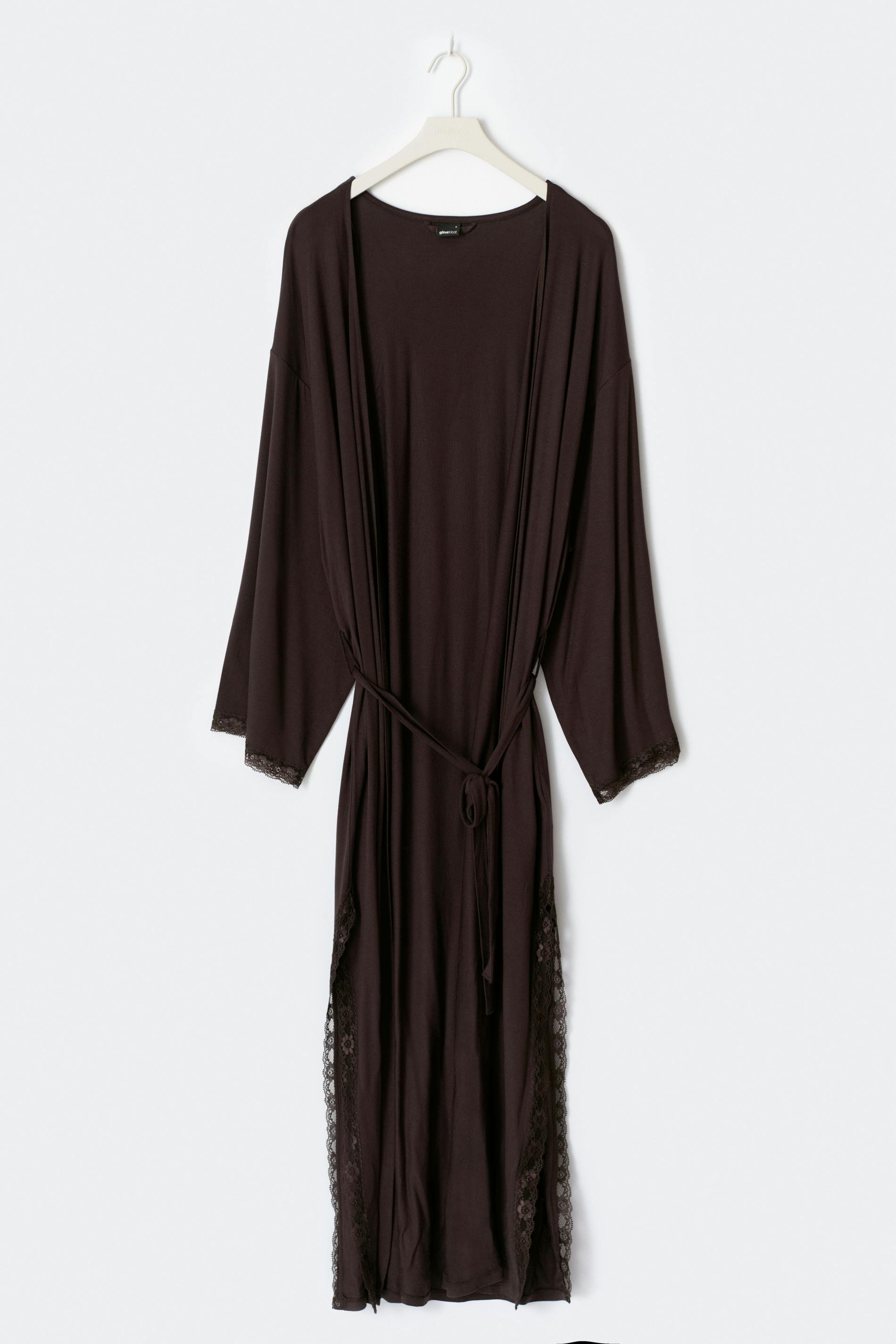 Lång morgonrock med spetsdetaljer. Morgonrocken är brun och har slits i sidorna. Den har oversize fit, mjuk kvalitet, knytbälte, långa ärmar och maxi-längd.