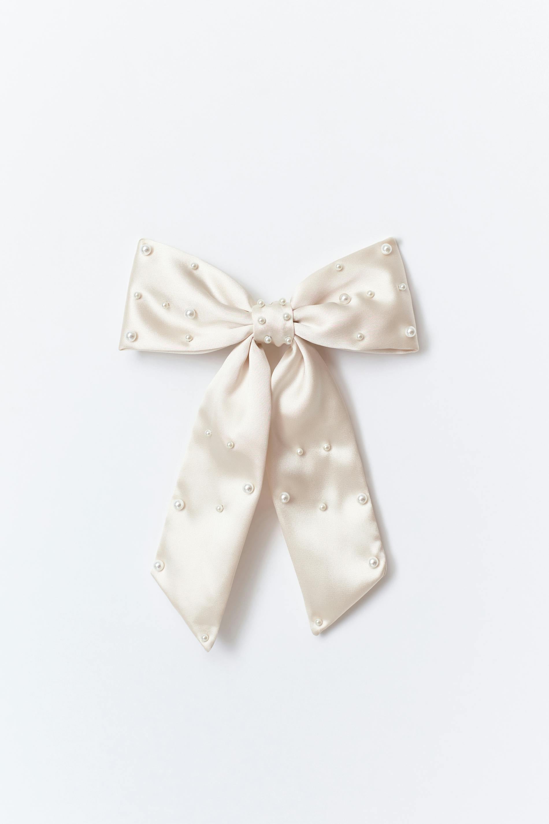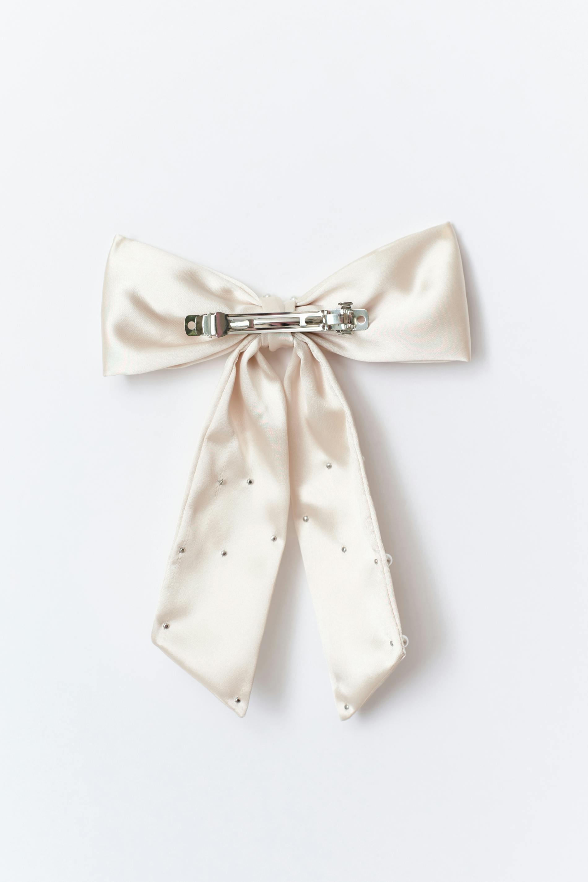 Rosett i satin med pärlor. Rosetten är krämfärgad och har en hårklämma bak.