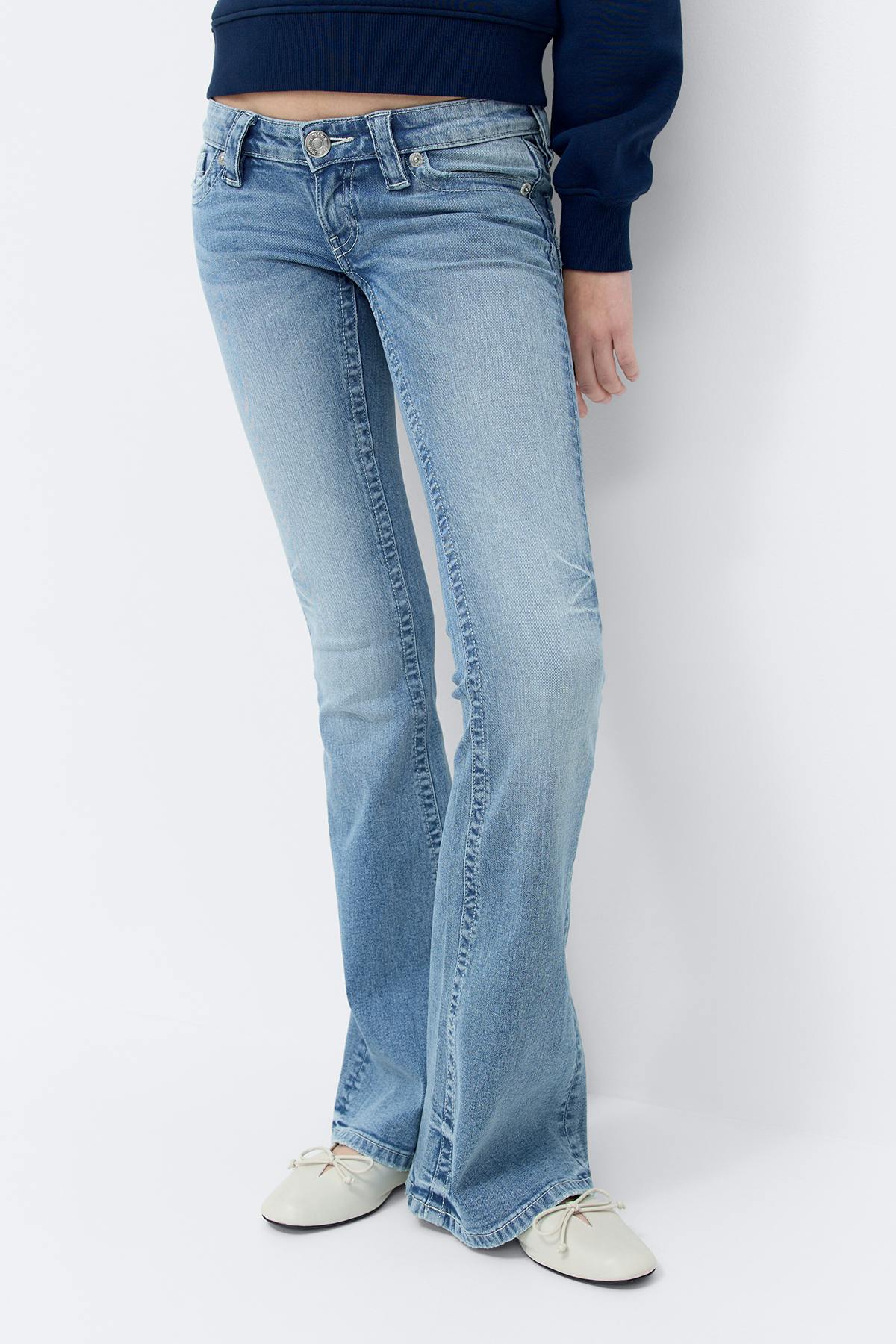 Bootcut jeans med låg midja. Jeansen är blåa och har utsvängda ben. De har bälteshällor, dragkedjegylf, framfickor och broderade bakfickor. Se gärna vår storleksguide för att hitta din storlek.