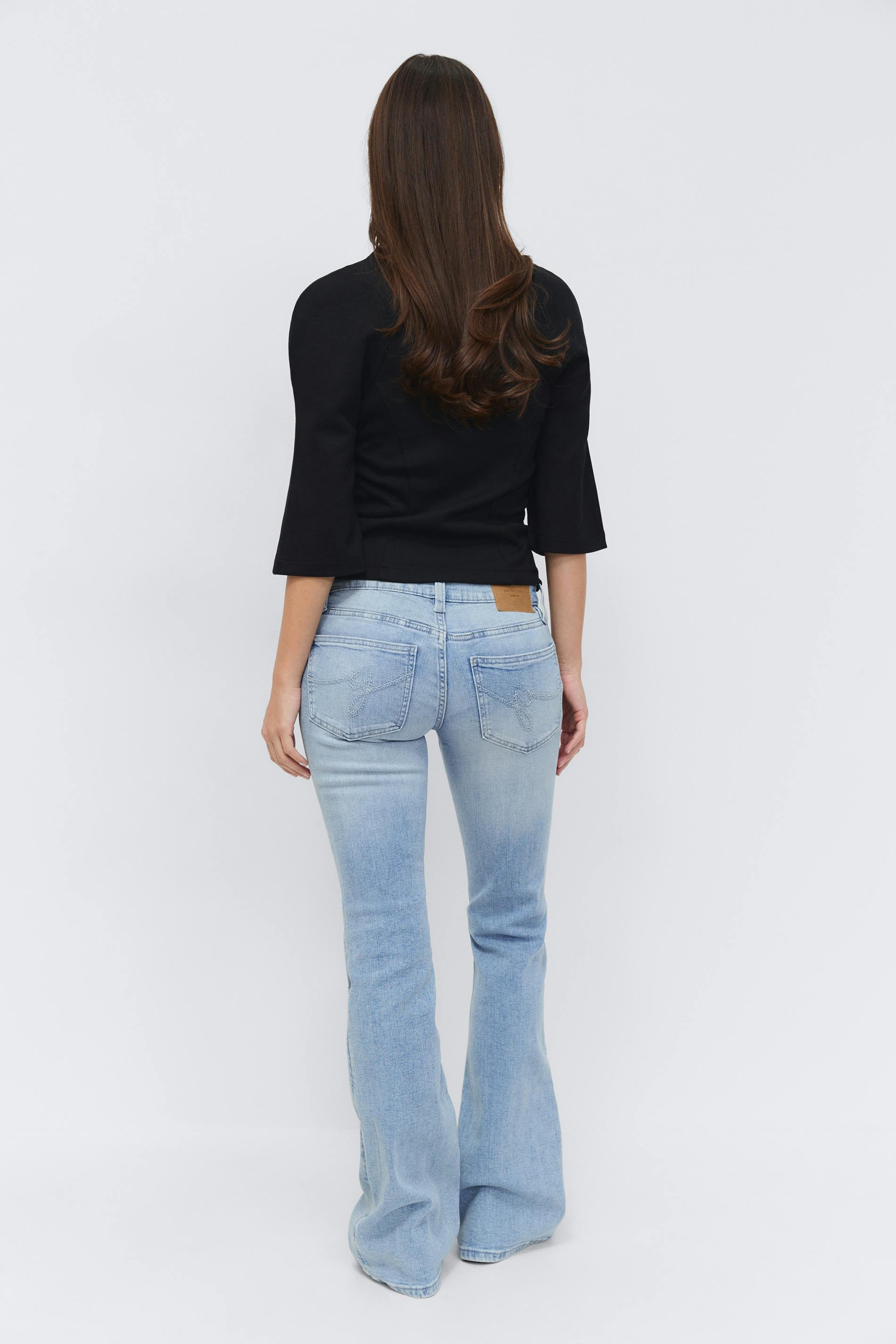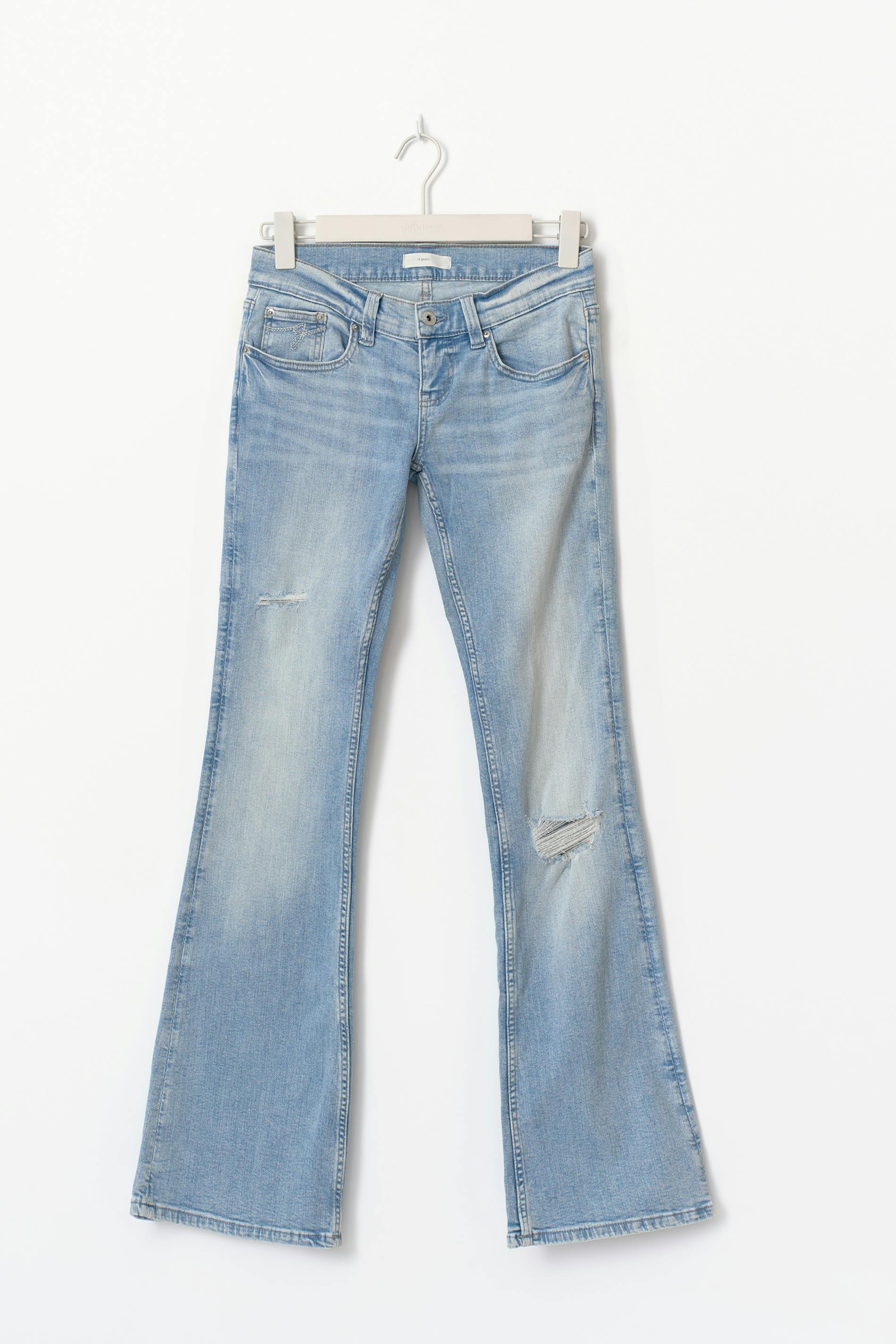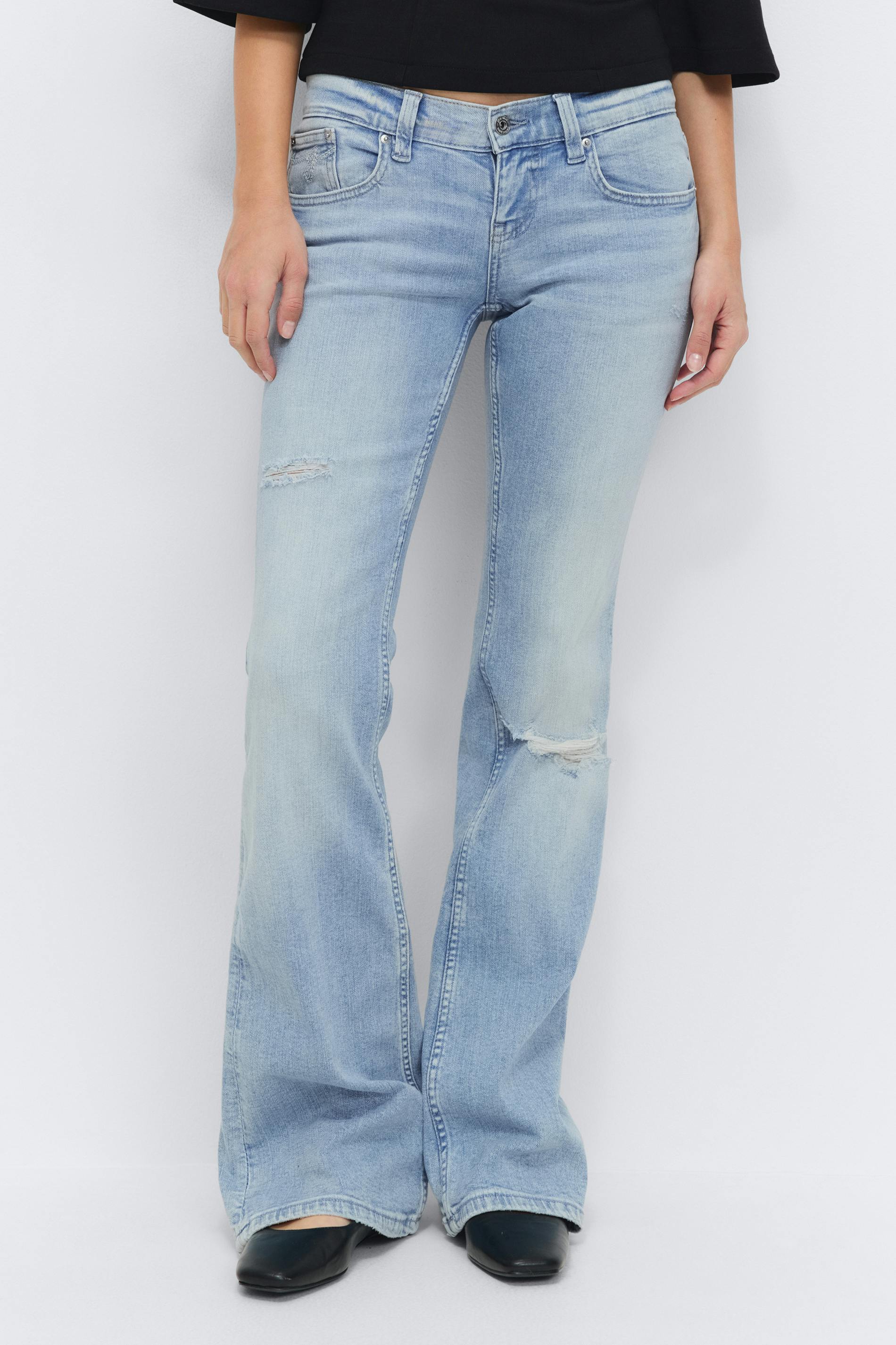 Bootcut jeans med slitningar. Jeansen är blåa och har låg midja. De har stretchig kvalitet, figurnära passform, utsvängda ben, dragkedjegylf, bälteshällor, normallängd och fickor fram och bak. Se gärna vår storleksguide för att hitta din storlek.