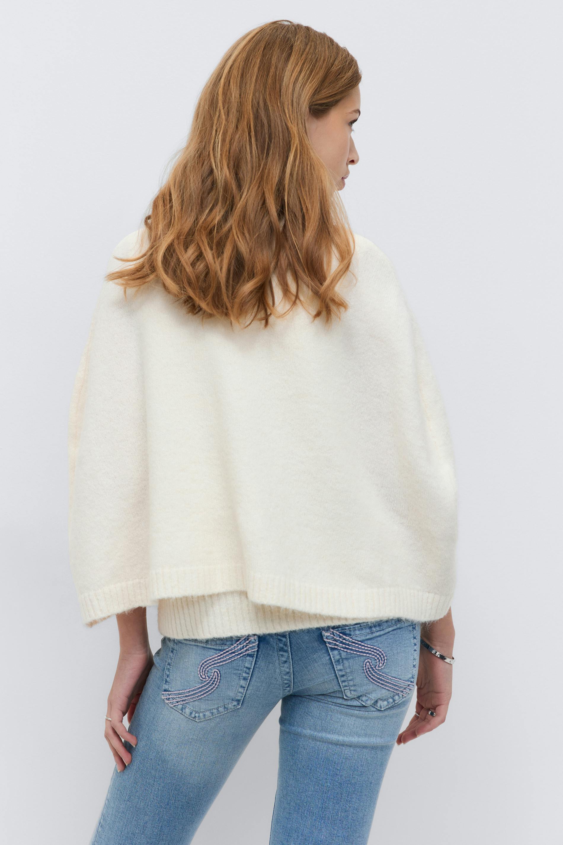 Stickad kofta med cape-design. Cardigan är vit och har knappar framtill. Den har rund halsringning och ribbstickning i nederkant.
