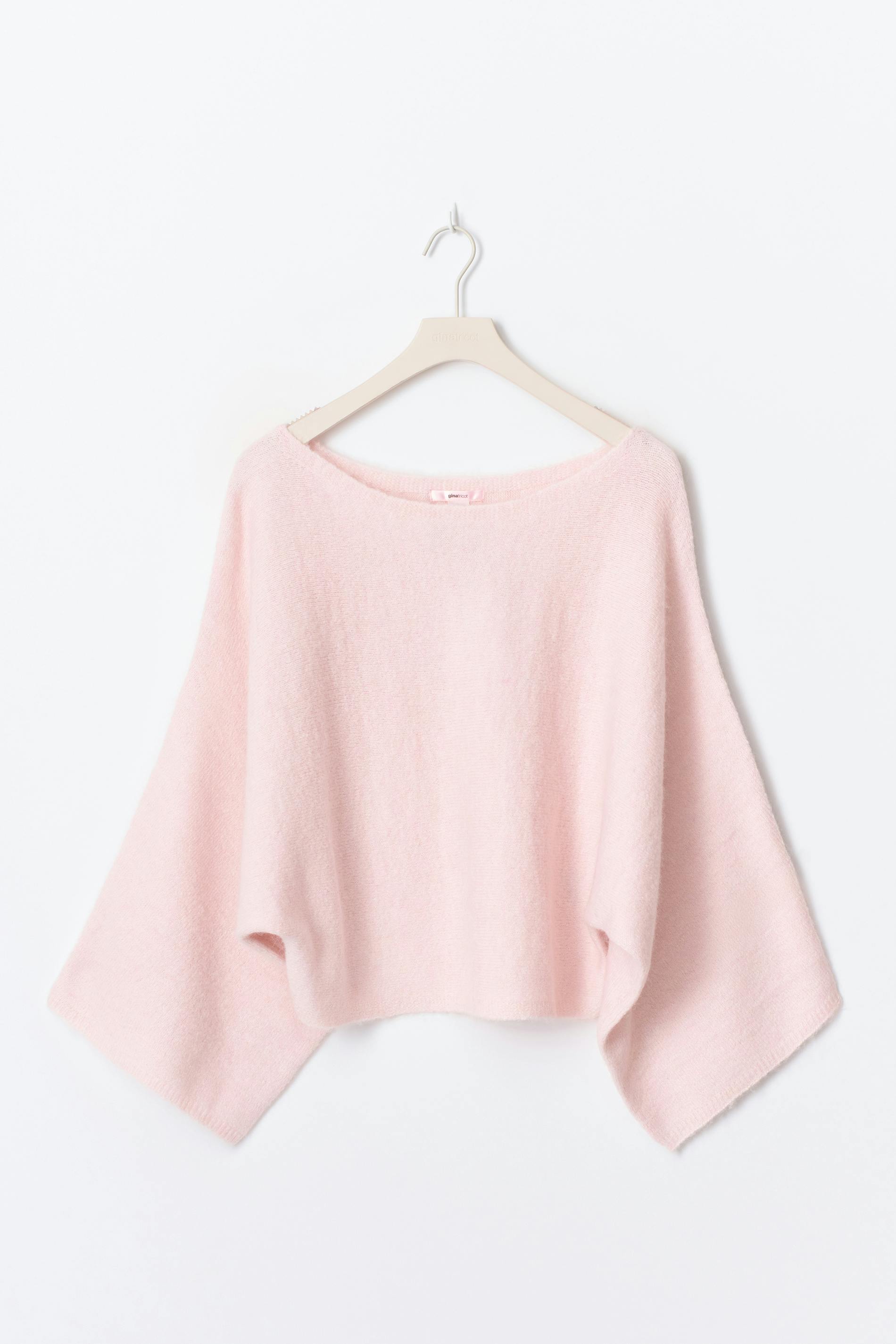 Stickad tröja med båtringning. Tröjan är rosa och har lös passform.
