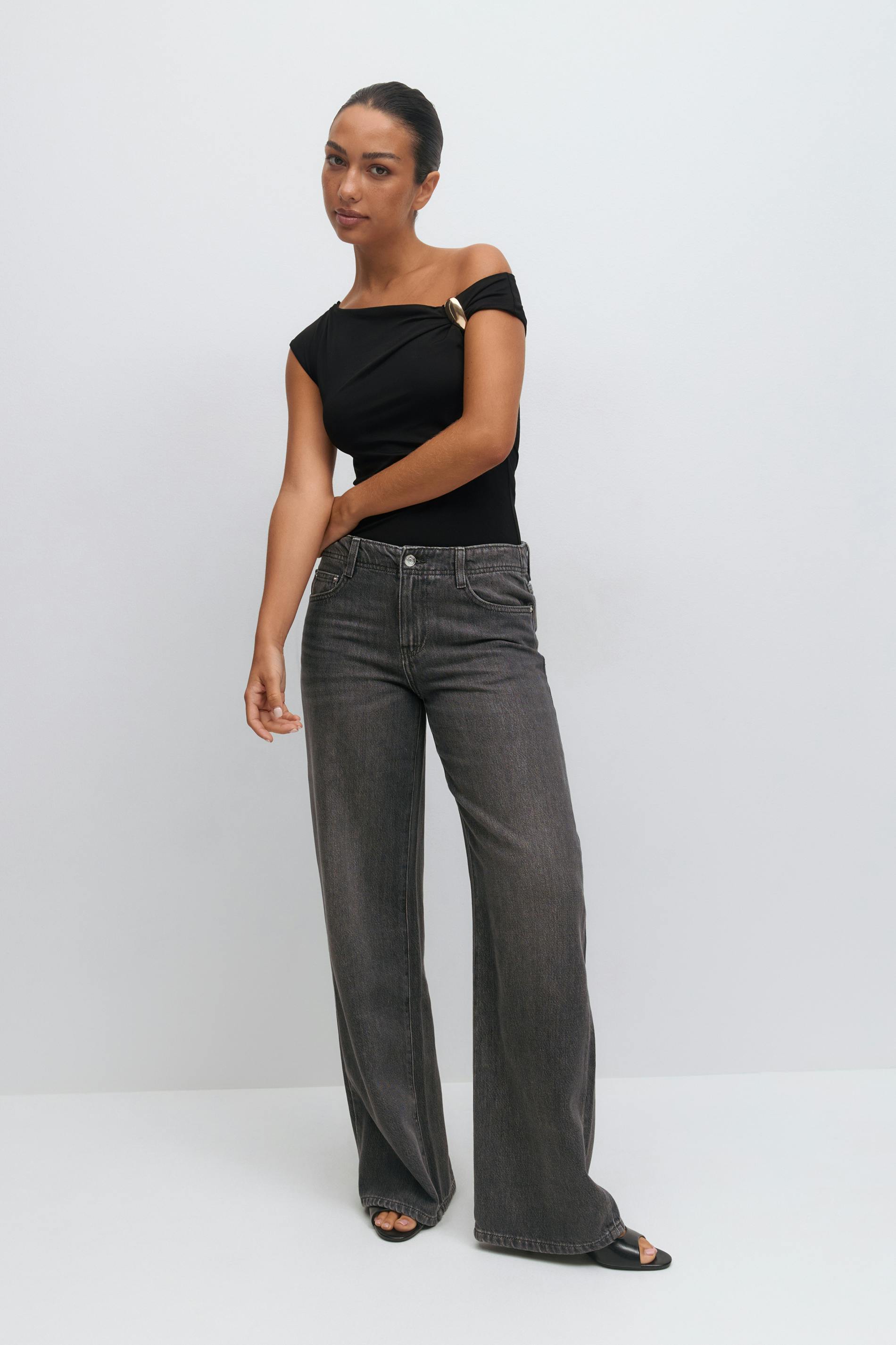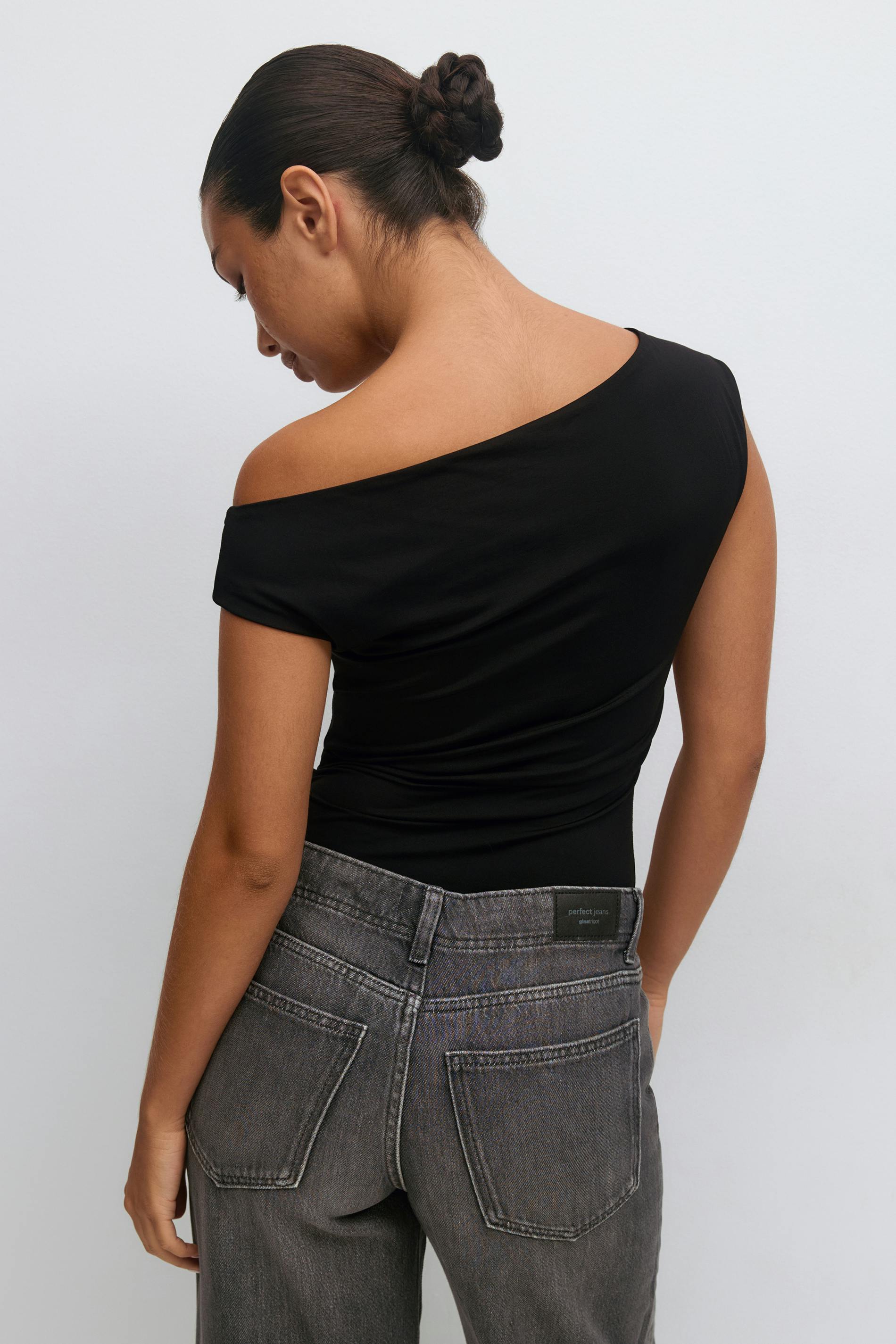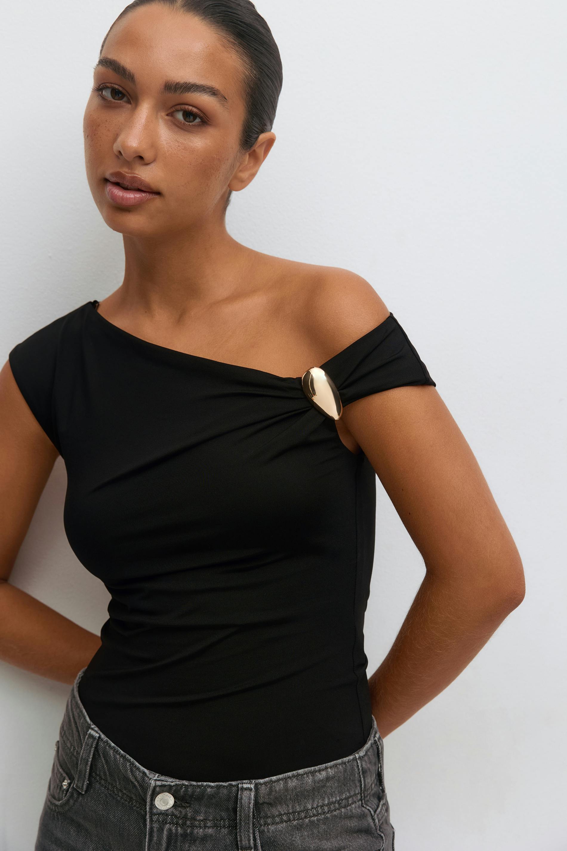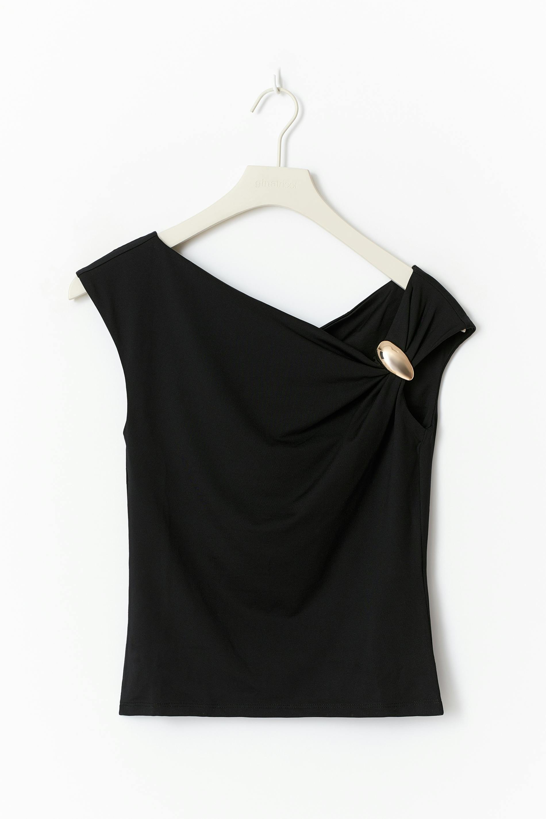 Kortärmad one shoulder topp med guldfärgad metalldetalj på ärmen. Toppen är svart och har asymmetrisk halsringning. Den har ärmlös design, stretchigt material och normal passform.