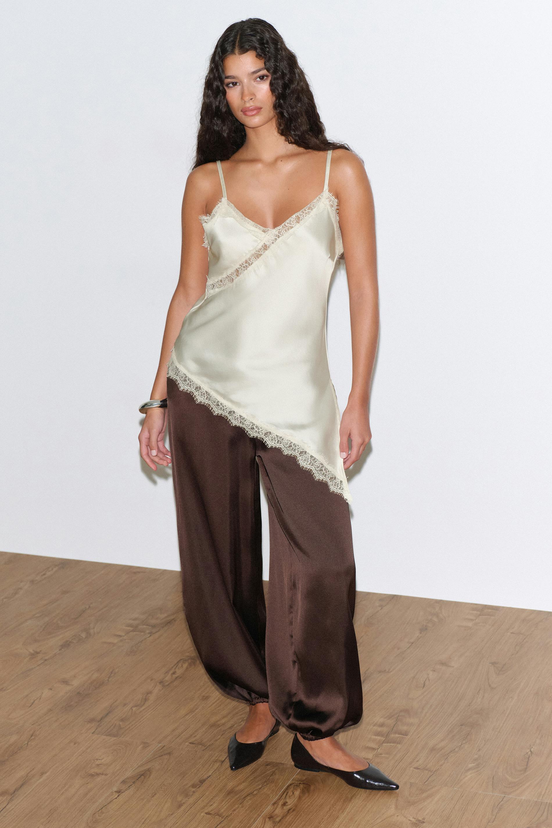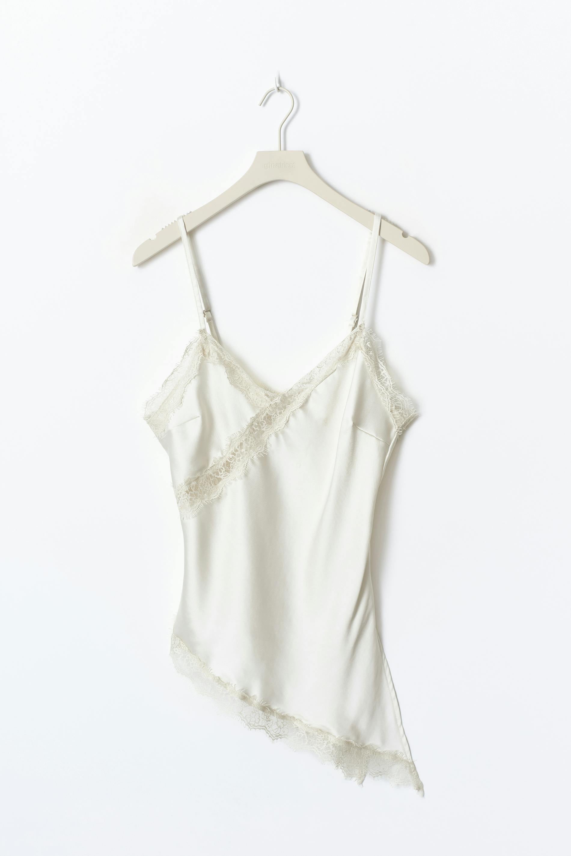 Asymmetriskt linne i satin med smala, reglerbara axelband. Linnet är krämfärgat och har en lös passform. Det har spetsdetalj i nederkant, under bysten och kring halsringning, en slits i sidan och v-ringning.