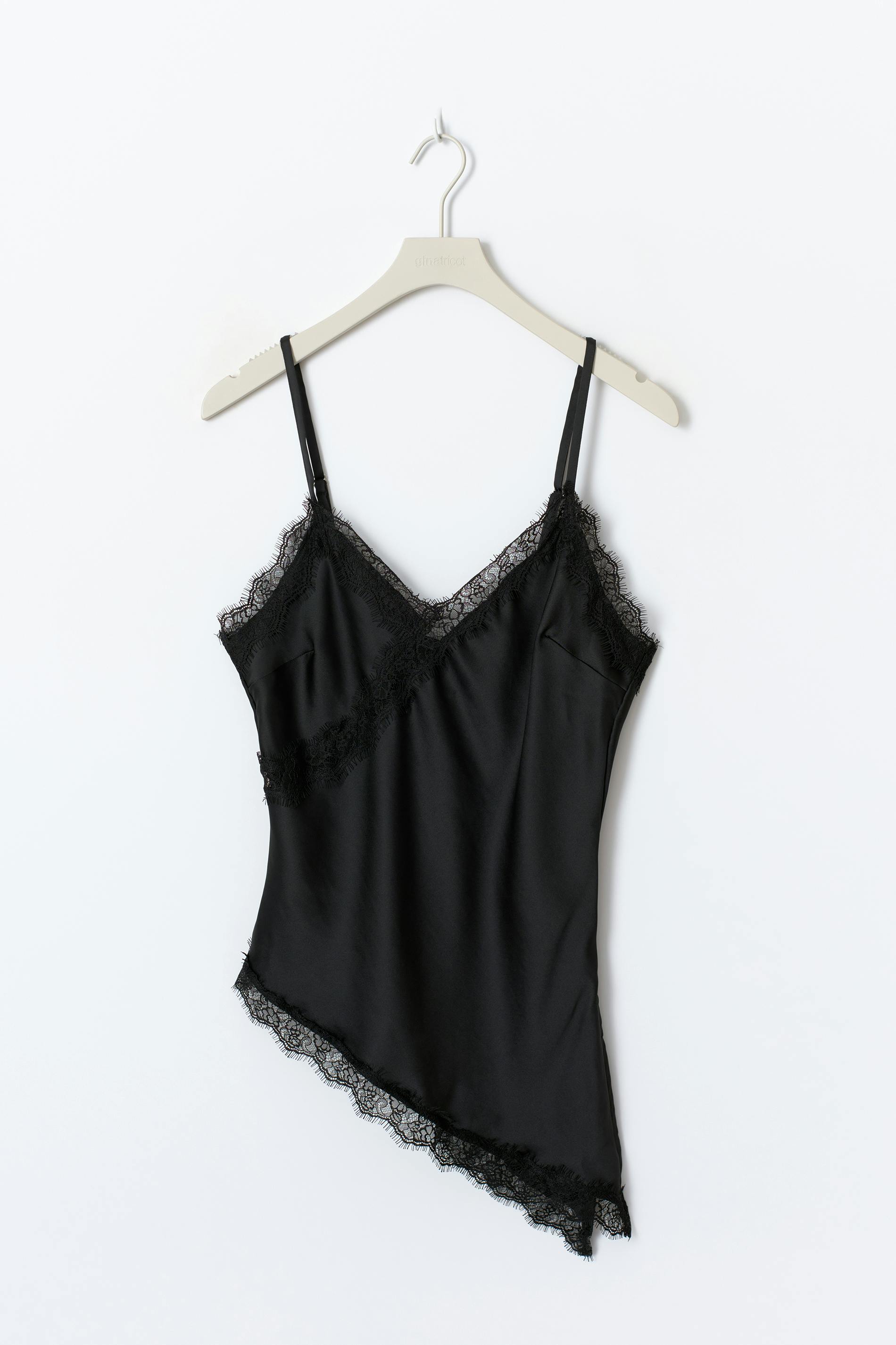 Asymmetriskt linne i satin med smala, reglerbara axelband. Linnet är svart och har en lös passform. Det har spetsdetalj i nederkant, under bysten och kring halsringning, en slits i sidan och v-ringning.