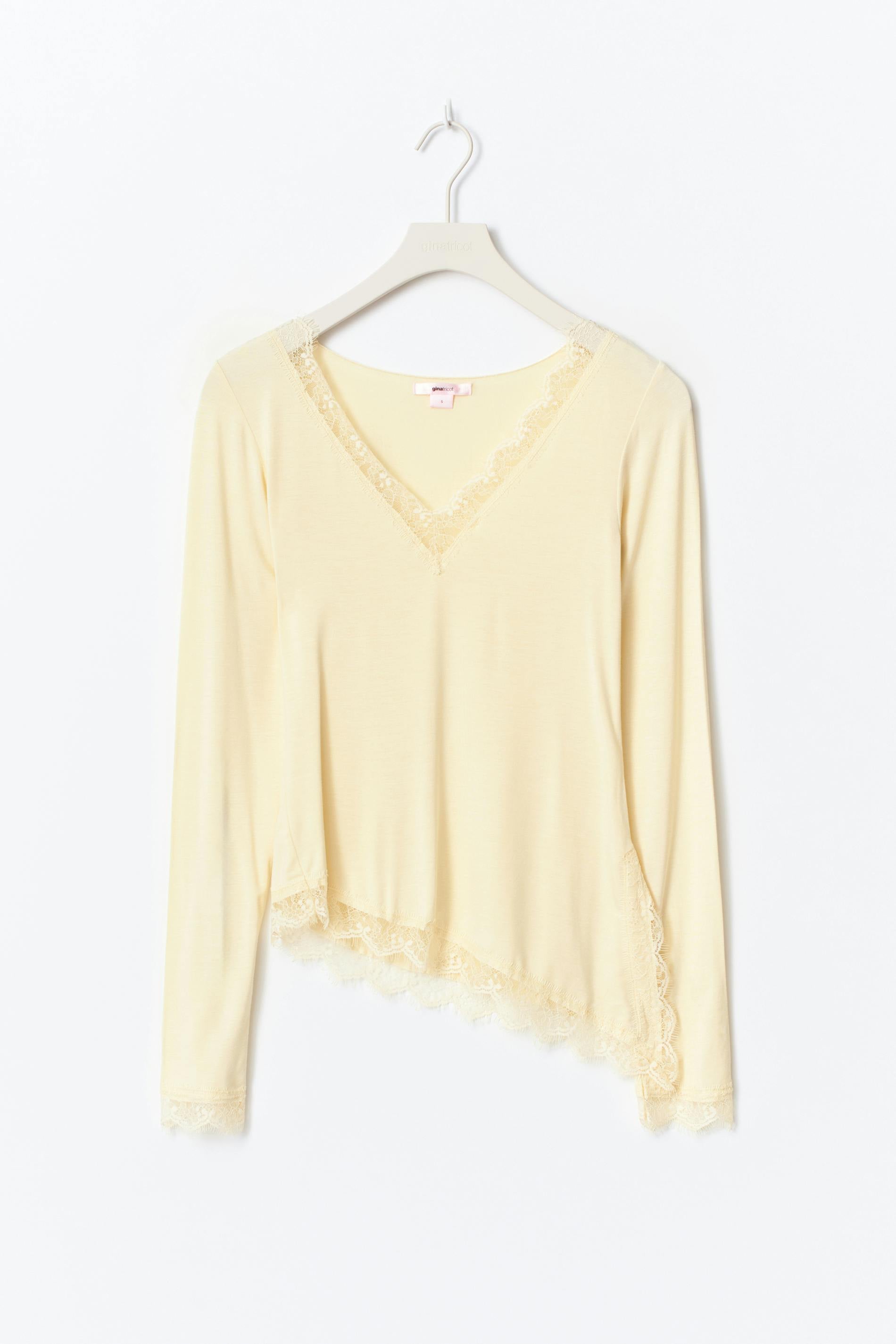 Långärmad topp med spetsdetaljer. Toppen är gul och har en asymmetrisk design. Den har v-ringning och en normal passform.
