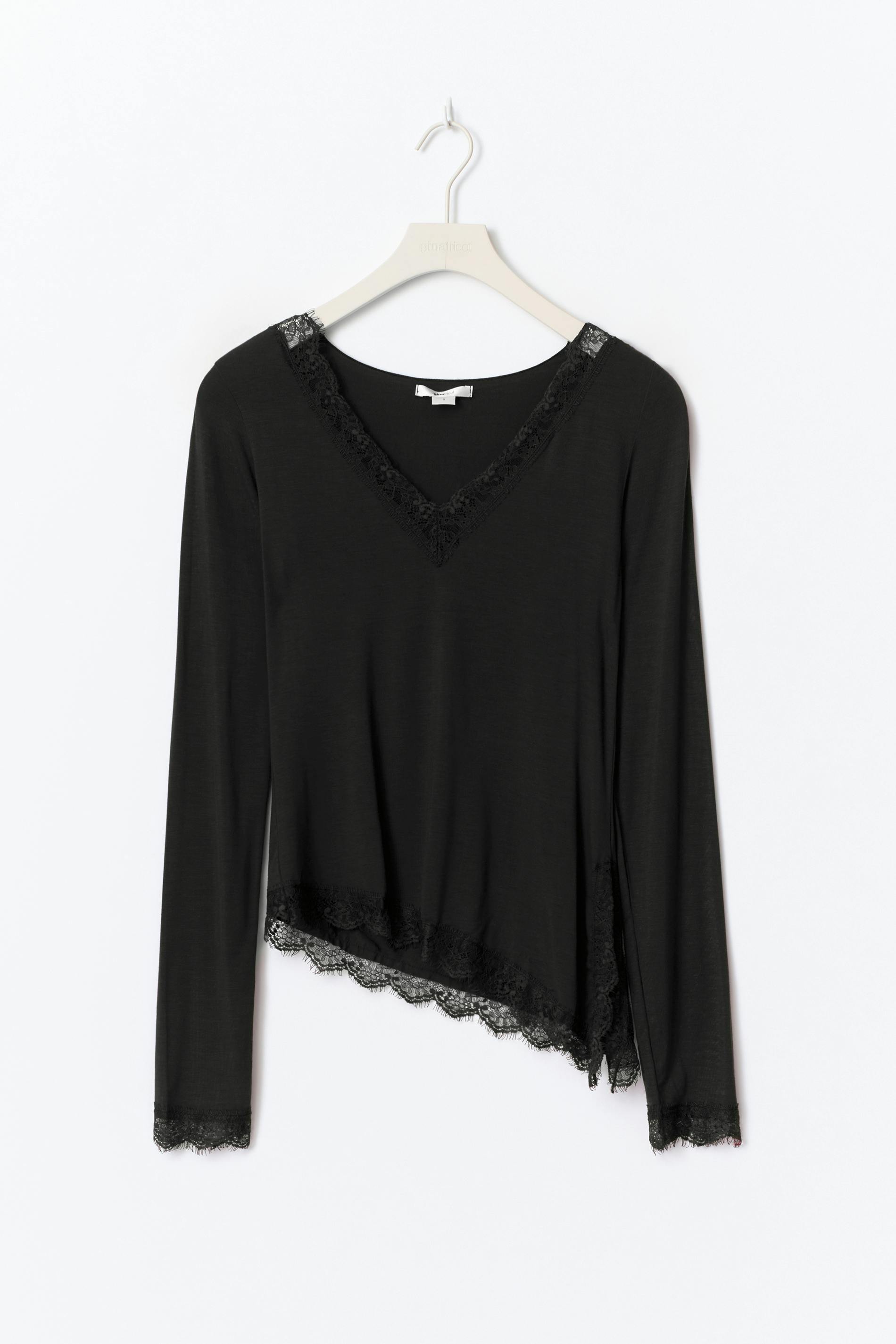 Långärmad topp med spetsdetaljer. Toppen är svart och har en asymmetrisk design. Den har v-ringning och en normal passform.