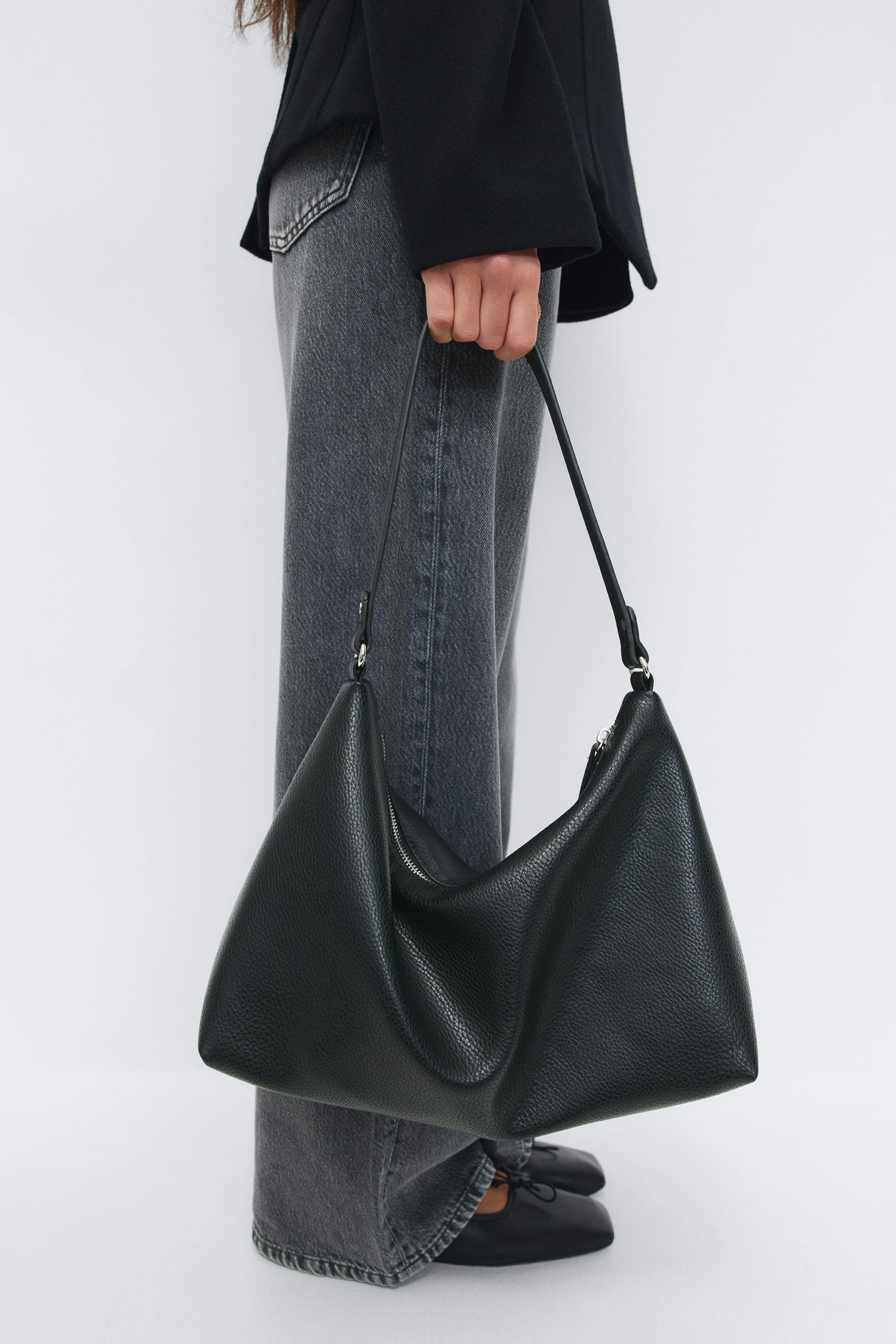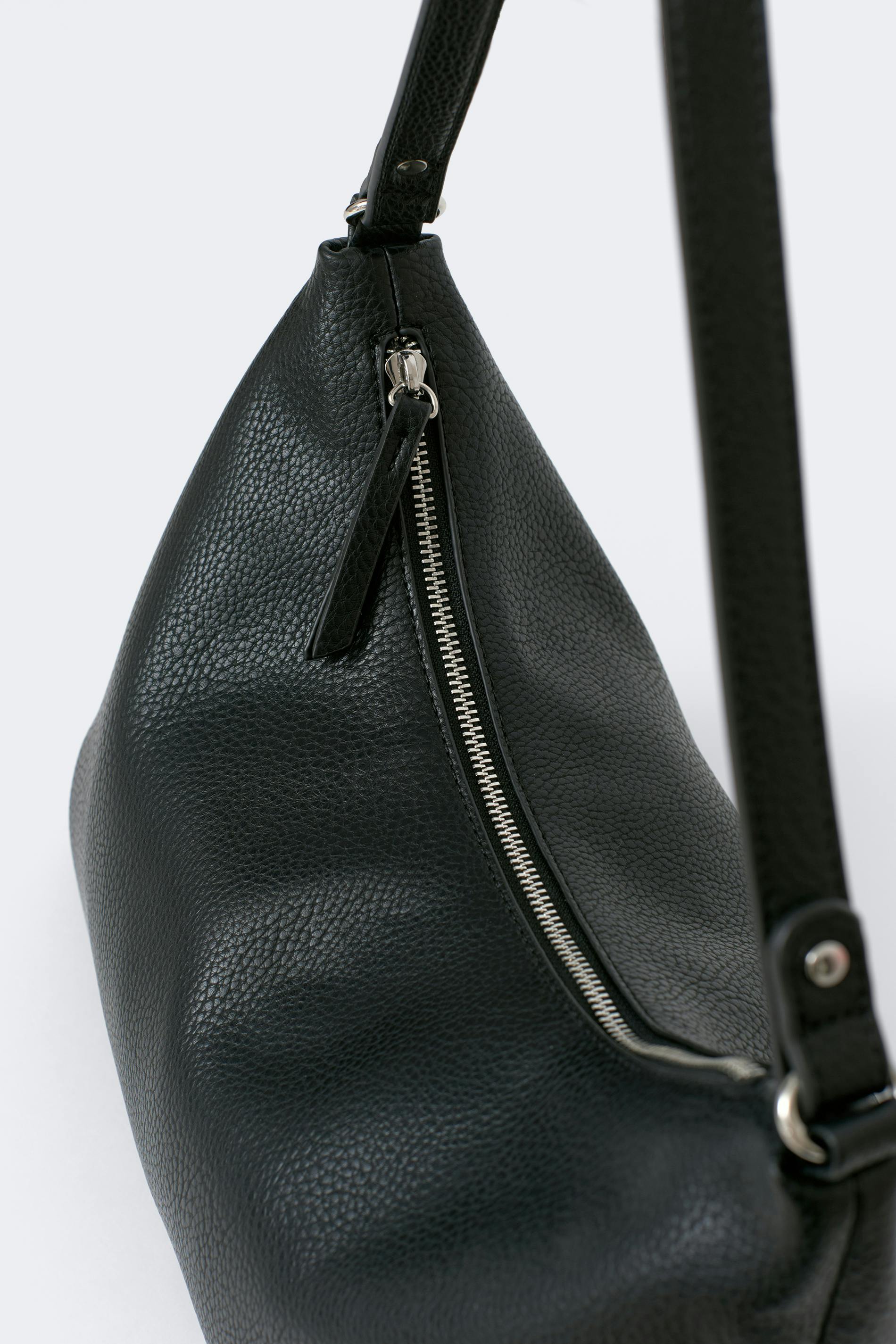 Axelremsväska i läderimitation med dragkedjestängning. Väskan är svart och har silverdetaljer. Den har fodrad insida med dragkedjeficka. Axelrem: 52 cm.