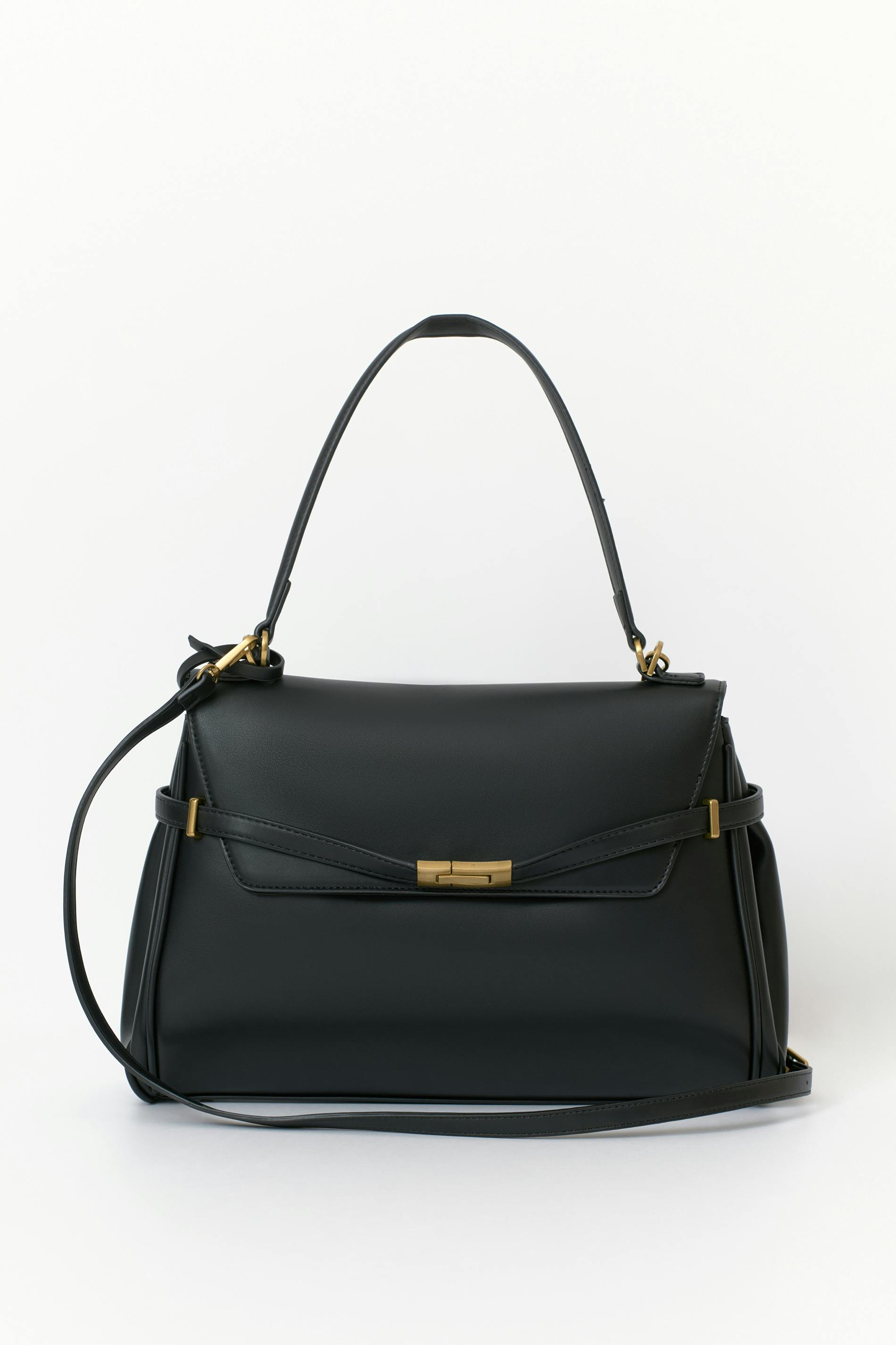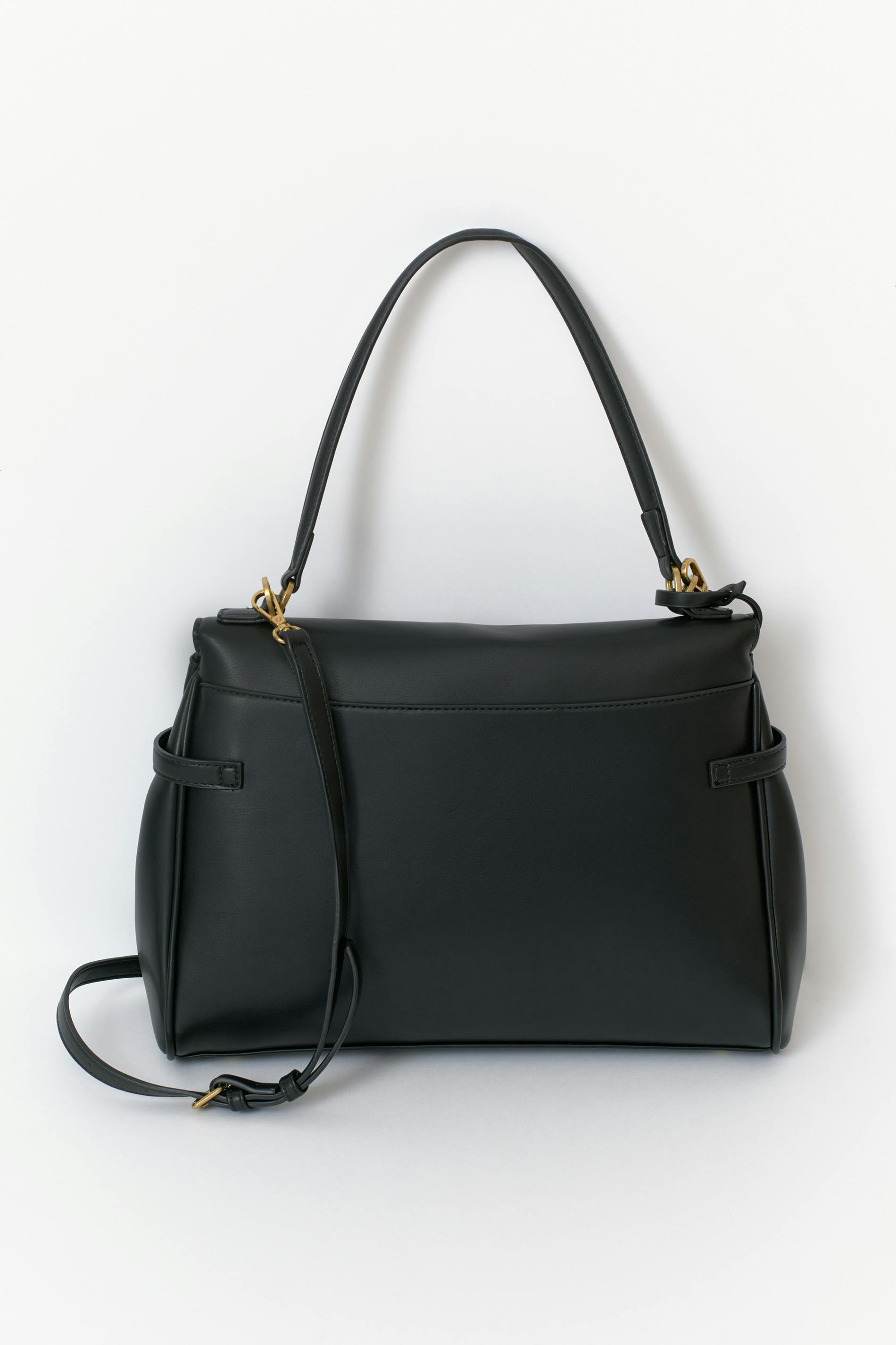 Flap-bag i läderimitation med magnetknäppning. Väskan är svart och har ett handtag. Den har justerbar, avtagbar axelrem, guldfärgat metallspänne, guldfärgade detaljer, fodrad insida med en stor dragkedjeficka i mitten och fötter i metall på undersidan.