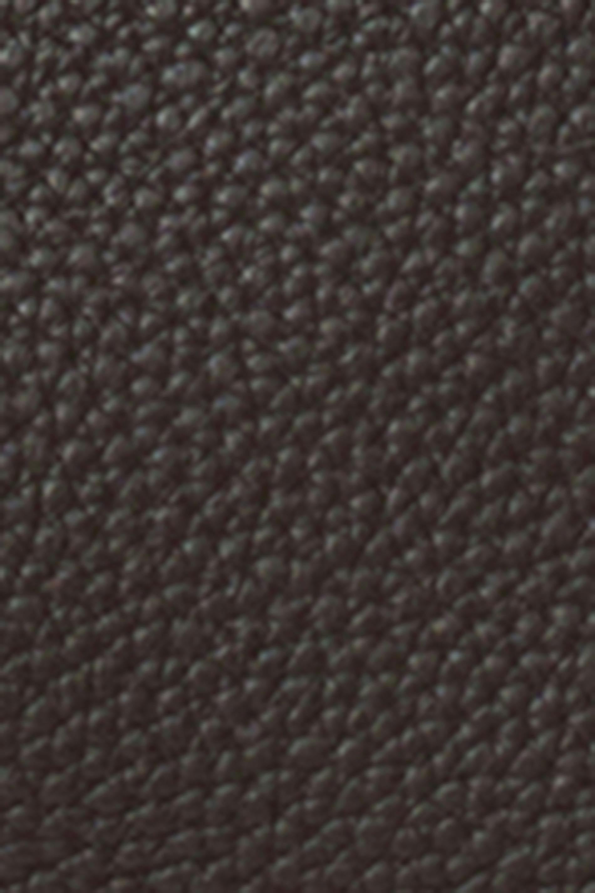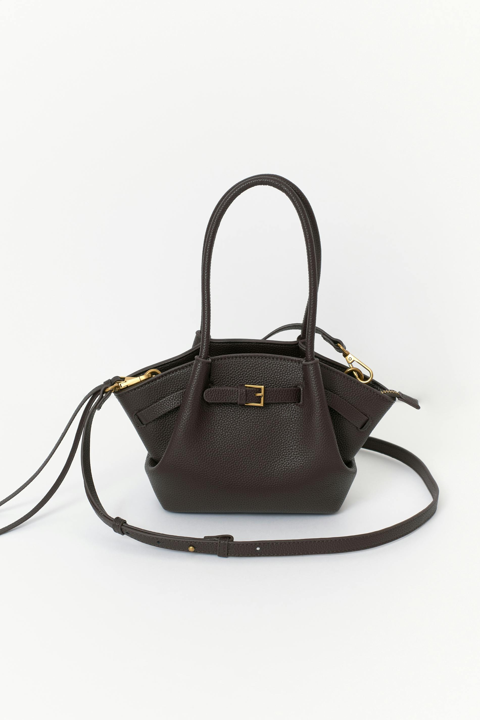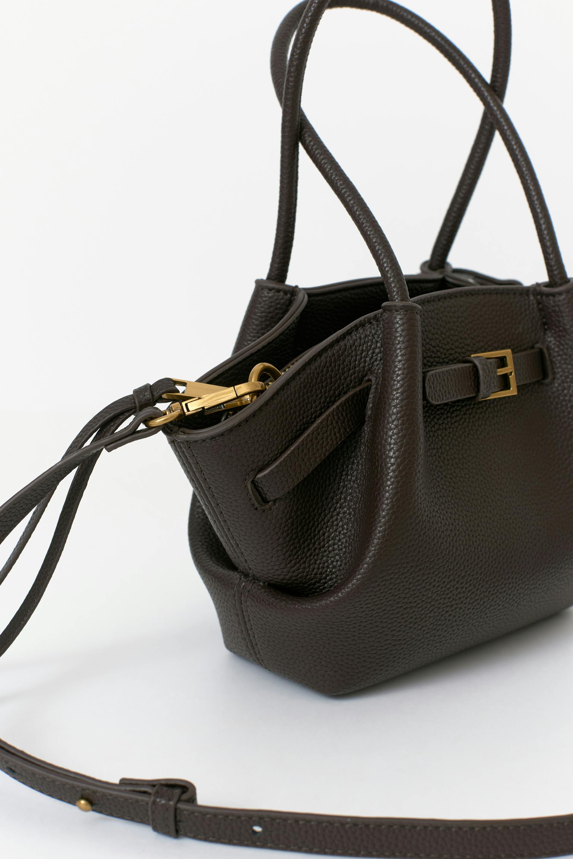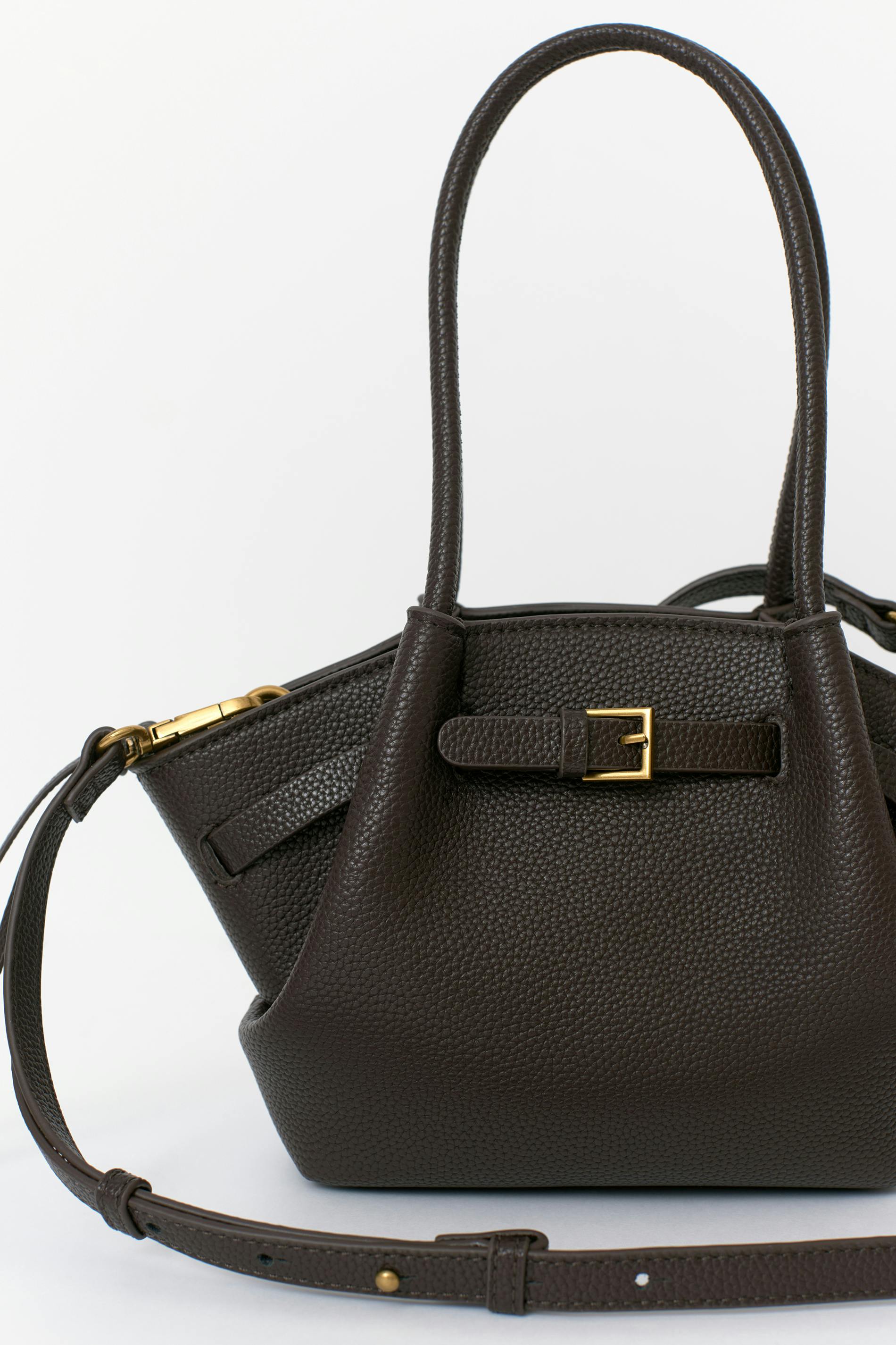 Liten handväska i läderimitation med gulddetaljer. Handväskan är mörkbrun och har dubbla handtag. Den har lång, reglerbar, avtagbar axelrem, bältdetalj, dragkedjestängning och fodrad insida.