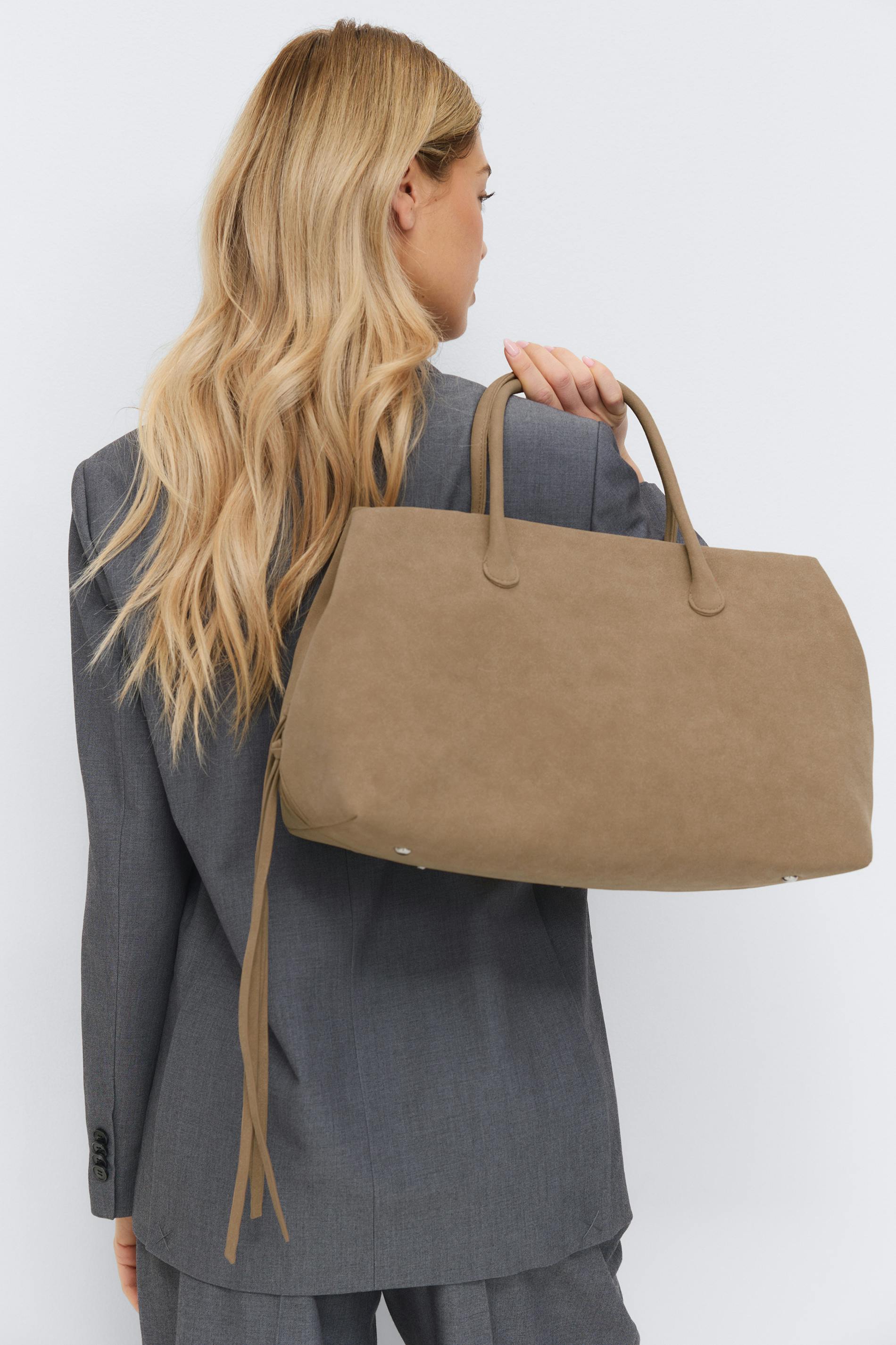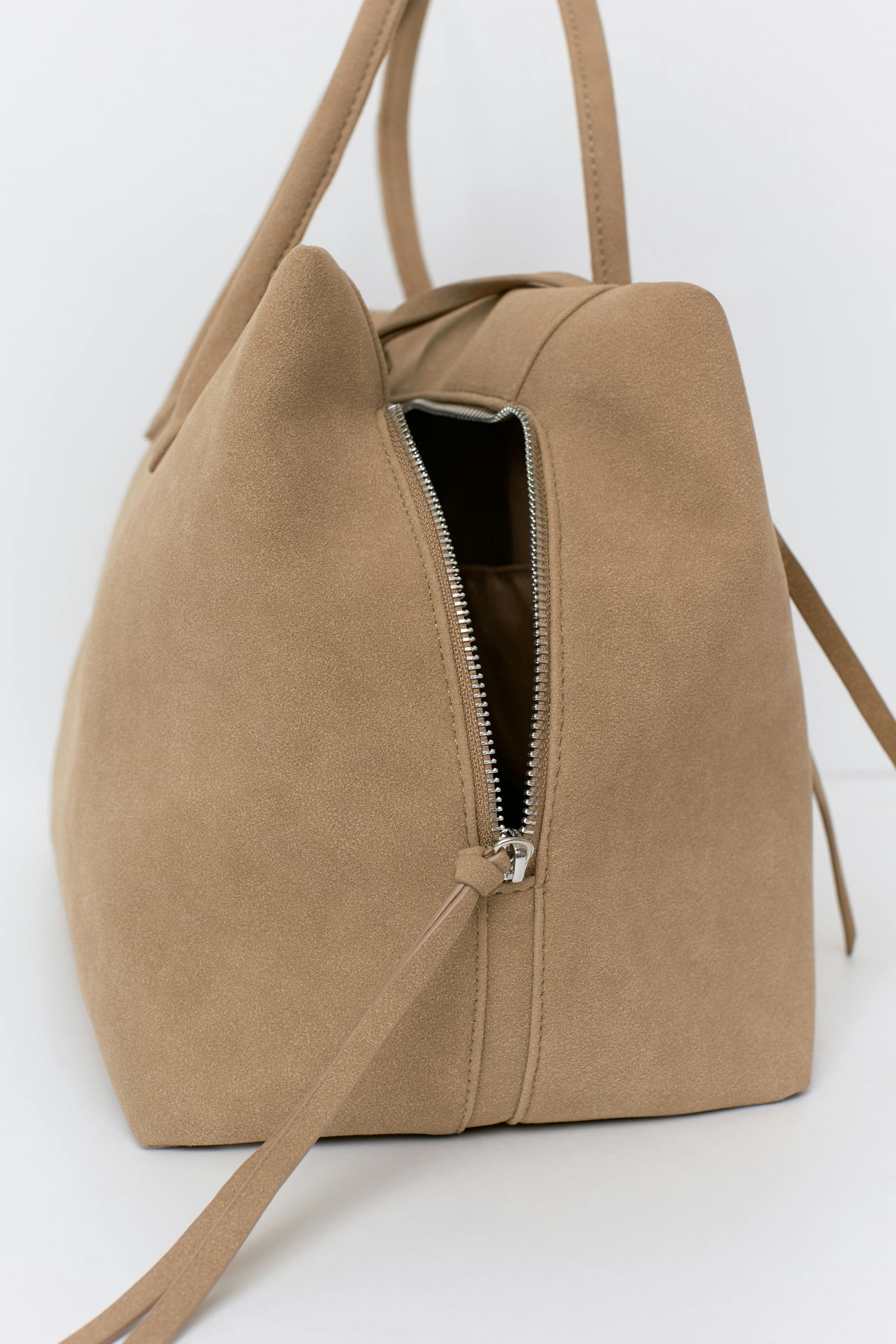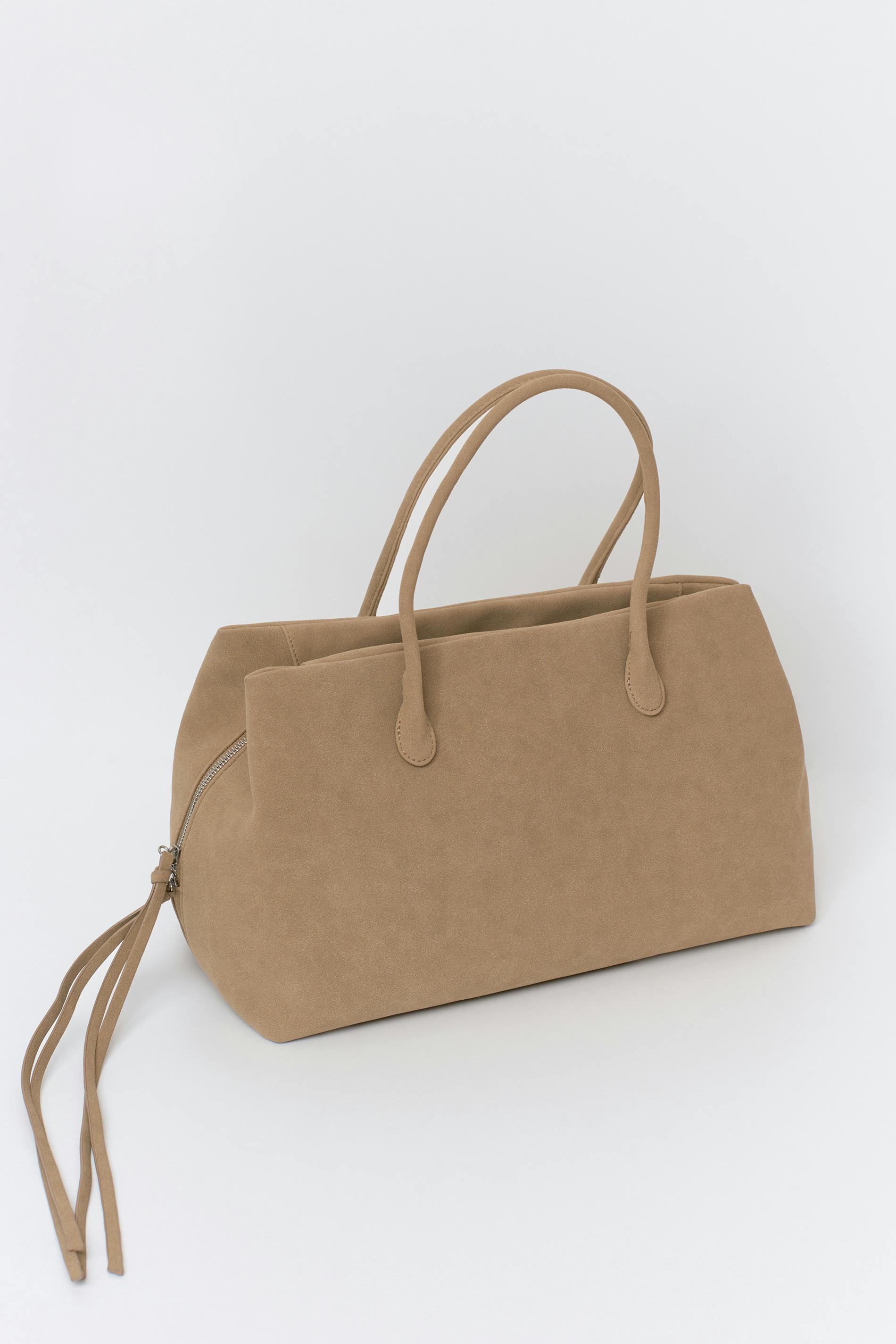 Stor shopper i mockaimitation med två handtag upptill. Väskan har tvåvägsdragkedja upptill med dragögla. Den har fodrad insida med ett innerfack och fötter i metall på undersidan.