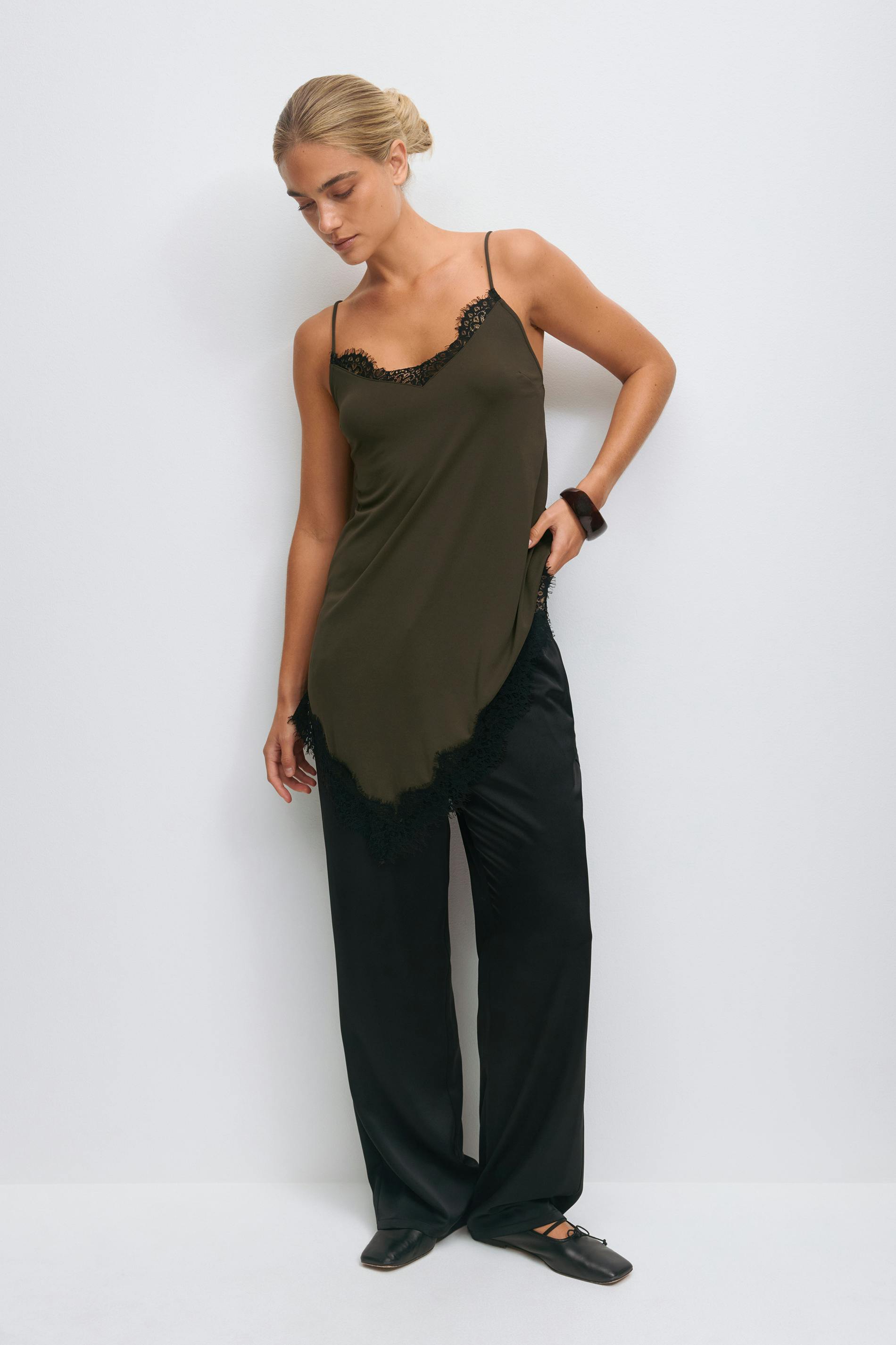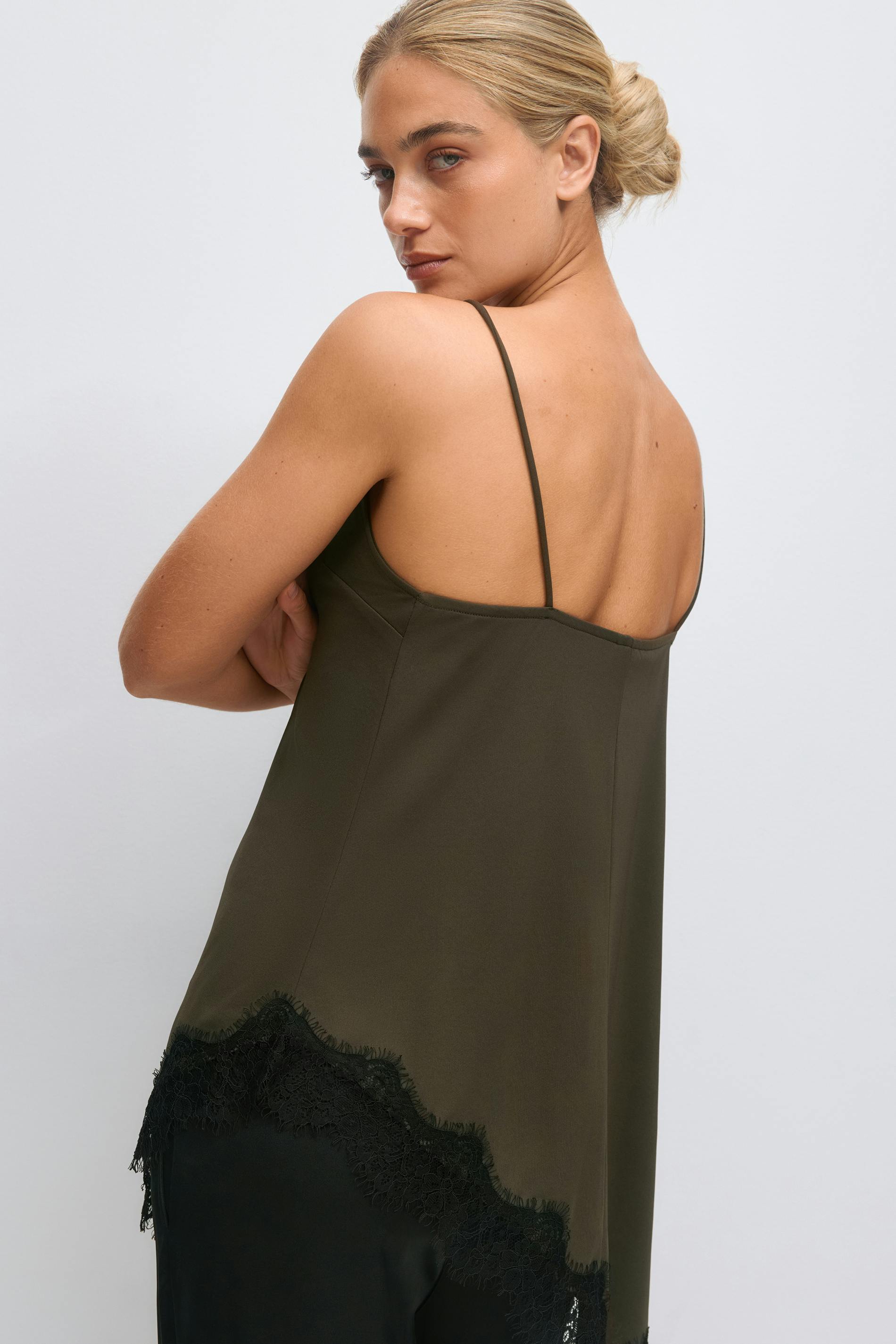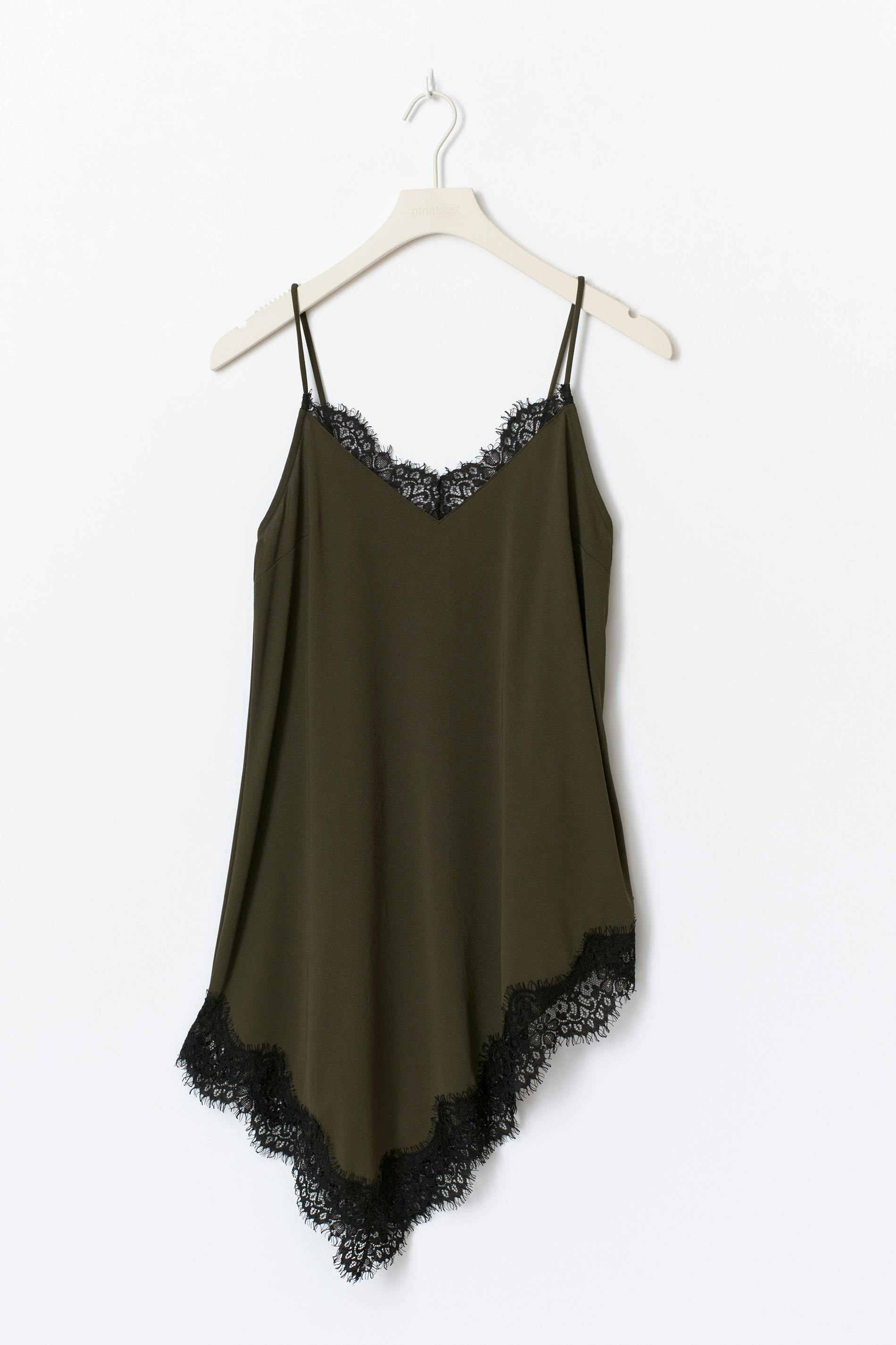 Linne med en spetsdetalj i nederkant och vid halsen. Linnet är mörkgrönt och har smala axelband. Det har en normal passform.