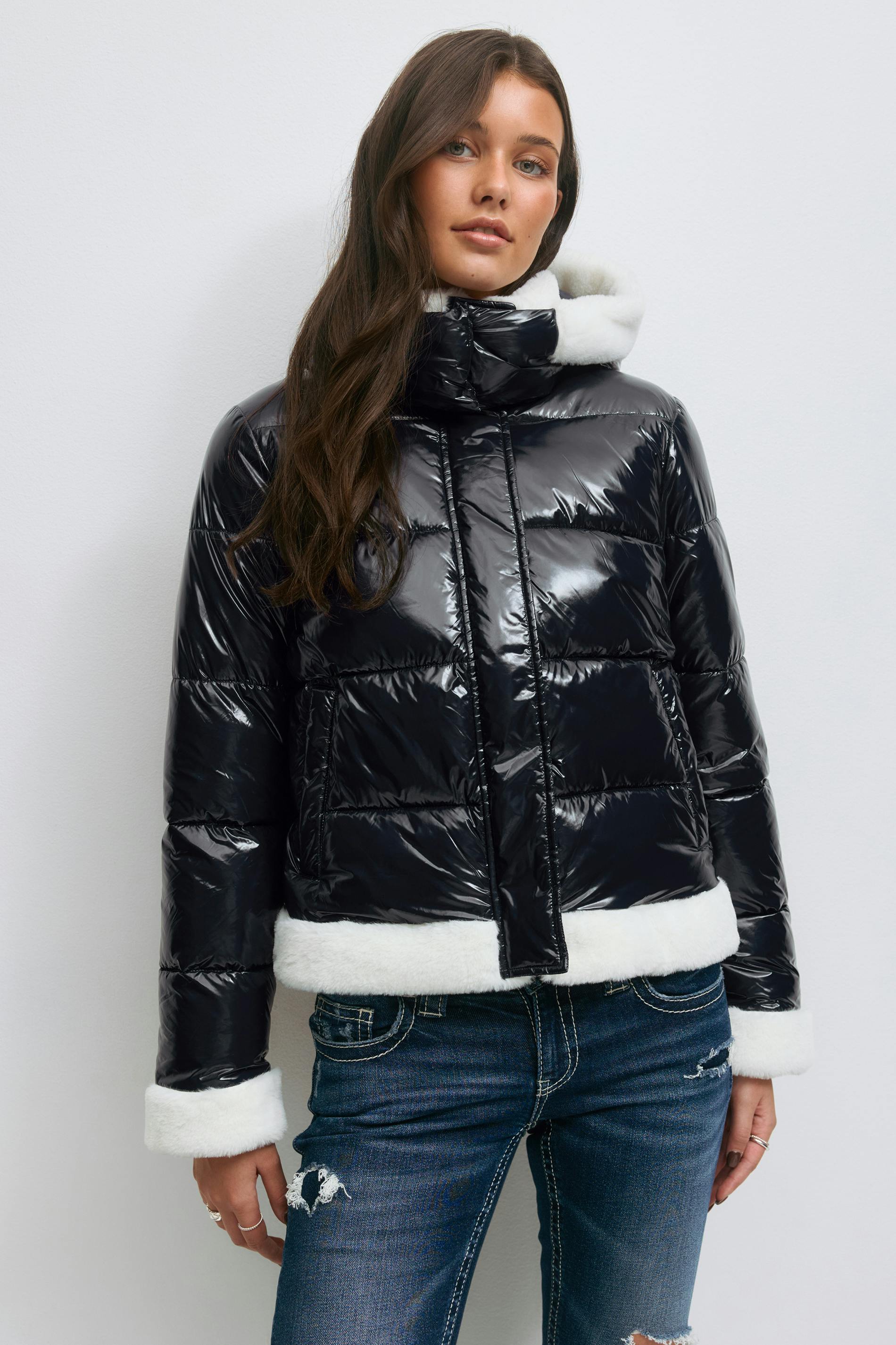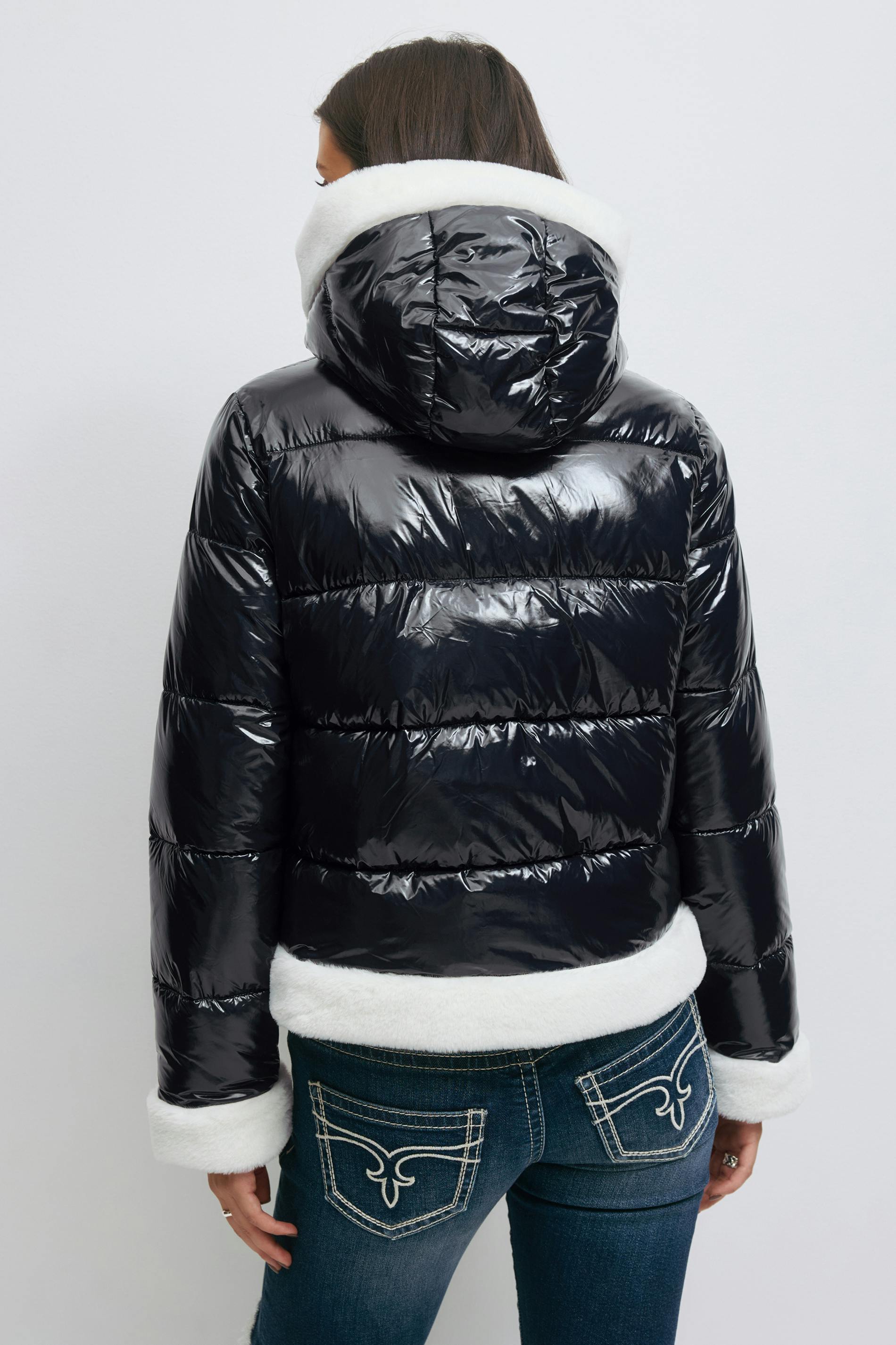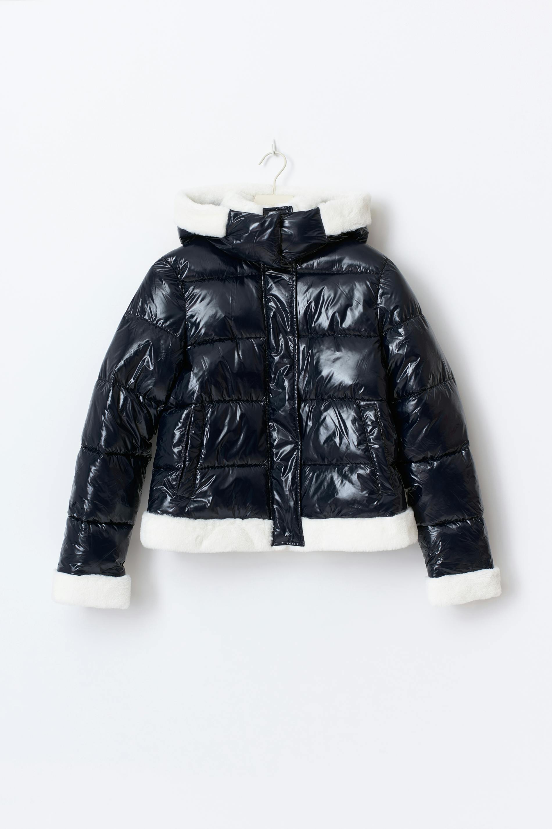 Pufferjacka med huva. Jackan är marinblå och har fickor i sidan. Den har dragkedjestängning med knäppning, fuskpäls i nederkant, vid huvan, på kragen och vid ärmsluten och en normal passform.