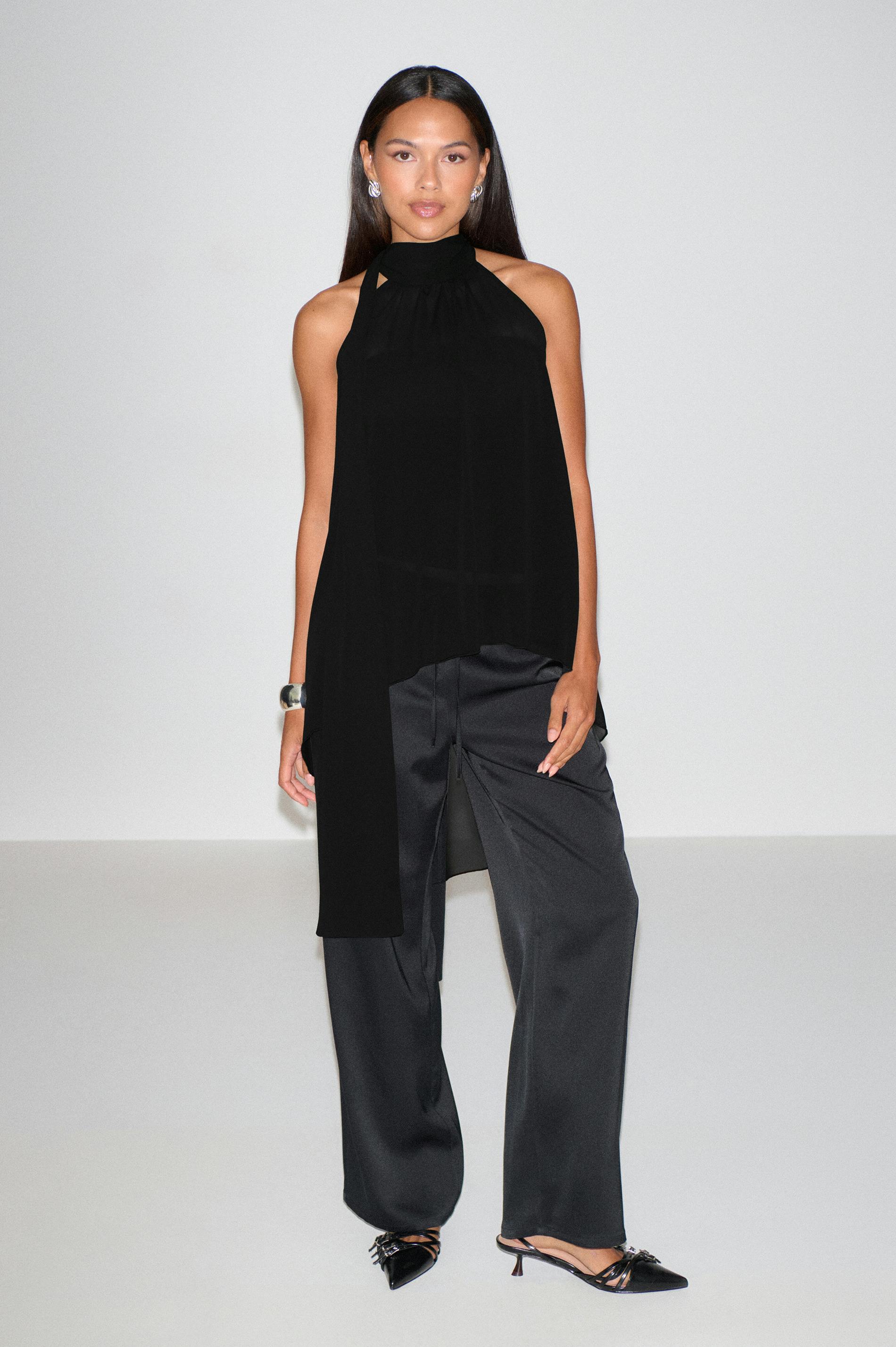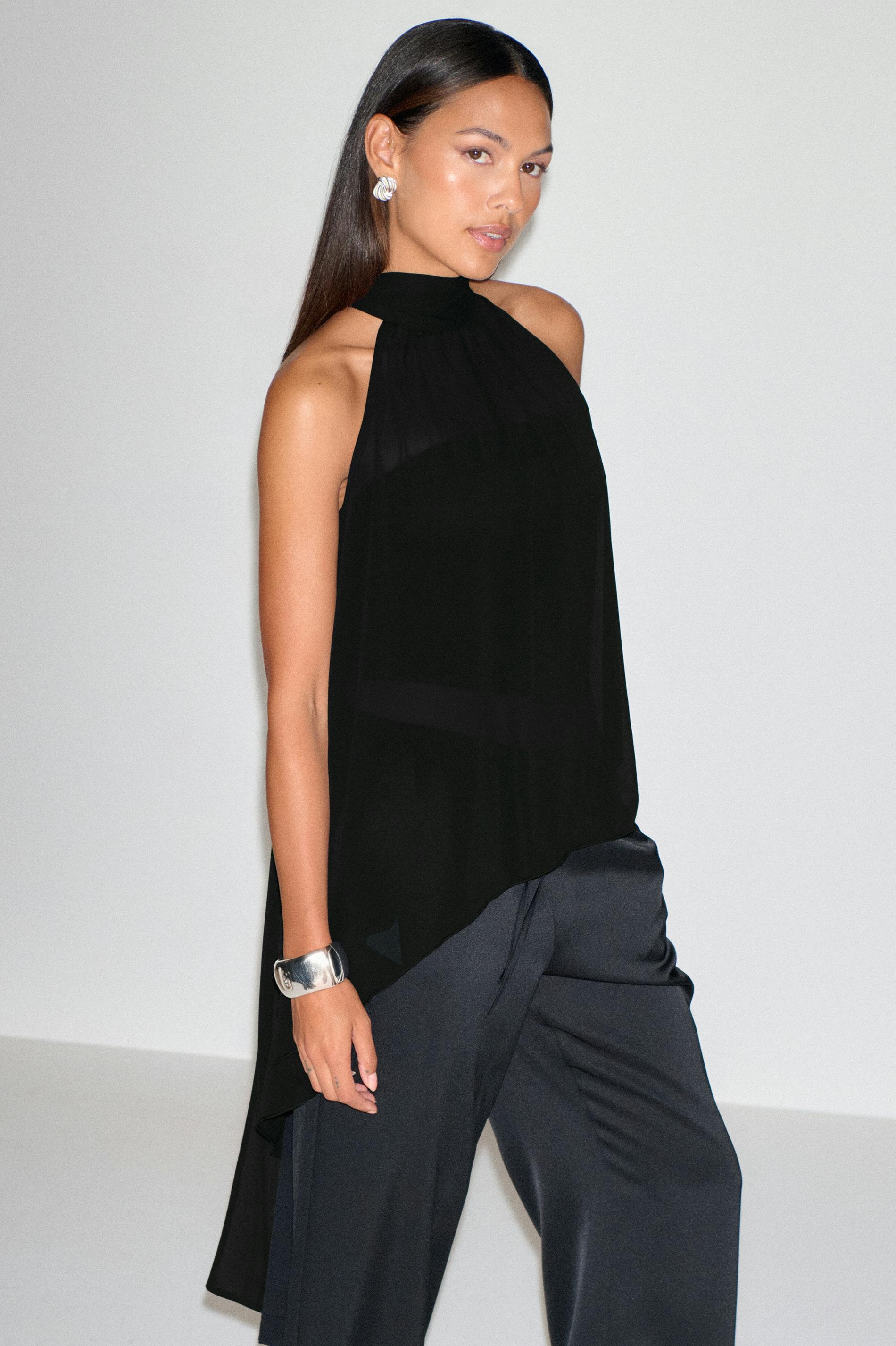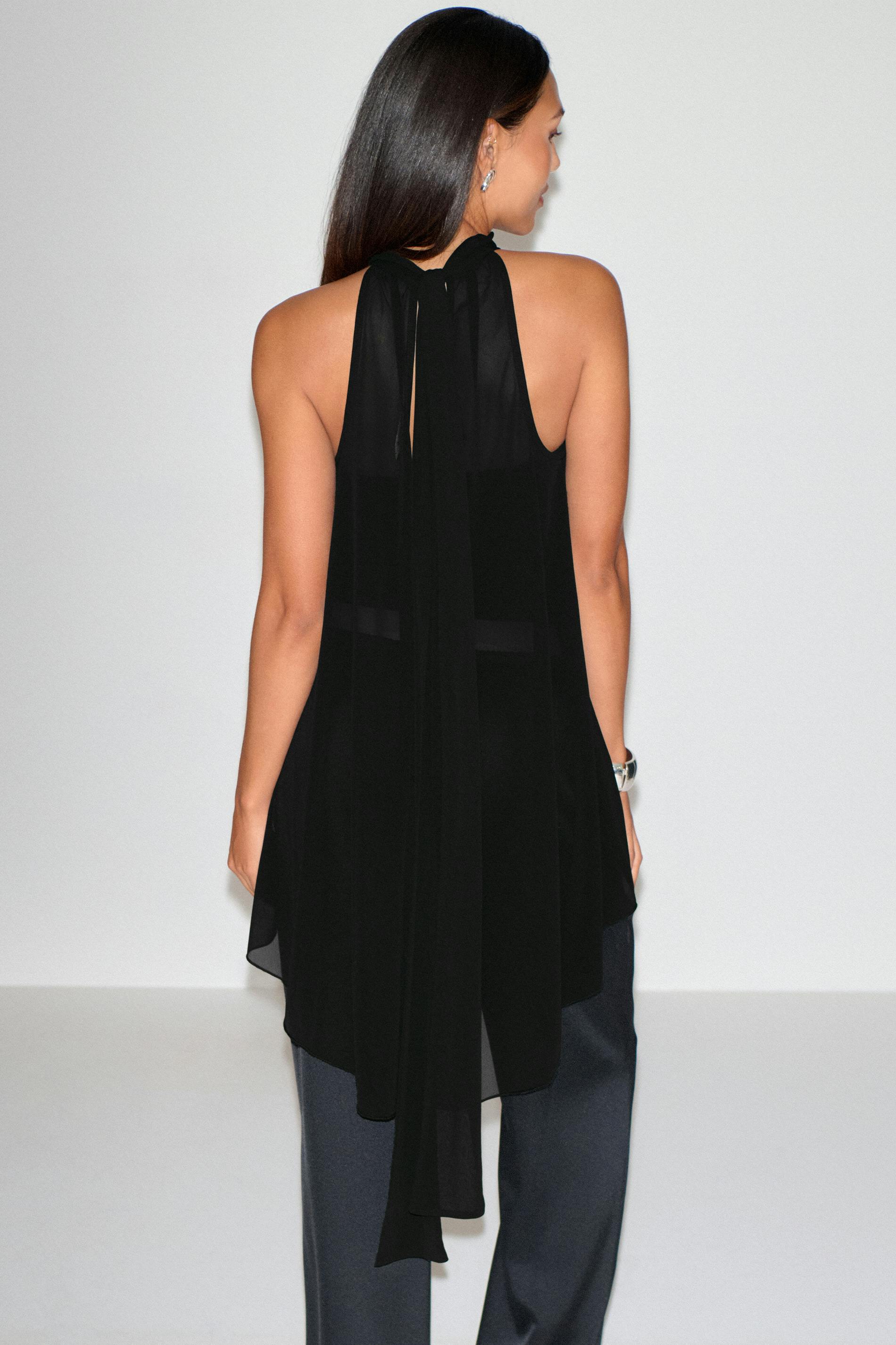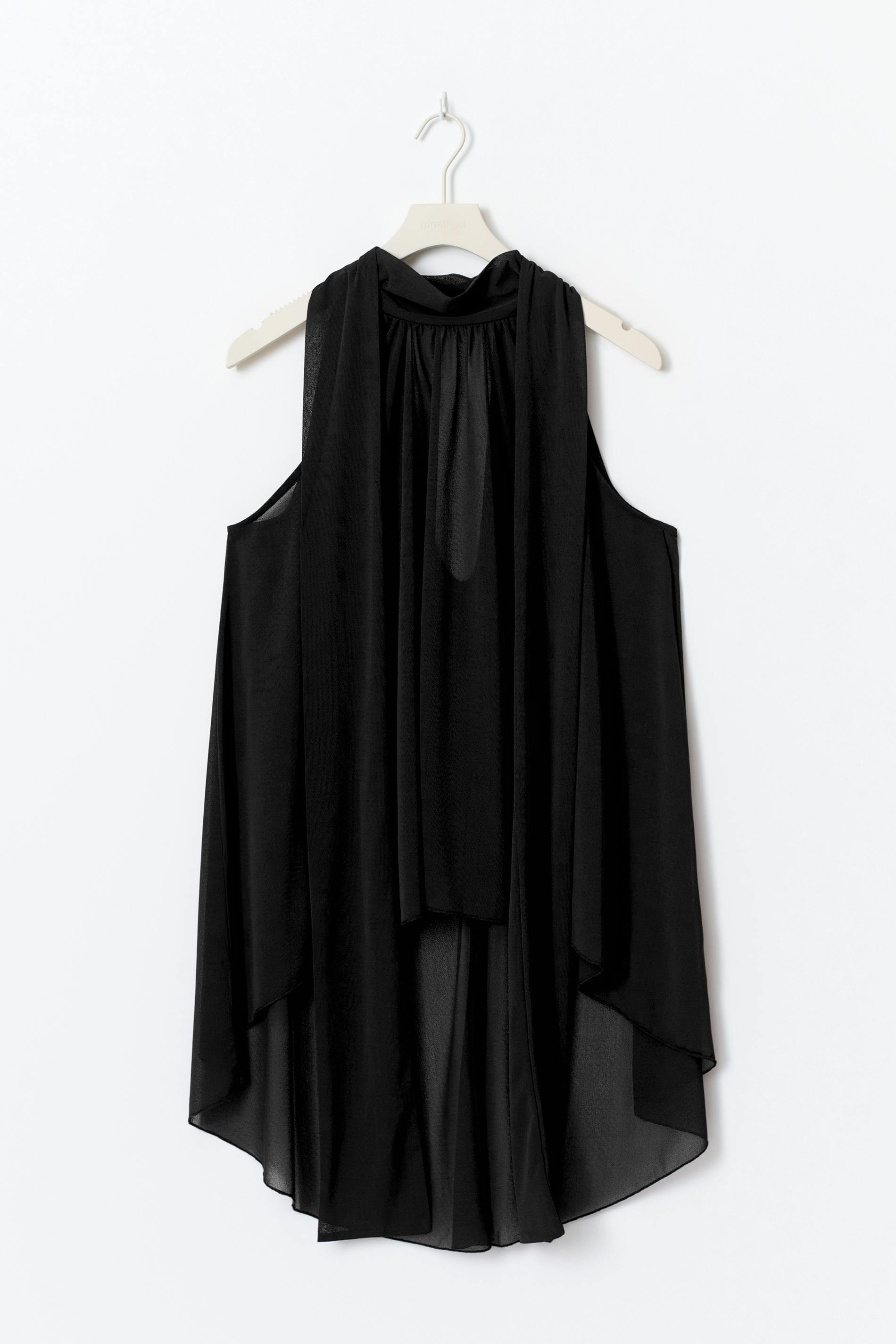 Ärmlös tunika i mesh med en halterneckdesign. Toppen är svart och har en rund hals. Den har en knytning i nacken, en kort design framtill och en lös passform.