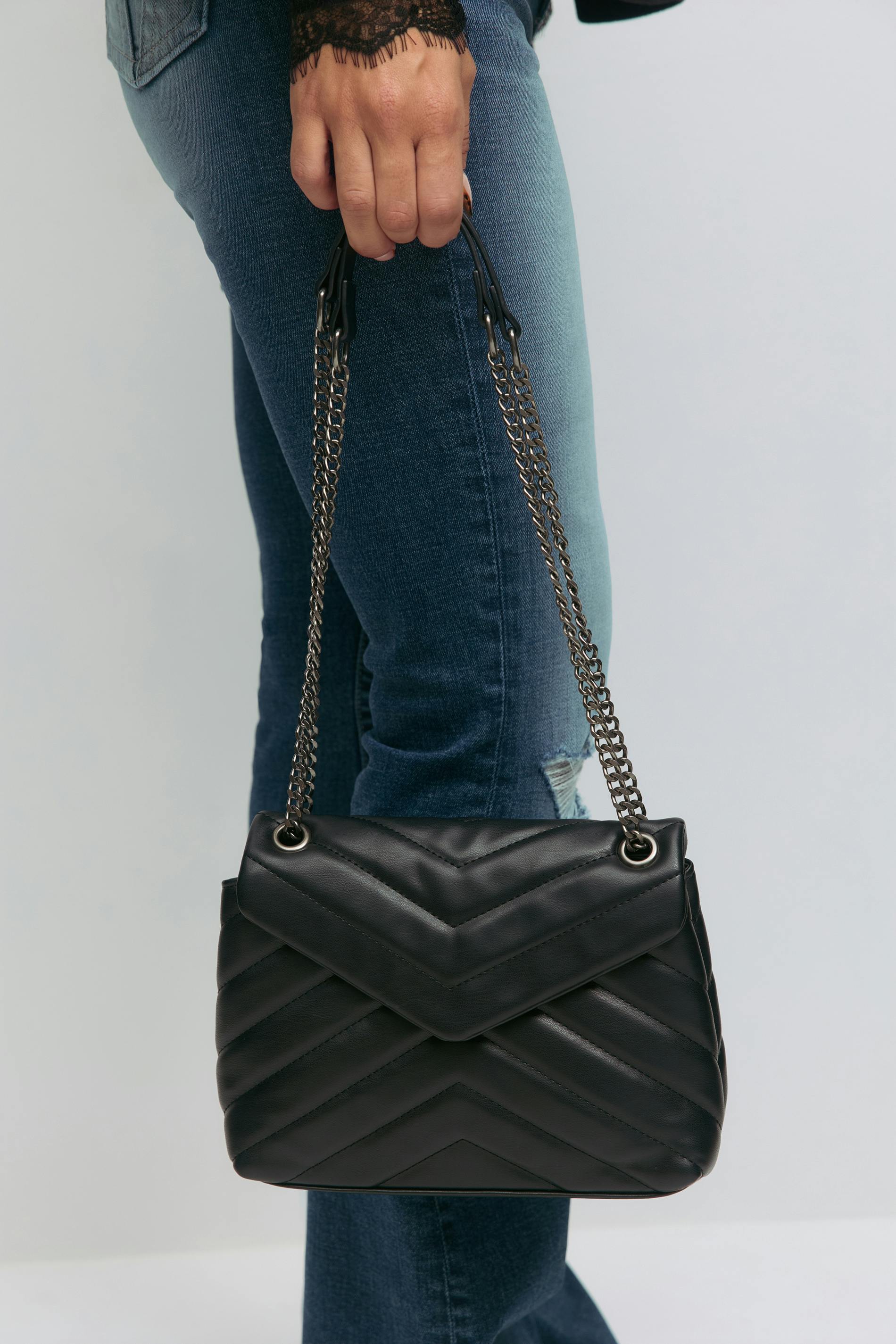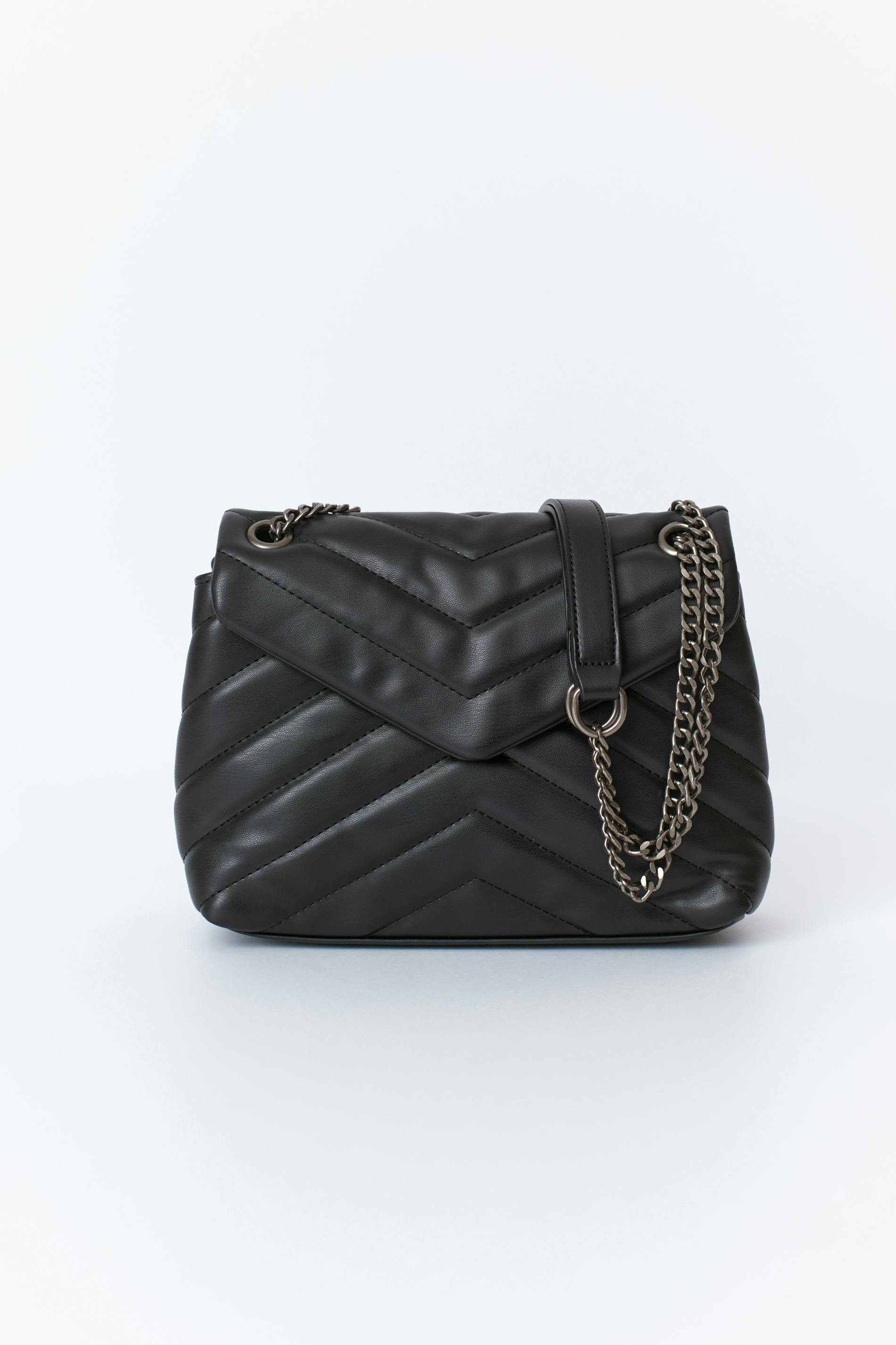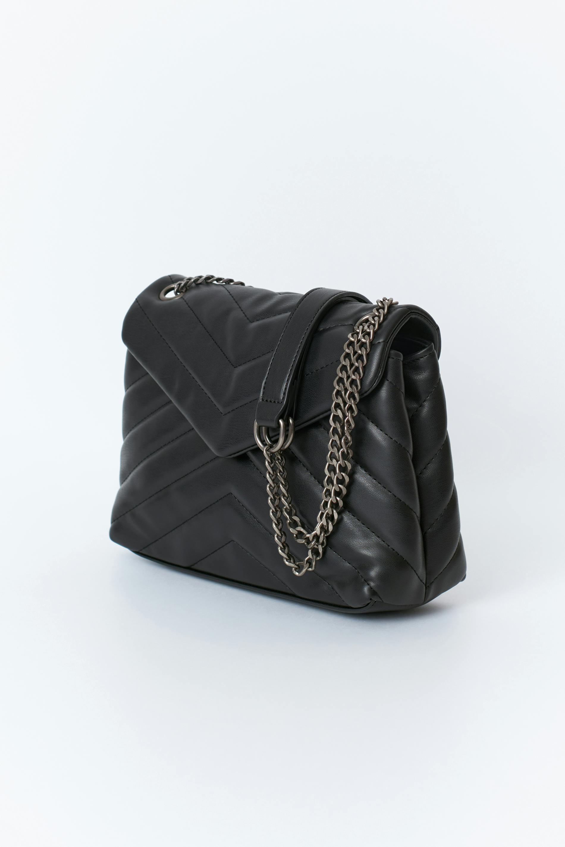 Axelremsväska i skinnimitation med en silverfärgad kejderem. Väskan är svart.