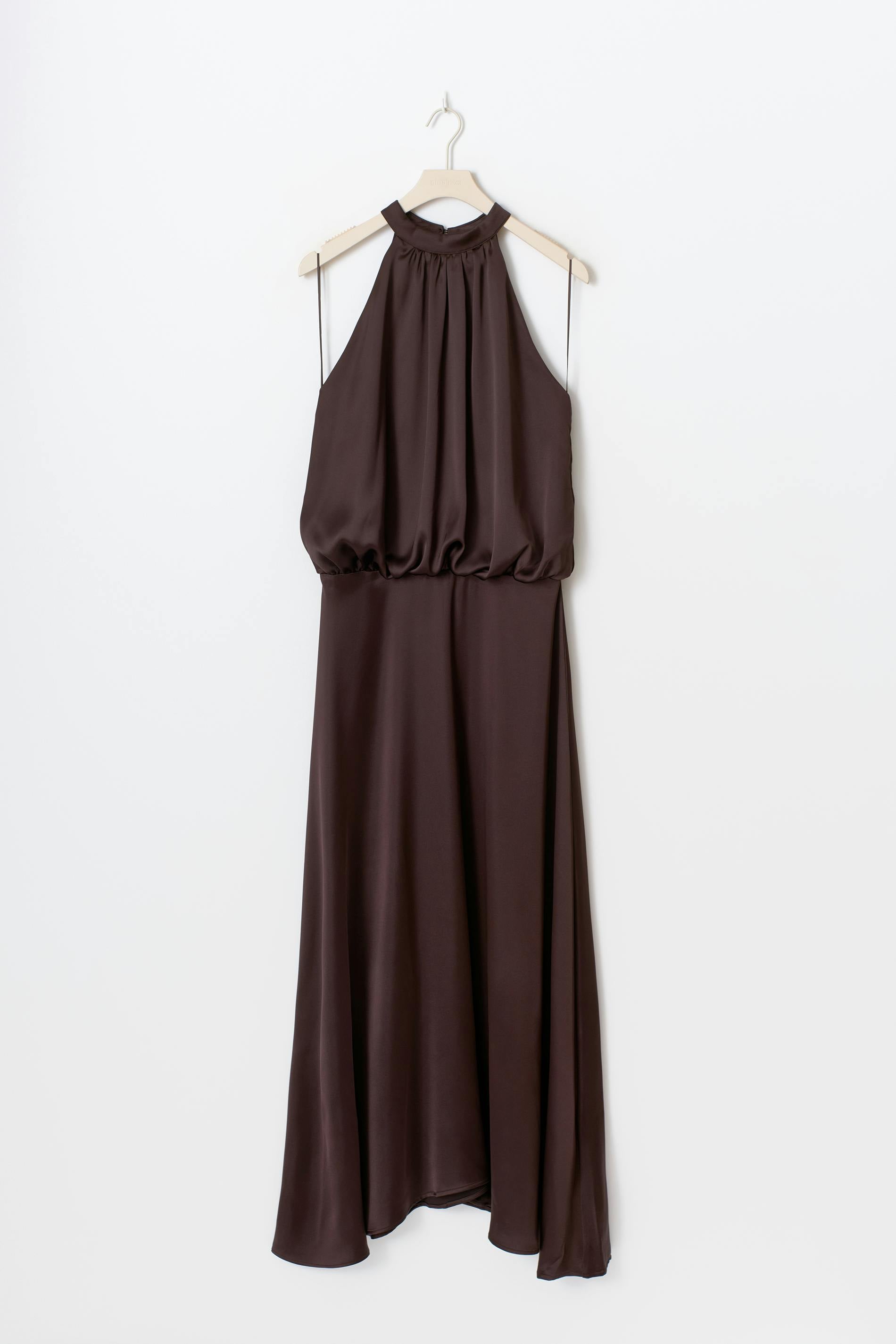 Lång satinklänning med halterneckdesign. Satinklänningen är brun och har glansig kvalitet. Den har ärmlös design, normal passform och knäppning i nacken.