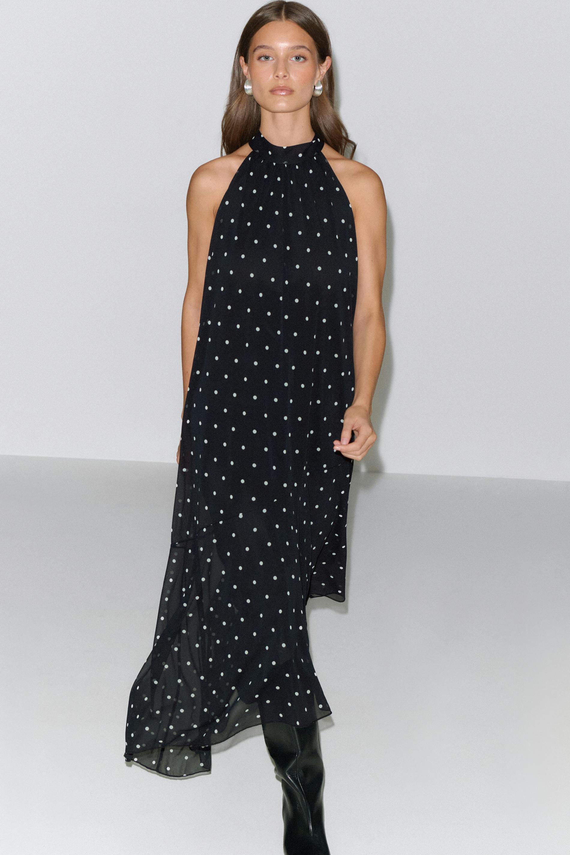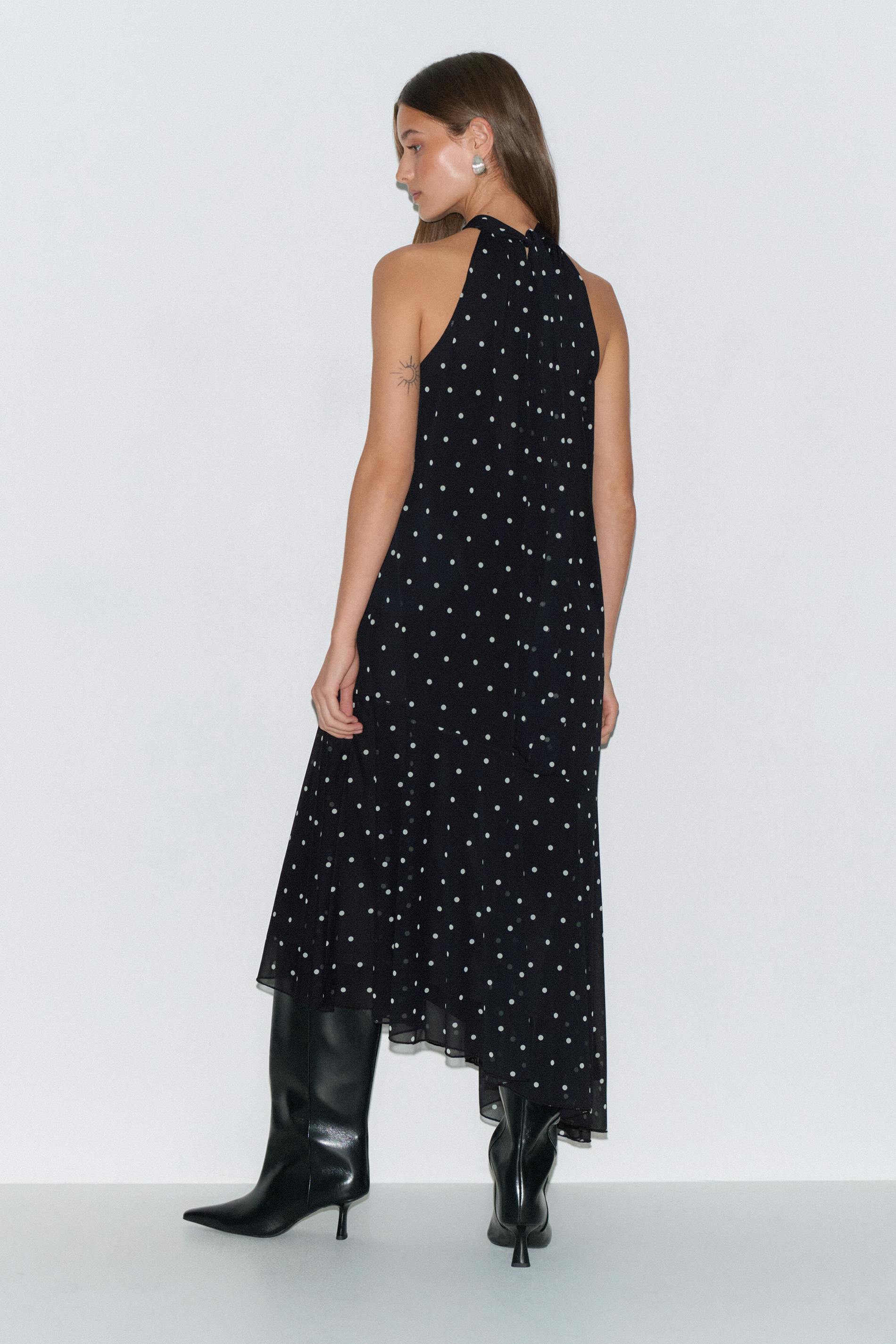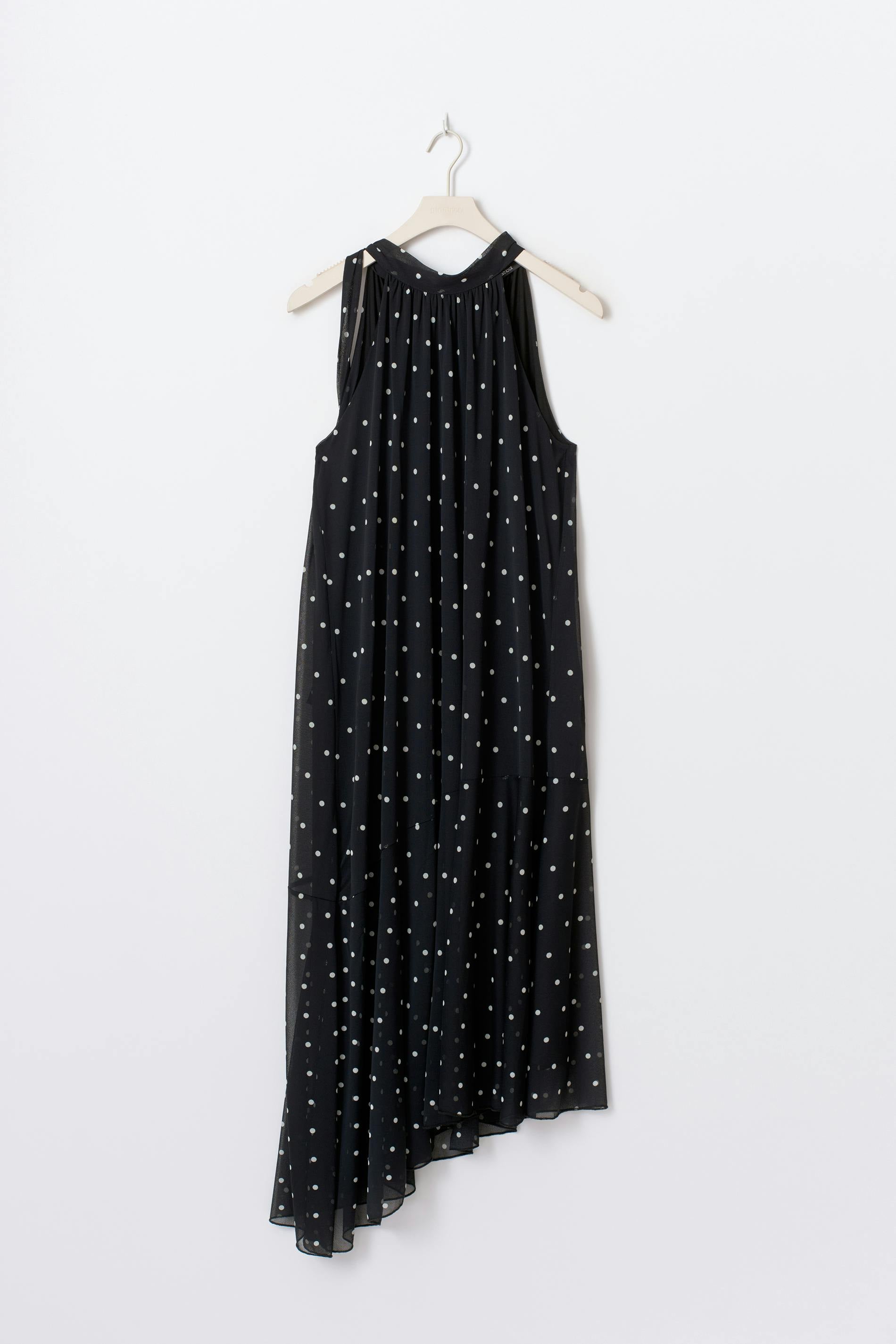 Prickig klänning med lös passform. Klänningen är svart och har asymmetrisk nederkant. Den har halterneckdesign, knytning i nacken, ärmlös design och midilängd.